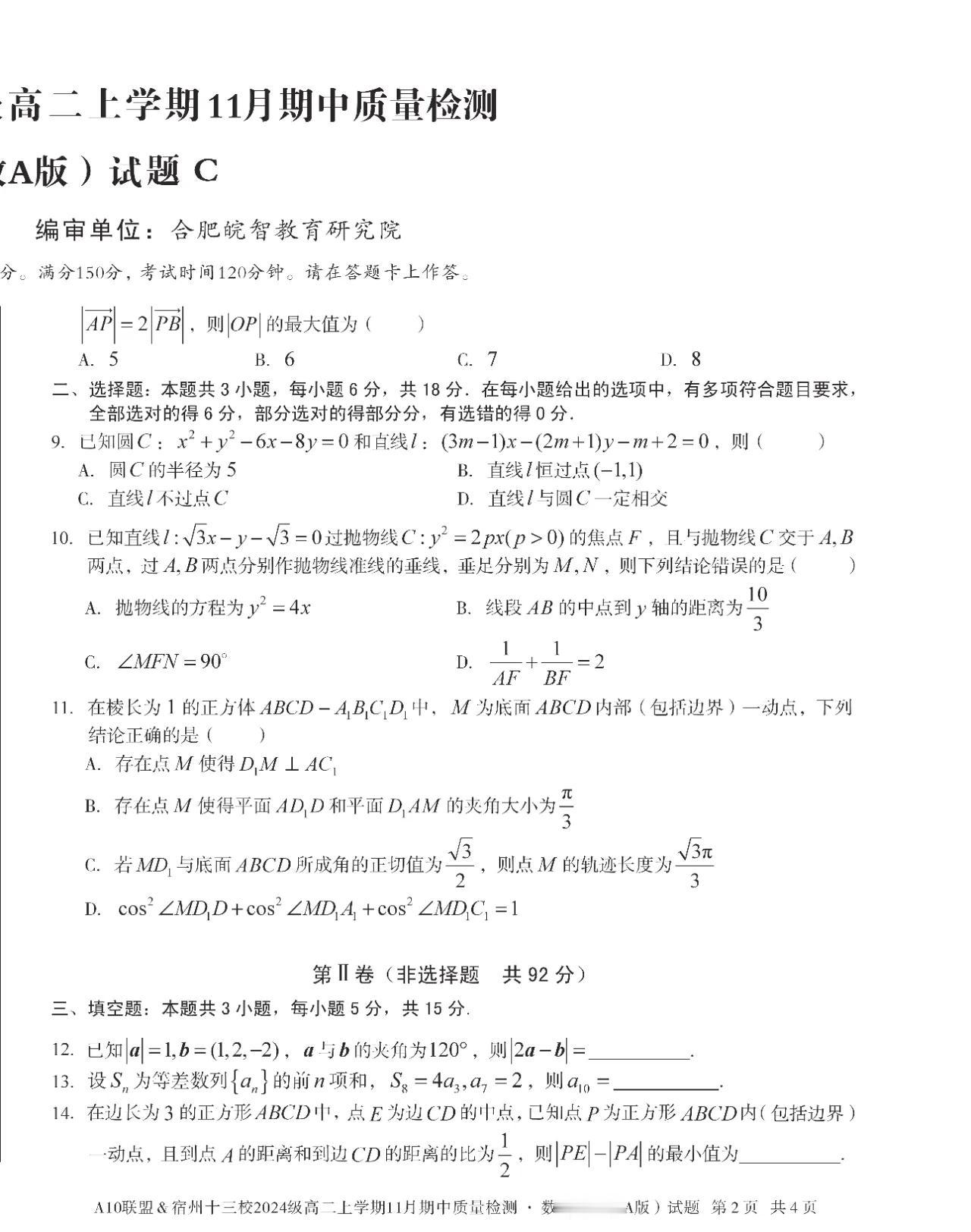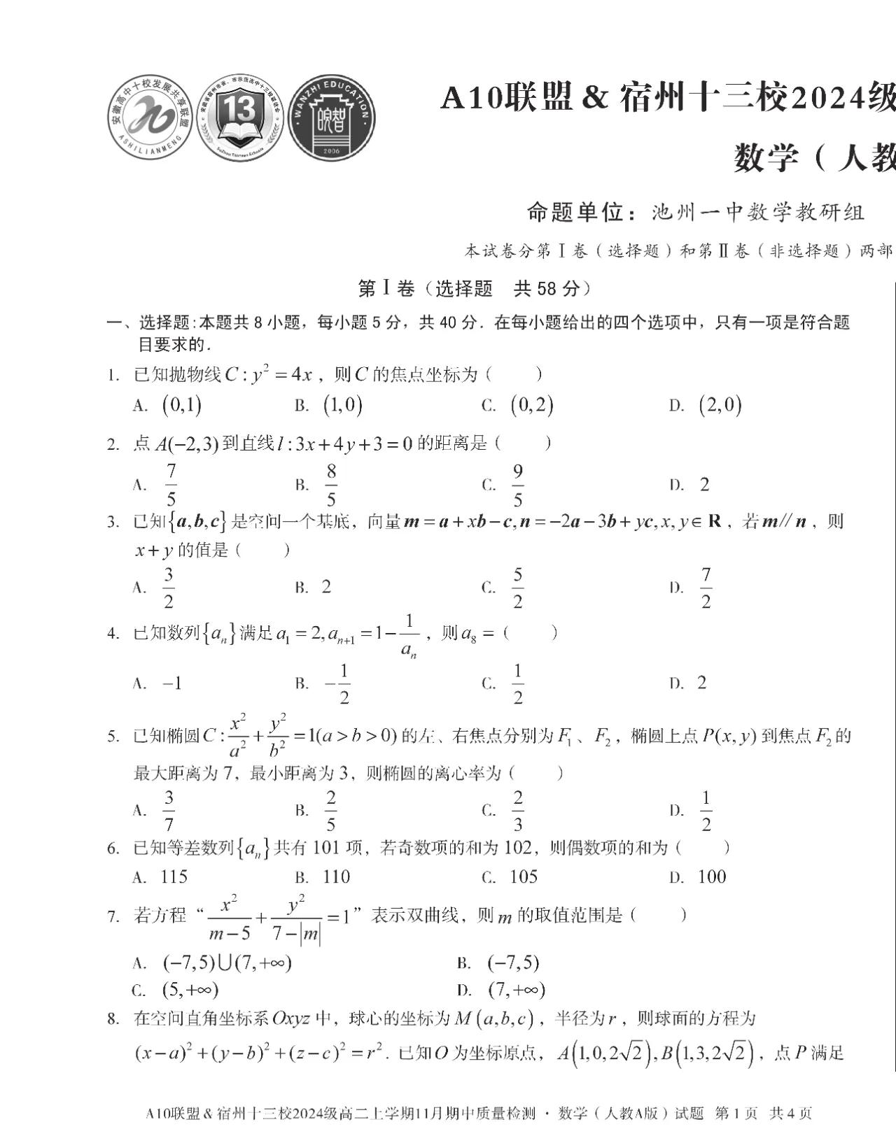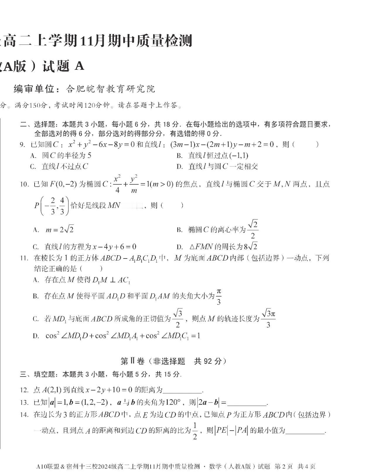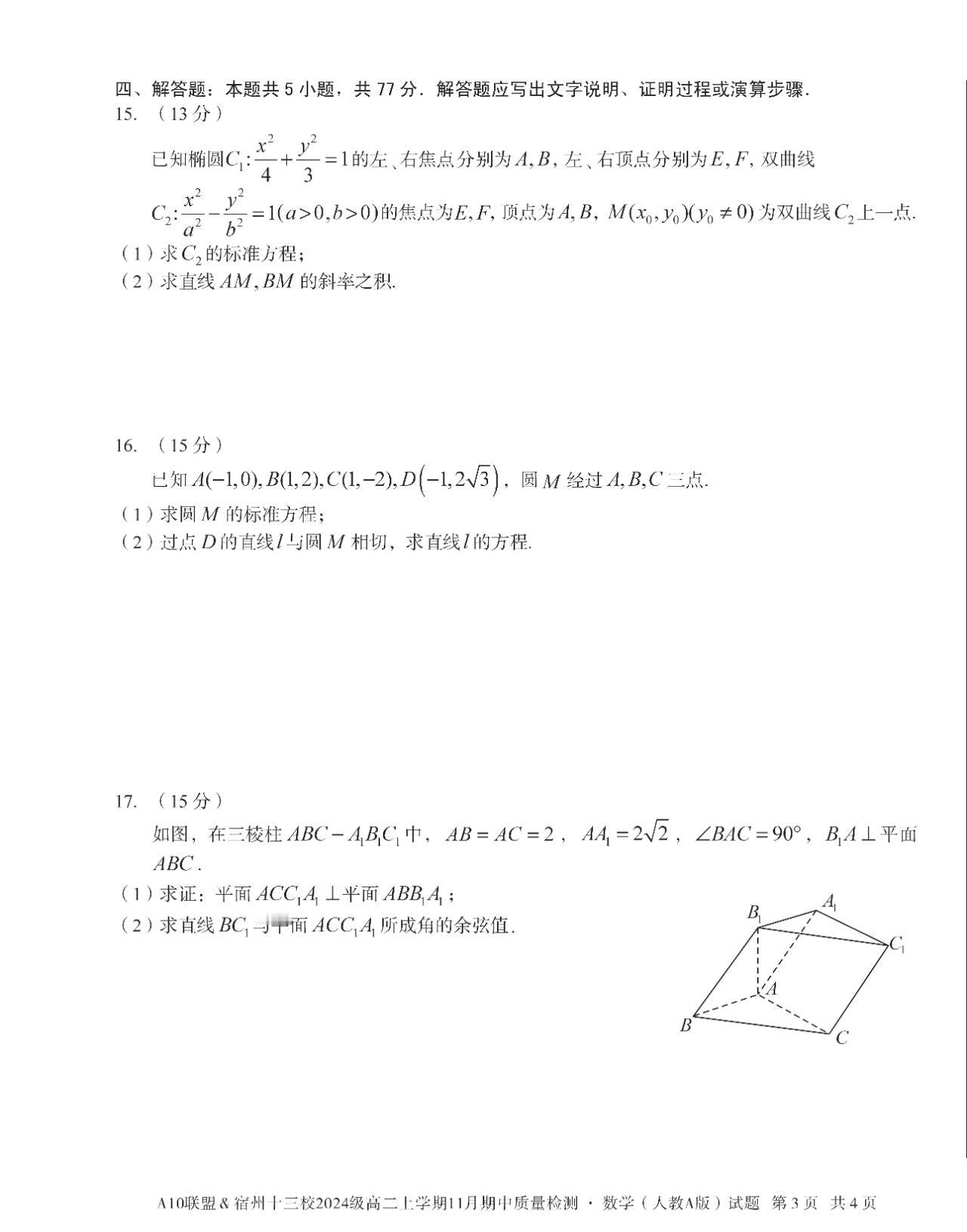 人教A版A、B、C卷和北师大版安徽省宿州高二上数学期中考试详细(单选题多选题填空