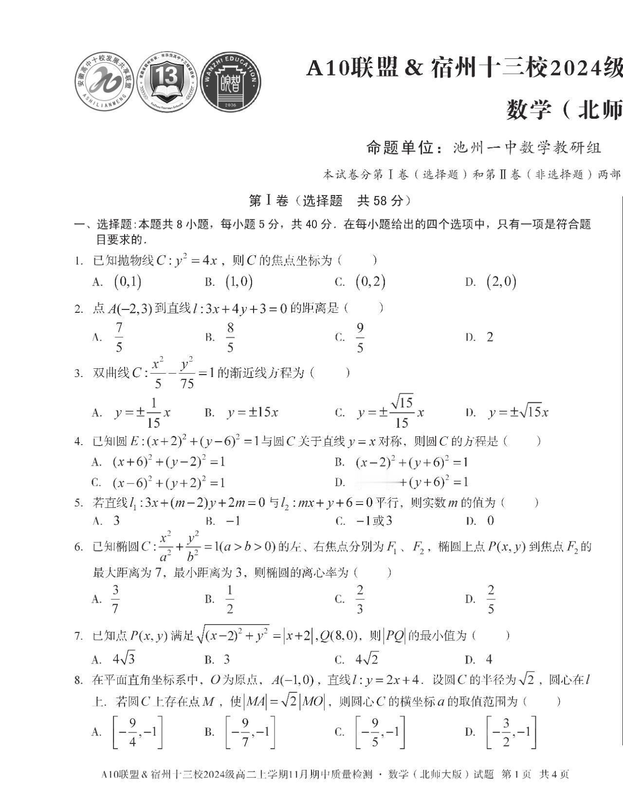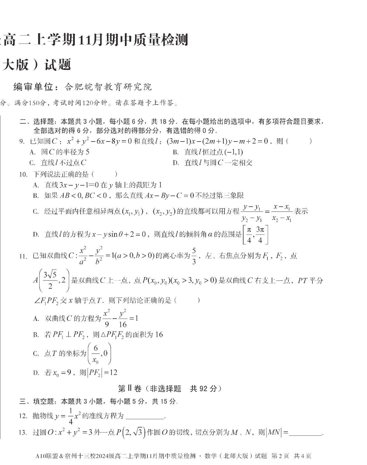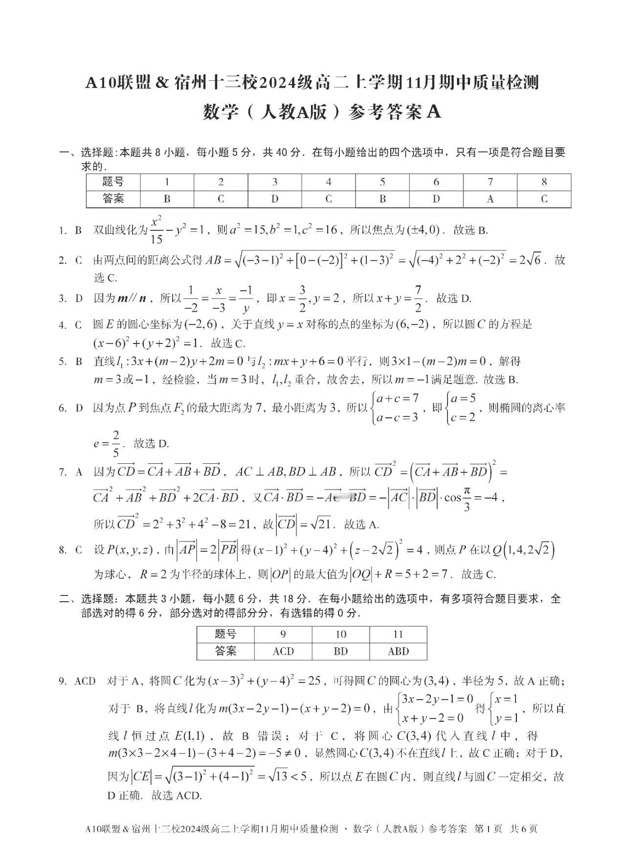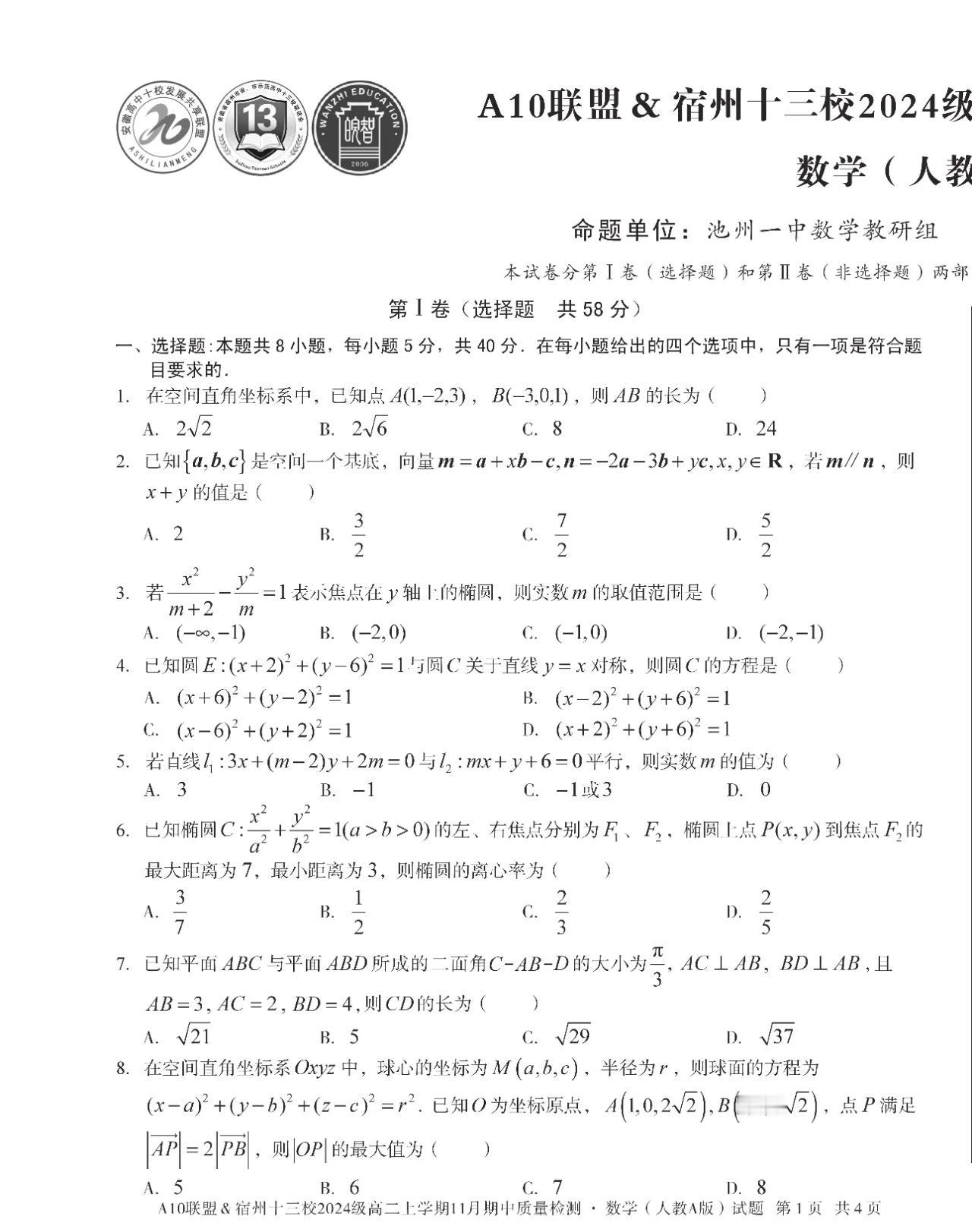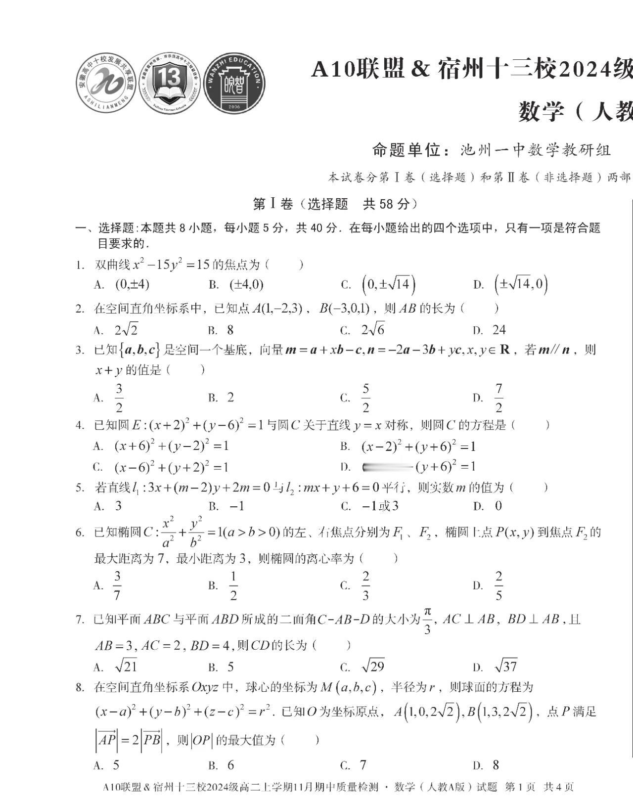 人教A版A、B、C卷和北师大版安徽省宿州高二上数学期中考试题及其详细(单选题多选题填空题)解答1。