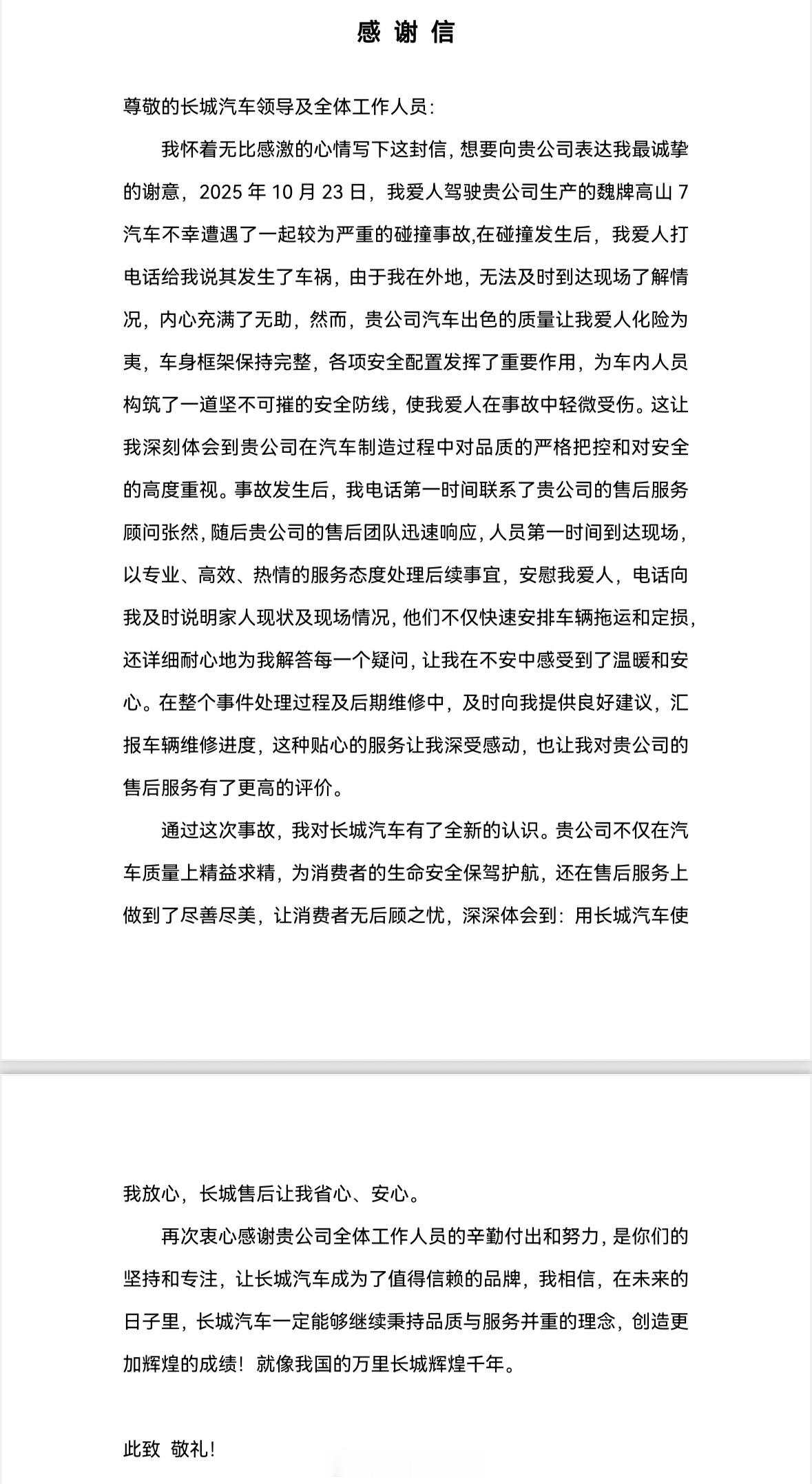 真正好的售后,不是修好一辆车,而是修复一段糟糕的经历最近一封高山7车主的感谢信在车主群里疯传起因是车主本人在外地,车主的妻子独自驾车,不幸出了车祸车主无奈之下,只能打电话求助了WEY牌售后没想到售后迅速响应,第一时间赶到现场安排车主的爱人就医,协调拖车、处理事故、对接保险线上全程和车主汇报事件进度把一次棘手的意外,及时、专业、贴心的妥善处理了现在越来越多的车企冲击高端,但真正的高端除了豪华的配置、热情的售后更重要的是服务要有温度不只是冰冷的流程,而是有温度的用户关系不只是把车修好,而是修复一段糟糕的经历最后,大家遇到过哪些温暖的售后经历吗?欢迎分享…魏牌全新高山7葱哥大视野 最近魏牌