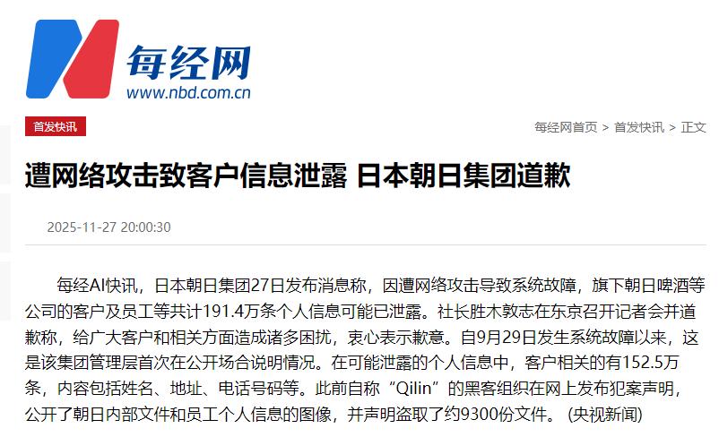 日本知名酿造企业朝日集团信息或遭泄露! 11月27号,日本共同社发布了一条消息,那边的知名啤酒大厂朝日集团,栽在网络攻击上了。旗下朝日啤酒这些子公司的客户、员工信息,足足191万多条,可能全让人给偷走了,这事一出来,日本的打工人和常买朝日的人,全都慌了神。 别以为朝日是啥小打小闹的厂子,在日本街头随便买瓶啤酒、拿瓶果汁,十有八九都是它家的。就是这么个一年营收上千亿的大巨头,现在连最基本的信息安全都没守住。集团老总胜木敦志特意开了记者会,鞠躬道歉说“给大家添了大麻烦”,这还是系统出问题后,管理层头一回公开认错。 有意思的是,这事早有苗头,不是突然爆出来的。早在9月29号,朝日的系统就出毛病了,当时没说清咋回事,直到10月7号,一个叫“Qilin”的黑客组织在暗网放话,说已经偷走了朝日的财务资料和员工信息,这才把“网络攻击”的底给揭开。这一个多月里,朝日的工厂停过产,啤酒饮料接不了单、出不了货,整个日本的食品供应链都跟着乱了套。 大家伙最揪心的是,这191万条信息里到底有啥?虽然朝日没细说,但按这类事儿的惯例,客户的姓名、电话、住址、买过啥东西,肯定跑不了;员工的身份证号、工资多少、家里的情况,也可能在里面。 这些信息要是落到黑产手里,精准诈骗、烦人的营销电话马上就找上门。就像检察院的数据说的,现在骗子都靠泄露的信息画“用户画像”,骗局一骗一个准,钱被骗走的风险蹭蹭涨。 更让人闹心的是,朝日这事不是独一份,最近日本不少大企业都被网络攻击折腾得头大。10月份的时候,卖办公用品的巨头Askul也被“勒索软件”盯上了,订单接不了、货也出不去,到现在生意都没完全缓过来。这其实暴露了日本企业的通病,网络安全这块太马虎,总觉得“我们是大企业,没人敢惹”,真出事了才追悔莫及。 有人可能会问,黑客偷这些信息图啥?答案特直接:赚钱。现在黑产里,个人信息都是明码标价的“货”,从收集、倒卖到用来诈骗,一套流程全得很。暗网里都用虚拟币结账,想查都难。朝日这种大企业的信息更值钱,客户花钱能力强,员工信息也全,黑产贩子一转手就能卖个好价钱。 目前朝日就说会联系受影响的人,也会加强系统防护,可具体咋赔偿、后续咋保障,连句准话都没有。不过这事倒给所有人提了个醒:不管在哪个国家,个人信息都得自己上点心。平时别在乱七八糟的平台填信息,真碰到企业信息泄露,赶紧改密码、关权限,接到可疑电话马上挂,别给骗子可乘之机。 说到底,企业赚着消费者的钱,就得把信息保护的责任扛起来。像朝日这样把191万人的信息安全当儿戏,光鞠躬道歉可不够,真金白银的赔偿和实打实的整改,才是赢回信任的关键。毕竟现在是数字时代,信息安全就是企业的命根子,马虎大意的代价,绝不是一次道歉就能抹平的。