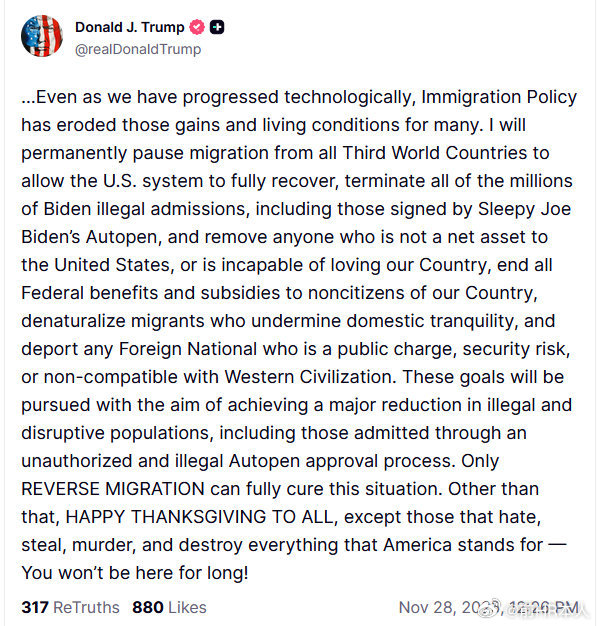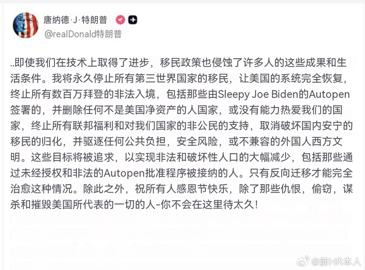 美国总统特朗普:将永久停止所有第三世界国家的移民!取消对非公民的福利。特朗普这是出大招啊,一些润人辛辛苦苦到美国,要是被送回来,那不是气死了他说:即使我们在技术上取得了进步,移民政策也侵蚀了许多人的这些成果和生活条件。我将永久停止所有第三世界国家的移民,让美国的系统完全恢复,终止所有数百万移民的非法入境,包括那些由瞌睡乔自动笔签署允许入境的。并删除任何不是美国净资产的人,或没有能力热爱我们的人,终止所有联邦福利和对我们国家的非公民的支持,取消破坏国内安宁的移民的归化。并驱逐任何导致公共负担,安全风险,或不兼容的外国人。这些目标将以实现非法和破坏性人口的大幅减少,包括那些通过未经授权和非法的自动笔批准程序被接纳的人。只有反向迁移才能完全治愈这种情况。除此之外,祝所有人感恩节快乐,除了那些仇恨,偷窃,谋杀和摧毁美国所代表的一切的人-你不会在这里待太久!