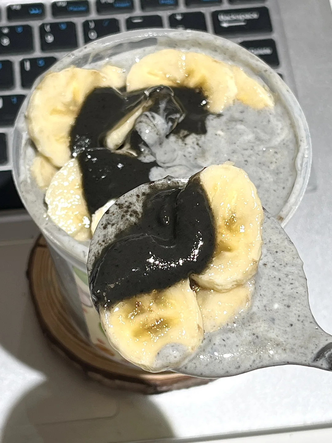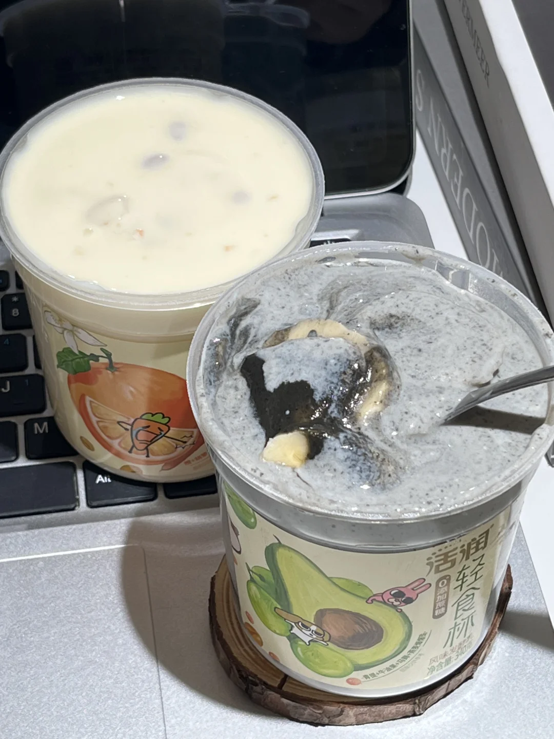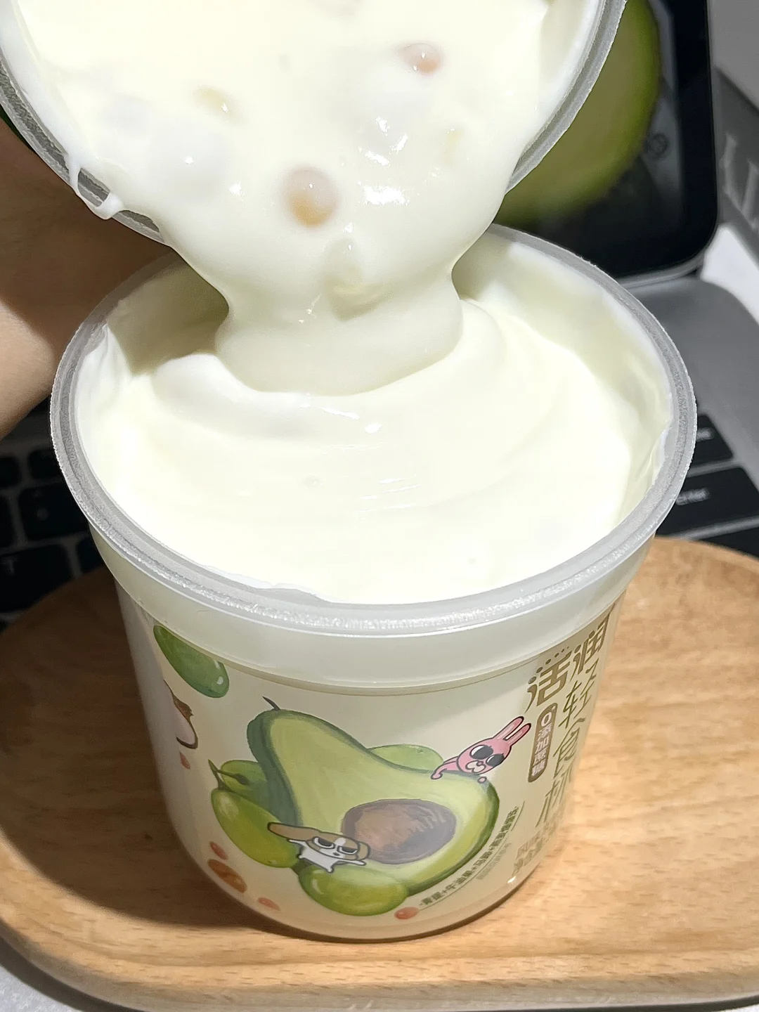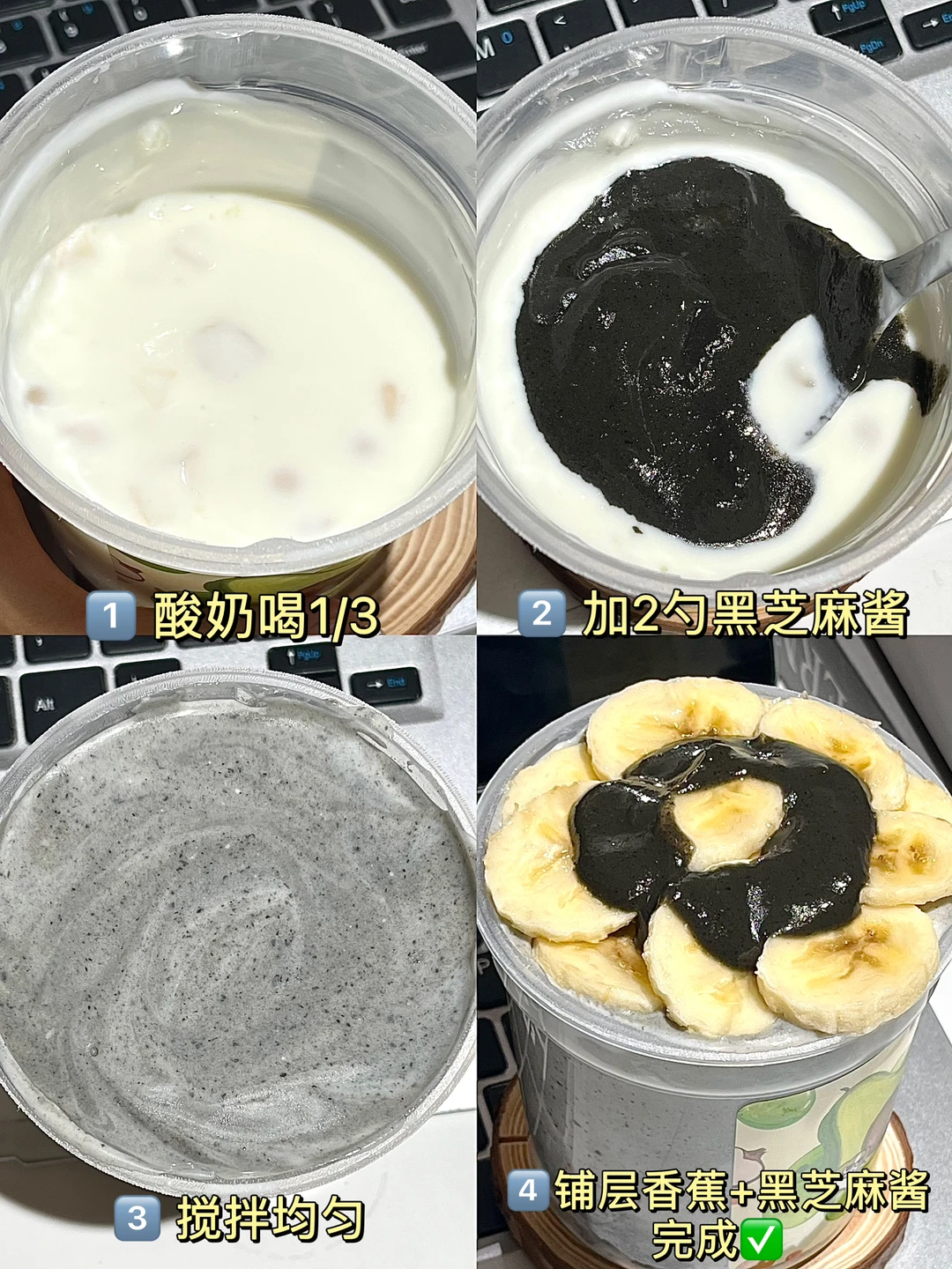 香蕉➕酸奶➕黑芝麻酱!吃的时候放冰箱冰一会,就变成我今年最爱的酸奶我没开玩笑[捂脸R][捂脸R] 扎实软糯又香甜,就像吃小甜品超级解馋!我妈喜欢吃热的(酸奶加热我不能理解哈哈)但很暖胃 用的酸奶是自带水果果肉的,口感挺丰富的,0蔗糖就是浓稠那挂的,味道是牛油果的,还有胡萝卜橙子味和青提茉莉味,总之这样真的好好吃,我以后都这么吃!!