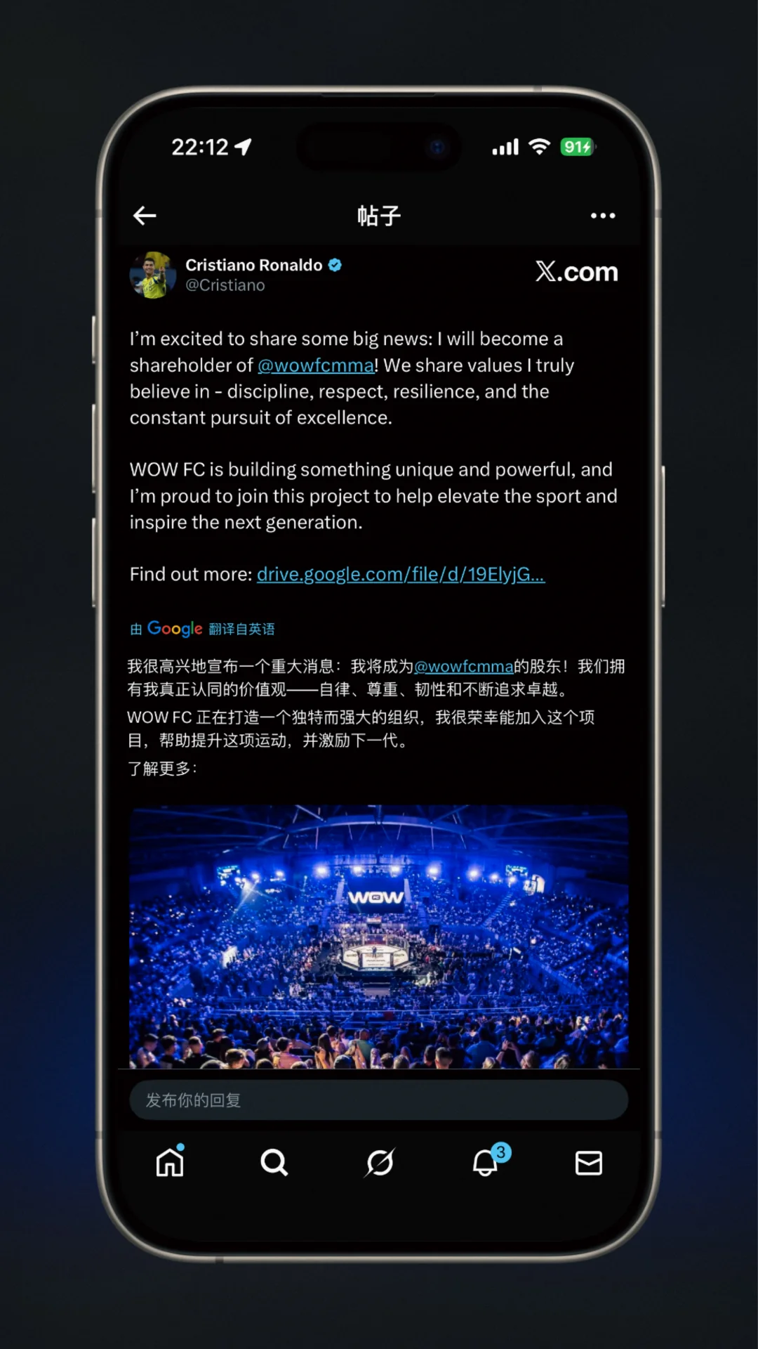 🛑 C罗推特发文正式入股MMA,WOWfc综合格斗赛事推广公司