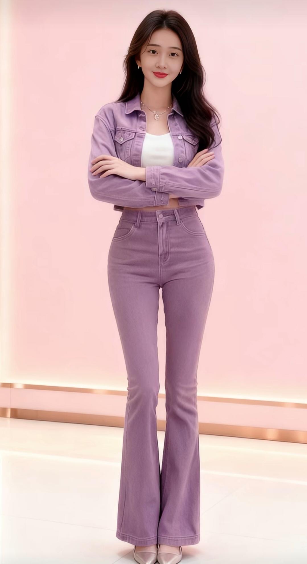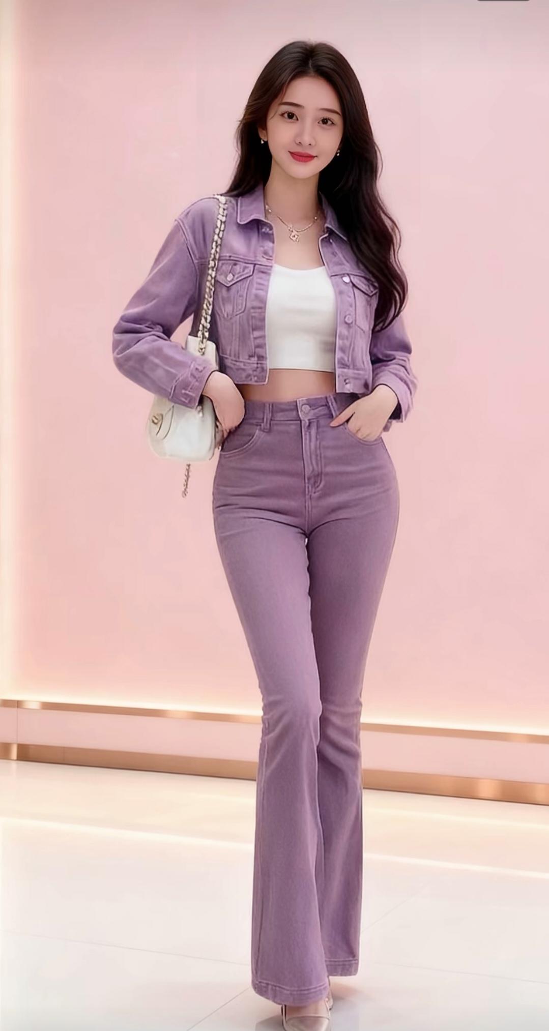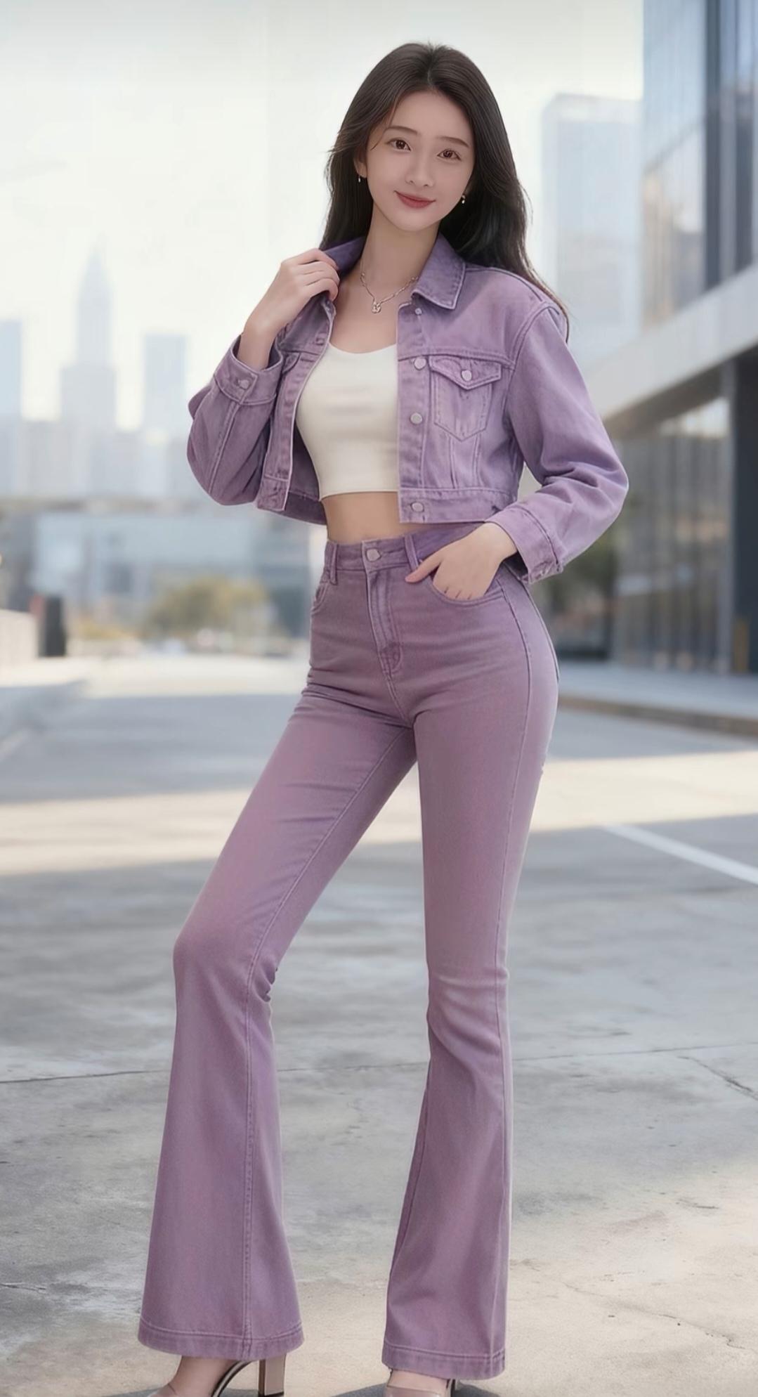 紫色牛仔套装,搭配白色上衣,轻松打造都市时尚感!