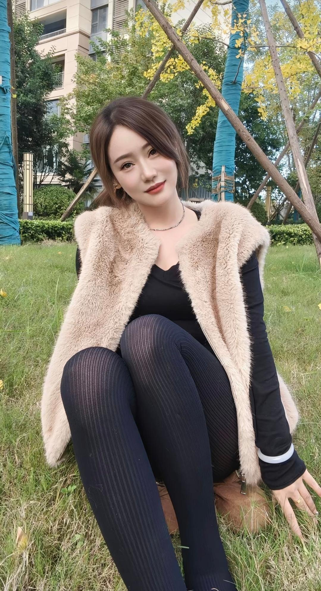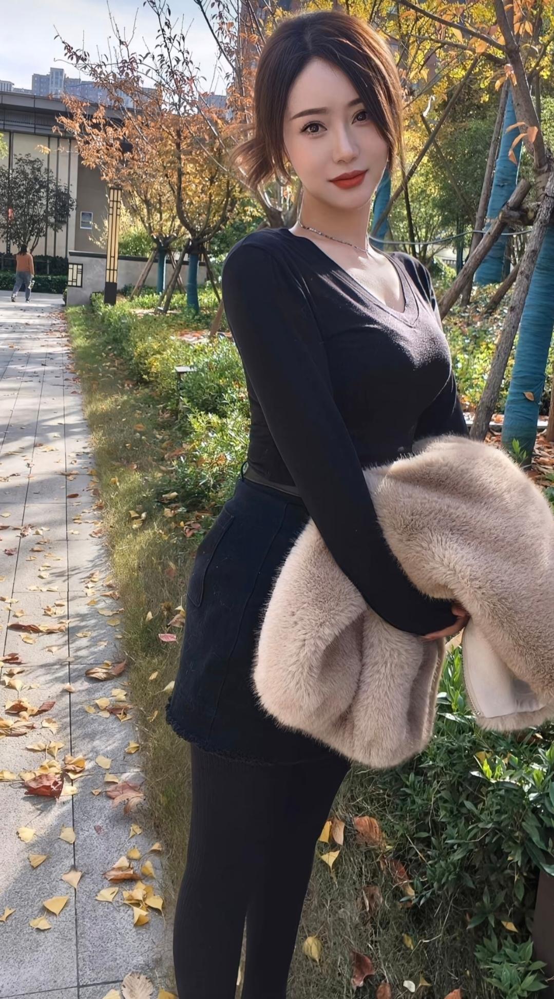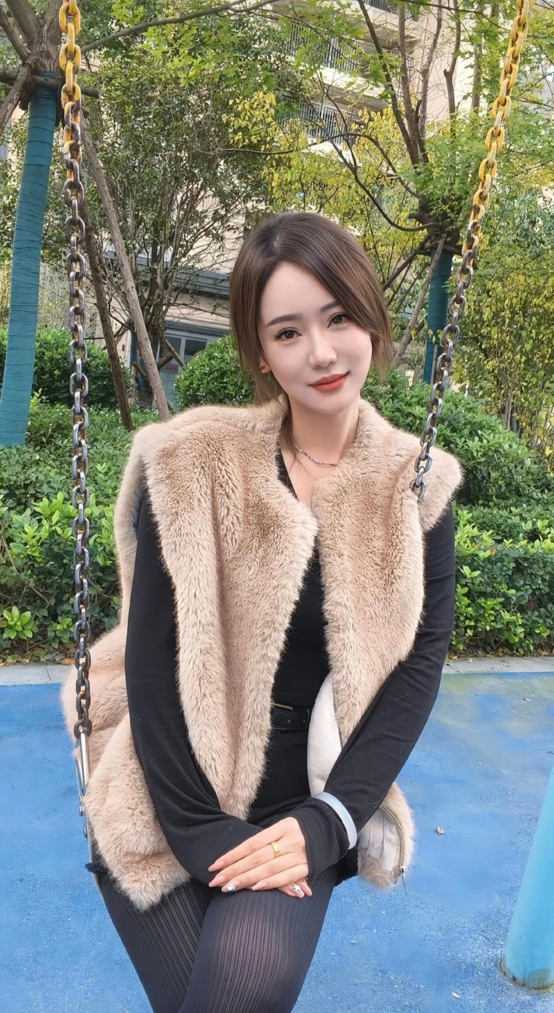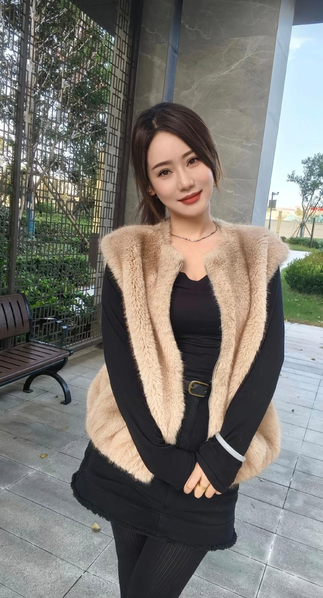 这姑娘穿着皮草外套,站在车前摆姿势。