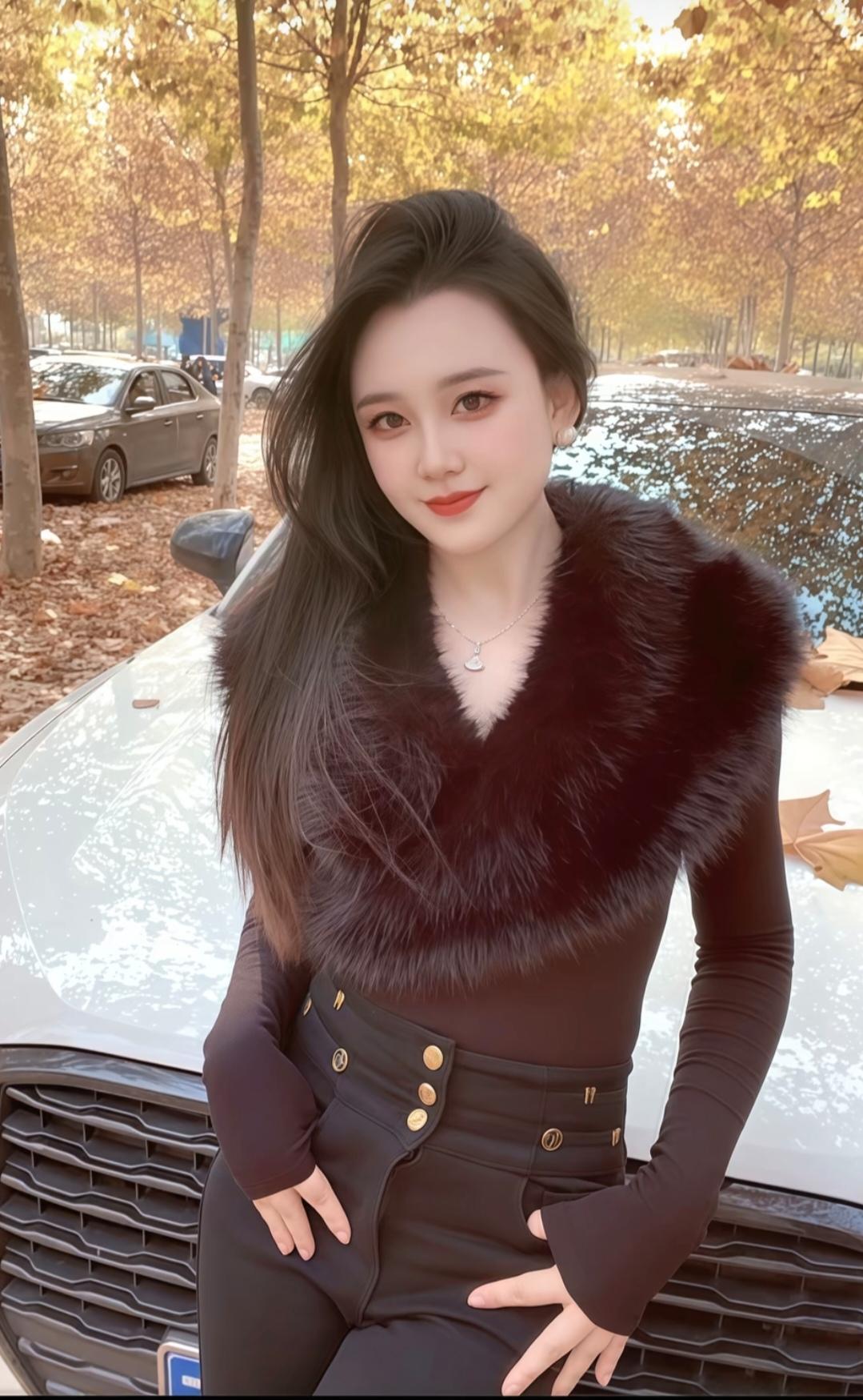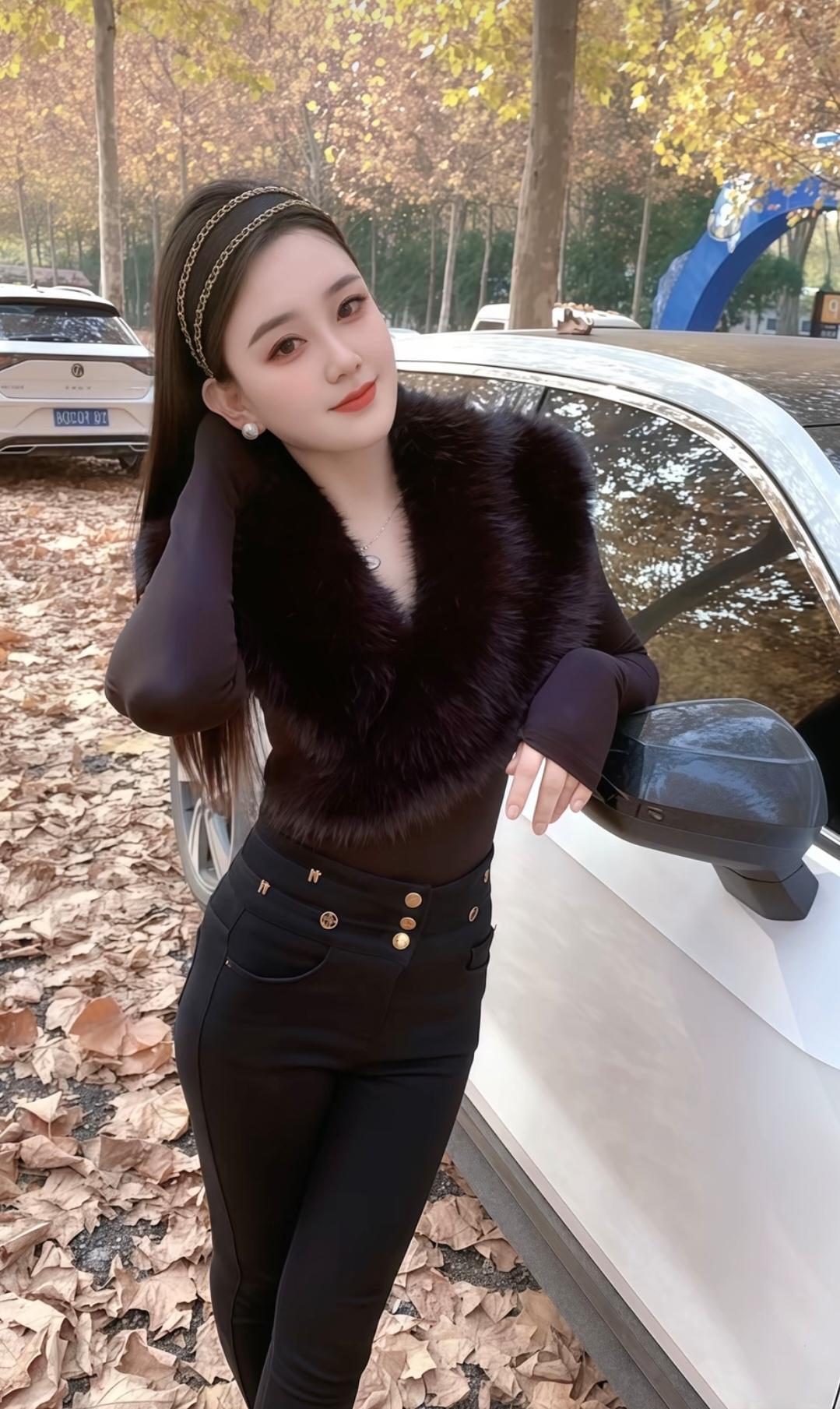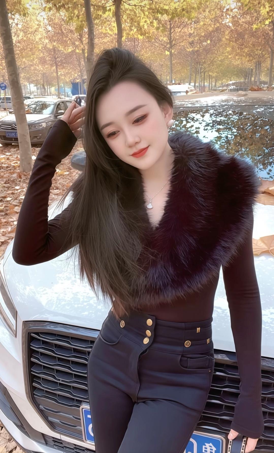 这姑娘穿着皮草外套,站在车前摆姿势。