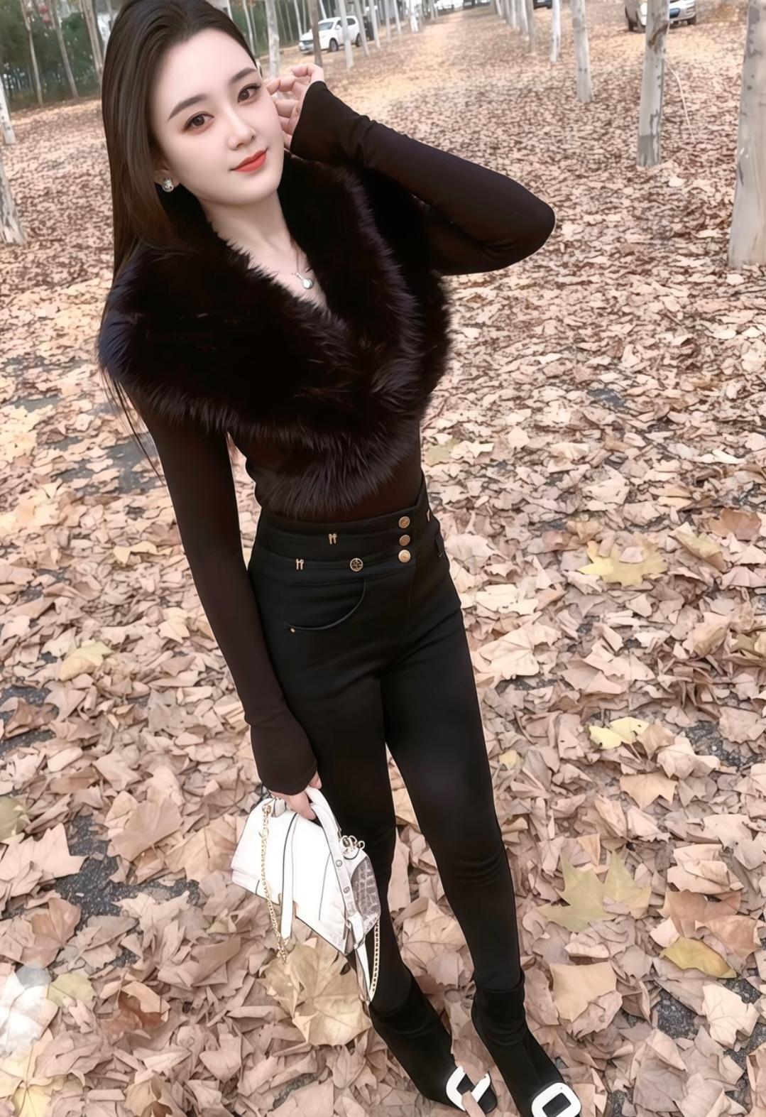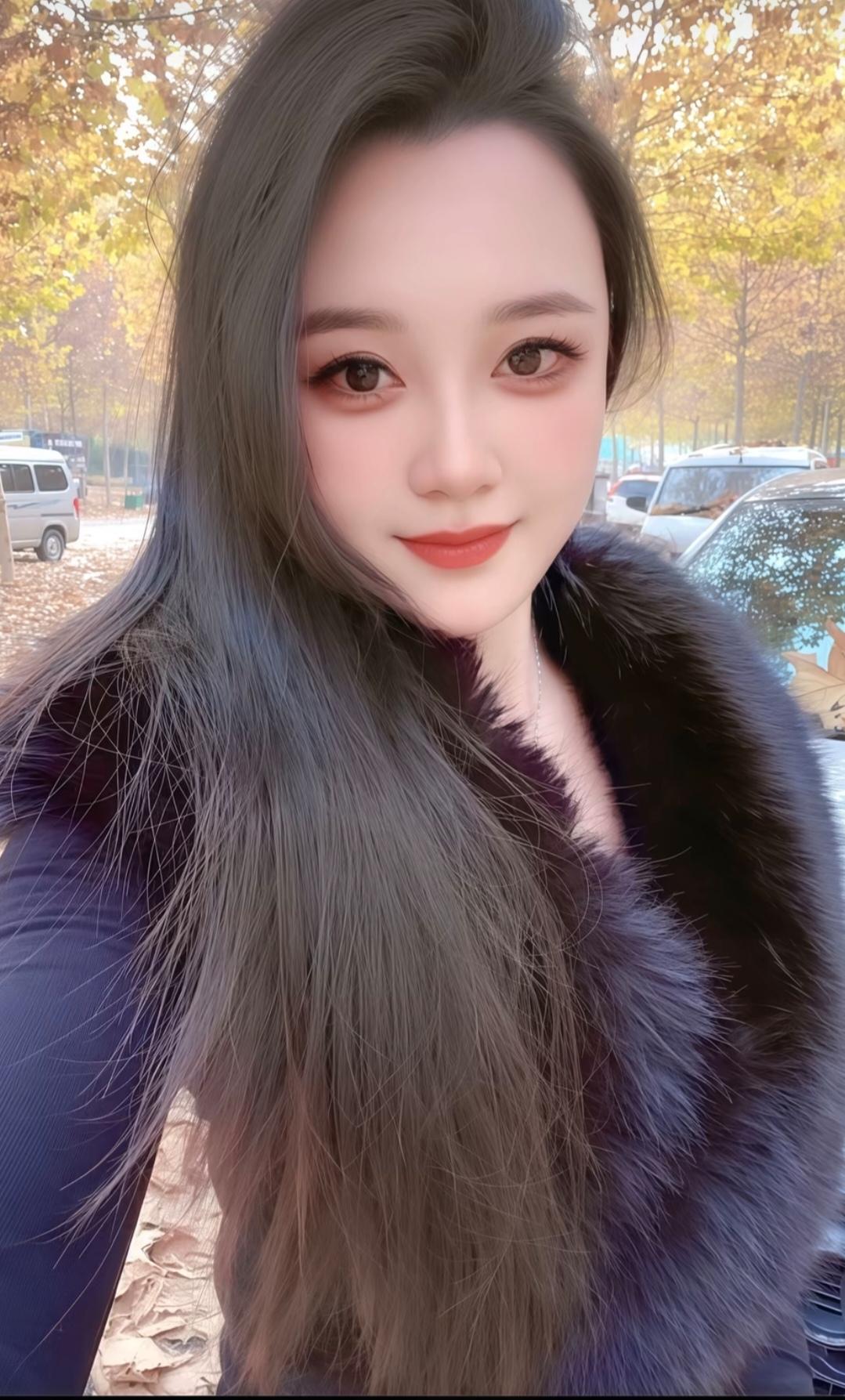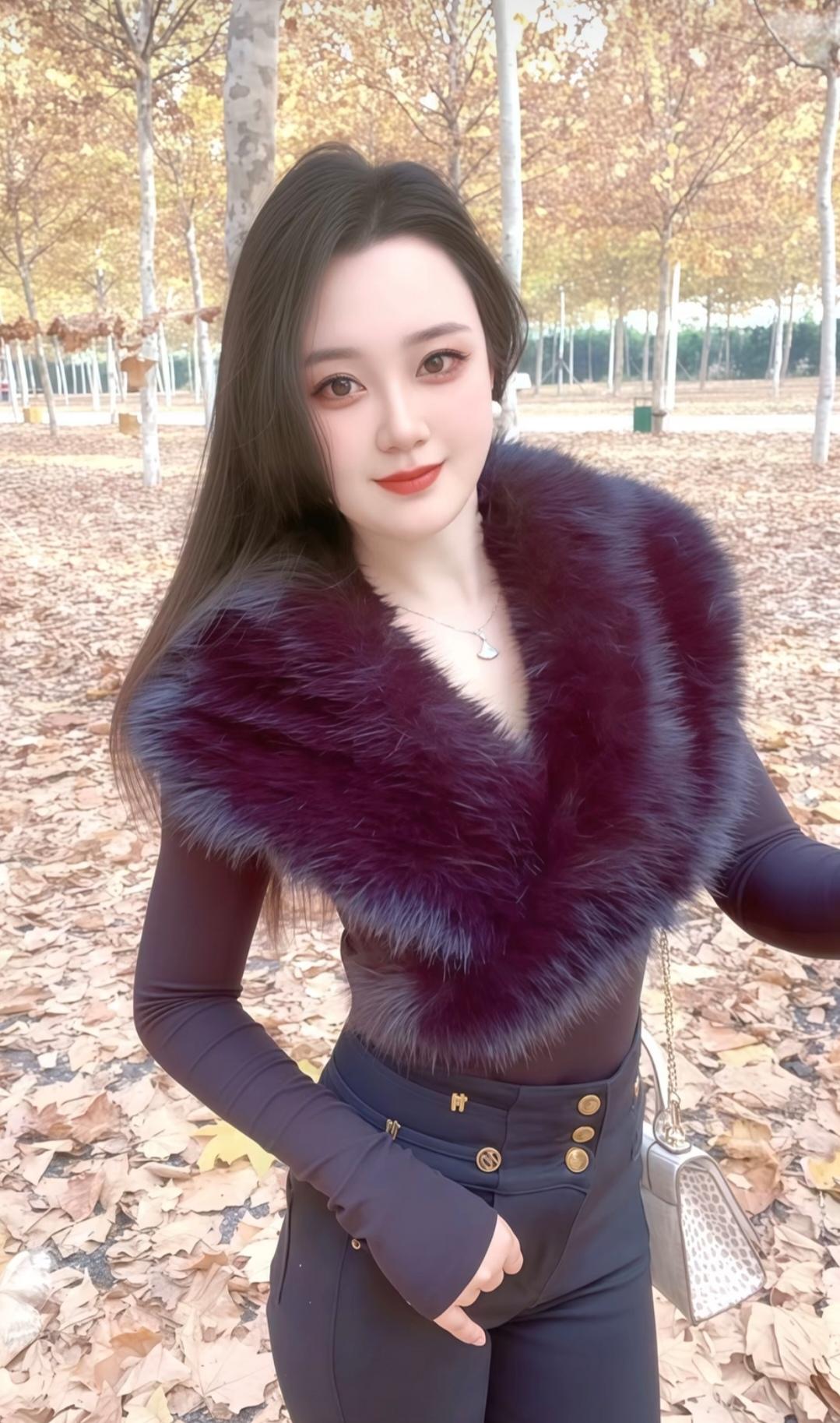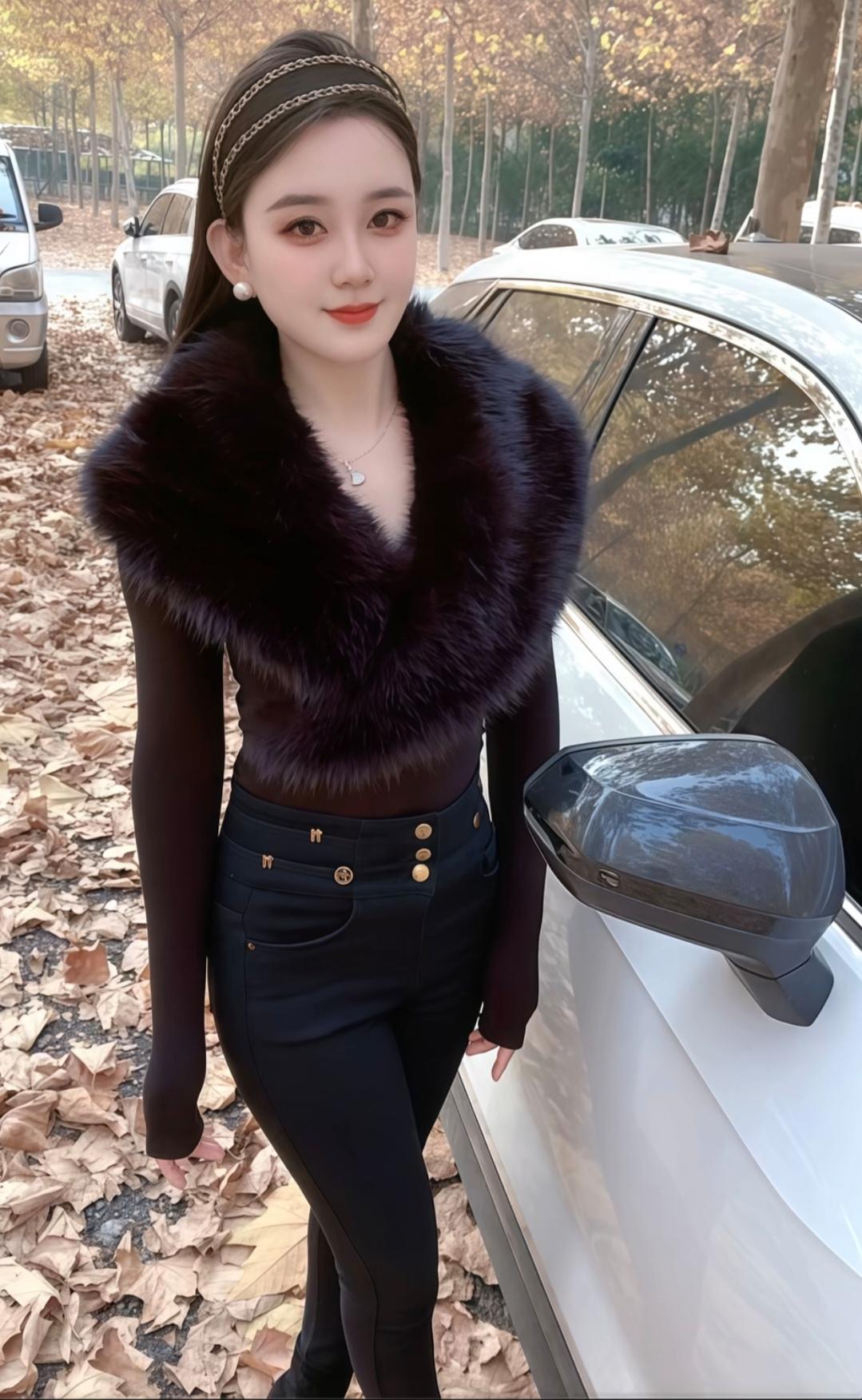 这姑娘穿着皮草外套,站在车前摆姿势。