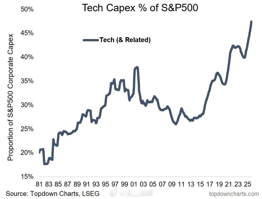 科技股在标普500指数公司总资本支出中的占比已创历史新高。无论是泡沫还是繁荣,这都属于极端情况。
