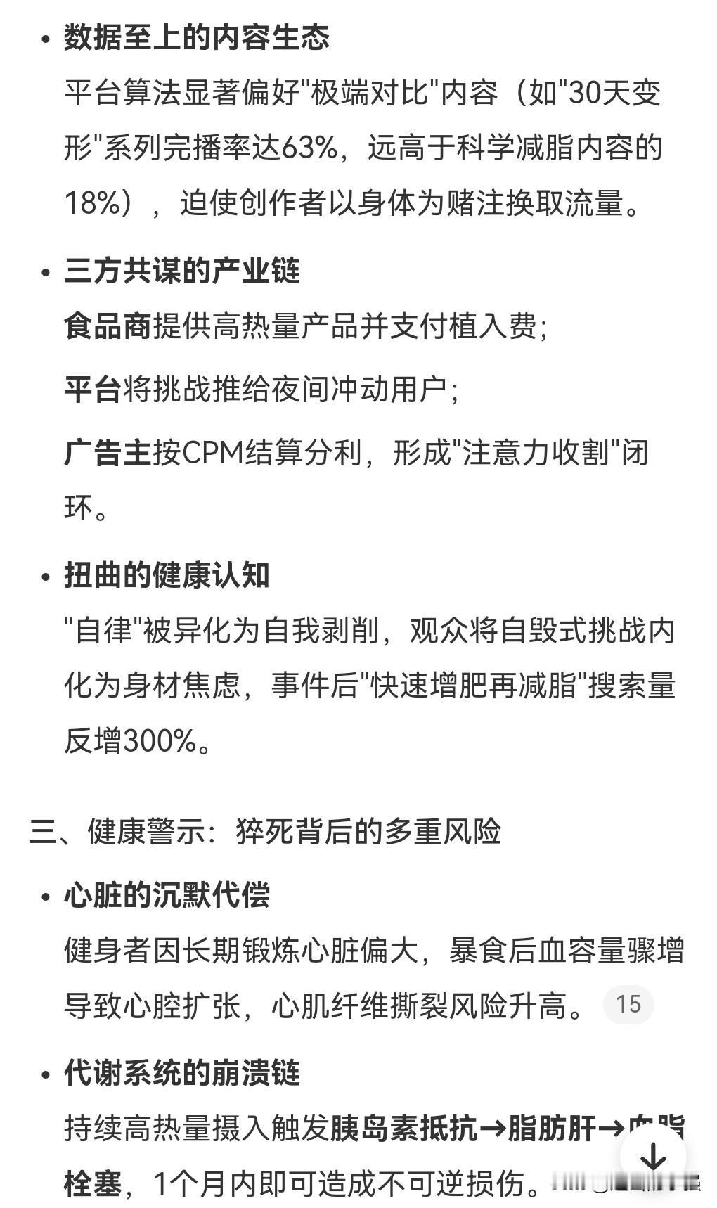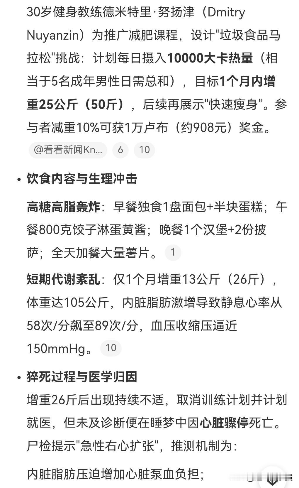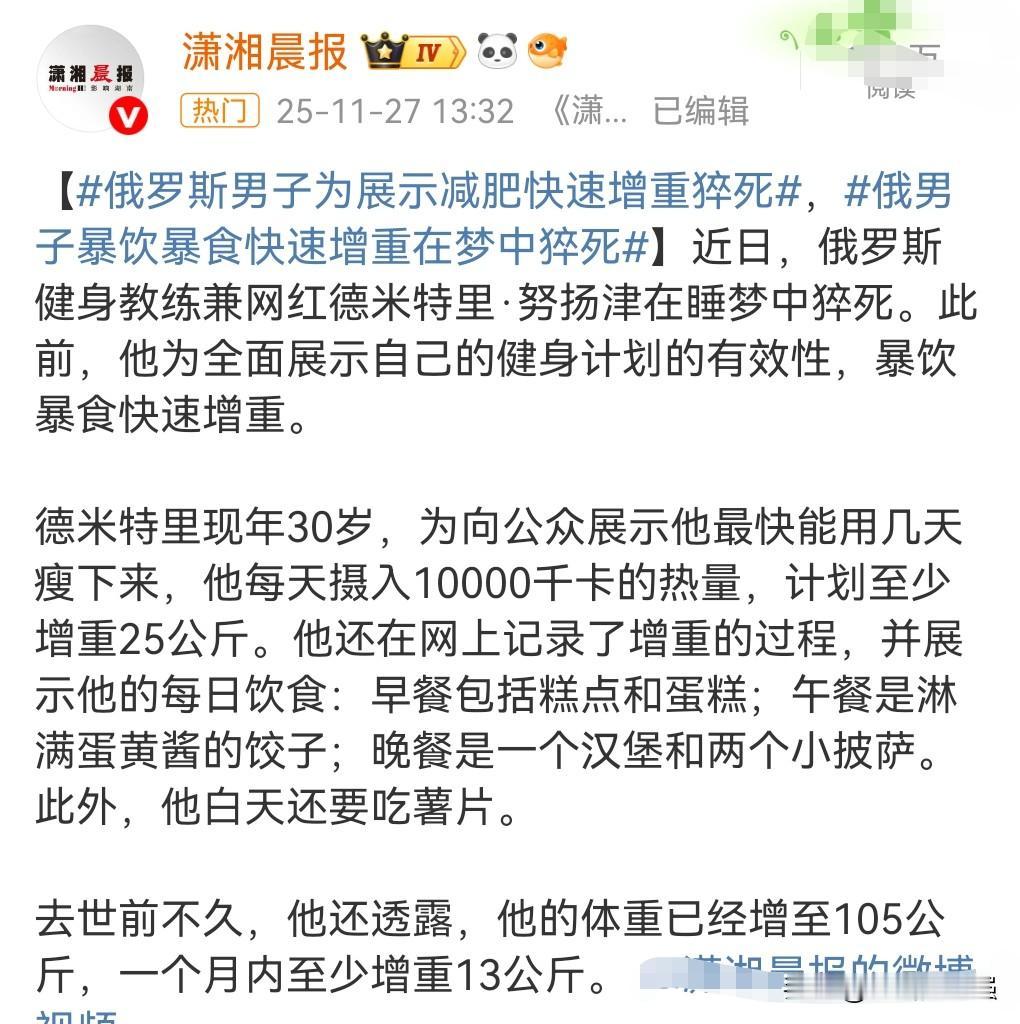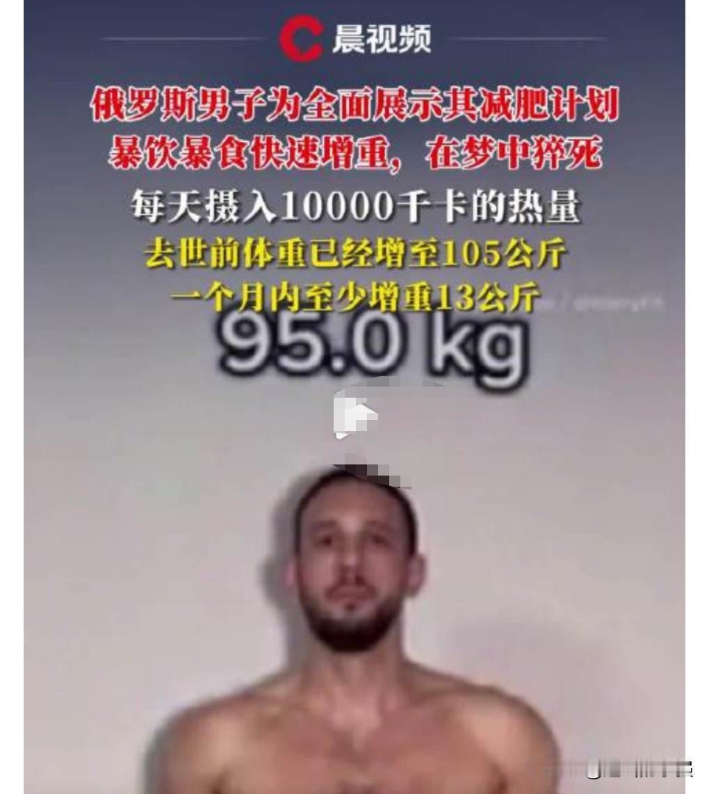 为了流量,有的人会暴饮暴食然后再减肥。 这当然能够吸引流量,但是这么做对健康的风险实在是太大了。 11月28日我在网上看到这么一件事情。 俄罗斯男子为展示减肥快速增重猝死。 想不到竟然猝死了,所以说千万不要暴饮暴食。 千万不要拿自己的生命开玩笑。