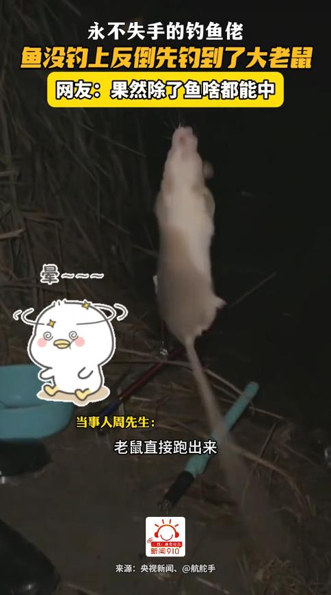 “意外的惊喜!”11月27日,贵州遵义,一男子在河边夜钓时,刚准备甩鱼竿,却感觉鱼线特别的沉,他提过来一看,上面竟然挂着一只大老鼠!男子和朋友笑了好一阵,最后用钳子取出钩子,将老鼠放生了。网友:应该去买彩票的! 有这么一句话说得好:钓鱼佬永不空军。不少人钓鱼时,鱼没钓上来几条,稀奇古怪的东西倒是钓上来不少,只是男子没想到,这年头钓鱼还能钓到老鼠的。 当天晚上,周先生喊上朋友前往老地方钓鱼,二人收拾好装备后,就开始在河边垂钓,只是周先生没想到,自己刚出师就不利。 第一次挥杆,鱼钩就挂在了岸边的草上,周先生本打算顺着鱼线去解钩子,可是另一端却突然绷直,似乎钓到了什么东西。 周先生立即把鱼竿收了回来,竟看到一只大老鼠咬住了鱼钩,不断在空中转圈,他急忙喊来朋友,二人都是第一次遇到这种情况,笑了好久才想办法取下钩子,然后把老鼠放生了。 周先生表示,刚看到老鼠的那一刻自己也是蒙的,应该是过去偷吃饵料被钩住了,想要逃跑已经跑不掉了,这可比钓上大鲤鱼还要刺激。 网友看后表示,果然钓鱼佬除了鱼什么都能钓到,但是为什么要放生呢?对于老鼠这种害兽,就应该见一只杀一只! 信息来源:《永不失手的钓鱼佬,鱼没钓上反倒先钓到了大老鼠,网友:果然除了鱼啥都能中。》广西台新闻910