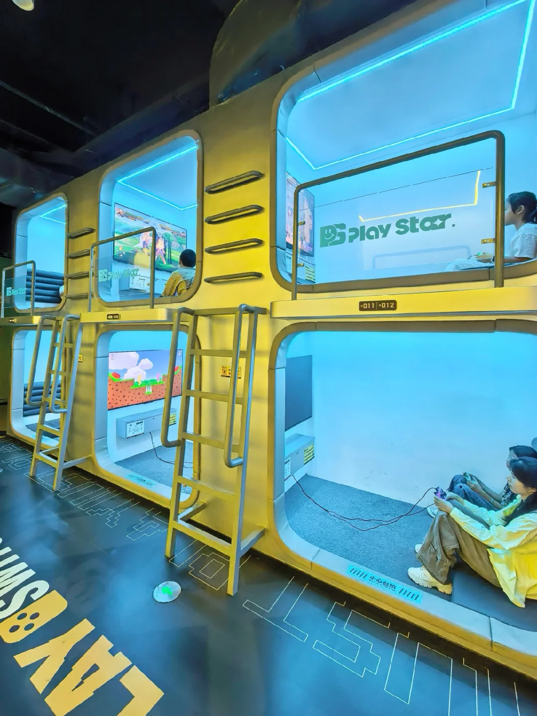 6️⃣Switch 胶囊仓:12 个独立舱位,高清大屏 + 懒人沙发,躺着玩坐着玩都可!几十款热门游戏随便选,《马里奥》《星之卡比》亲子同屏超欢乐