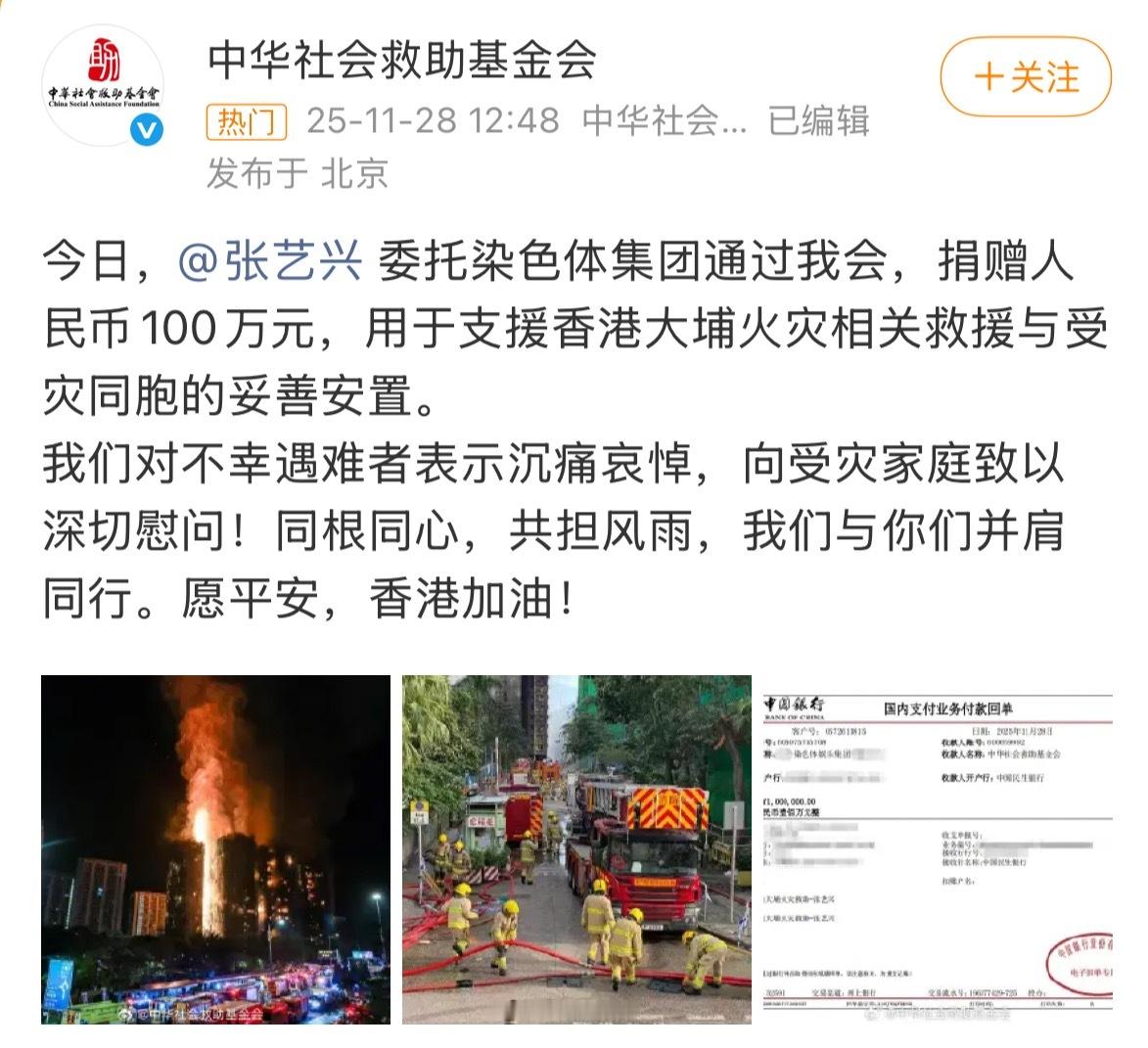 张艺兴捐款100万元张艺兴为香港火灾捐赠100万元