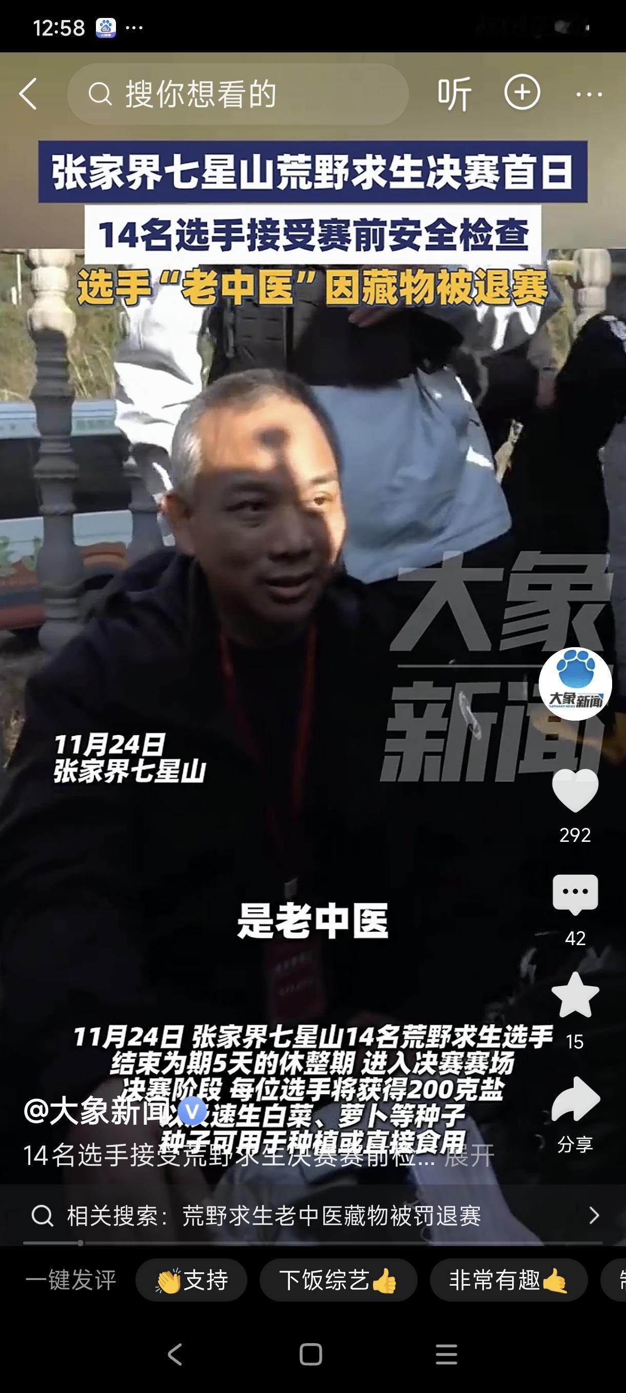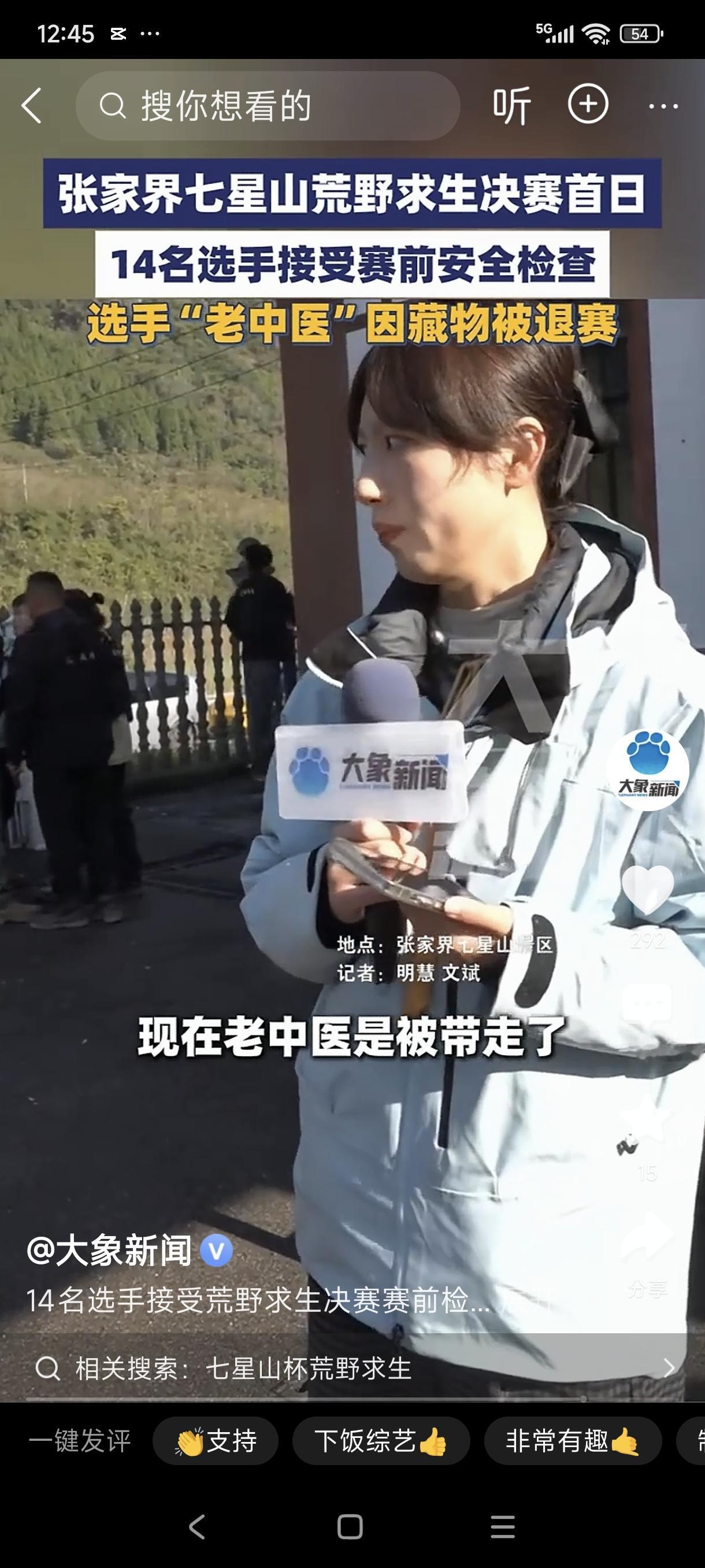 荒野求生决赛“老中医”藏物被退赛 根据最新报道,荒野求生决赛中,“老中医”选手因在赛前检查中被发现藏有违禁物品,导致被取消参赛资格。这一事件引发了广泛关注和讨论。 事件经过: 14名选手在比赛开始前接受了官方的安全和装备检查。 “老中医”在检查中被发现携带了不符合规定的物品,具体细节尚未公开。 经核实后,主办方决定取消其比赛资格,确保比赛的公平性和安全性。 影响与反响: 此次事件强调了比赛的严格管理和公平原则。 观众和网友对“老中医”的退赛表达了理解,也有人呼吁加强赛前检查的严密性。 其他选手和团队表示支持主办方的决定,期待比赛能在公平的环境中顺利进行。 后续措施: 主办方可能会加强赛前检查流程,避免类似事件再次发生。 赛事组织方也可能会对选手的准备和行为进行更严格的监管。 整体来看,这一事件提醒所有参与者遵守比赛规则,确保比赛的公正与安全。如何评价张家界荒野求生决赛 荒野求生决赛“老中医”藏物被退赛
