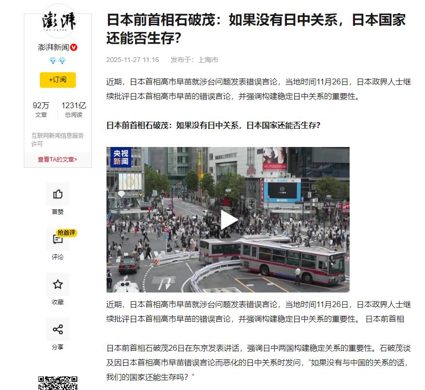 倘若没有中日关系,没有中国,日本还能否存续? 11月26日,日本前首相石破茂在东京演讲时,抛出了这么个问题,一下子把日本政坛那些装糊涂的人给敲懵了。这话听着有点扎心,但说的全是实话,不管是餐桌上的菜,还是工厂里用的稀土,就连生病吃的药,日本哪儿样都离不了中国。说白了,日本的日子早就和咱们绑在一块儿了。 石破茂这话可不是故意吓唬人,全是日本人每天要面对的真事儿。日本自己种的粮食根本不够吃,粮食自给率常年就37%左右,意思是三分之二的吃的都得从国外买。 你去日本超市看看,货架上的菠菜、大葱,十根里有七根都是从山东运过去的;一到冬天,超市里的白菜、萝卜,近六成来自辽宁、吉林的菜地。就说去年福岛核污染水排海那事儿,日本的鱼啊虾啊根本没人敢买,最后还是靠中国给了些订单,才算缓过点劲来。 比吃饭更让日本揪心的,是它的产业命根子。日本总说汽车、半导体是自己的“立国之本”,可这些光鲜产业的“心脏”,稀土,几乎全靠中国供应。 造一辆新能源汽车得用50公斤稀土,做一块芯片也离不开稀土做的永磁体,而日本90%以上的稀土,都是从中国进口的。以前日本也想过找替代品,跑去澳大利亚开矿,结果算下来成本是中国的三倍还多,最后只能不了了之。 就连日本人看病吃药,都绕不开中国。日本医药工业协会有数据,他们常用的头孢类抗生素,75%的原料都来自中国;那些中药制剂的原料,90%得靠进口,其中八成是从中国东北的药材基地运过去的。 去年疫情的时候,中国一度暂停了部分原料药出口,日本药房里立马就出现了降压药、降糖药断货的情况,当时日本厚生劳动省急得不行,专门派人来中国商量,就怕药不够用。 可偏偏就有政客看不见这些实打实的情况,现任首相高市早苗就是个例子。她一边喊着“要对中国强硬”,一边把约束日本的二战法律条款当空气。她怕是忘了,《开罗宣言》《波茨坦公告》这些文件,可不是随便写写的废纸,这是日本作为战败国,能重新被国际社会接纳的前提。 这些文件里写得明明白白,日本必须反省侵略罪行、把偷的领土还回来,就连《中日联合声明》里都明确说了承认一个中国,这是中日能建交的根本。 这些条款的分量有多重?就连一向张扬的特朗普,都不敢公开对着干,顶多在背后偷偷鼓捣几句。可高市早苗倒好,不仅总掺和台海的事儿,还放任右翼势力洗白侵略历史,甚至喊着要突破“和平宪法”扩军。她这行为,就跟抱着柴火站在火药桶边上差不多,压根没想想,日本的日子能过下去,全靠中日关系稳定。 这么一对比,就更显得石破茂实在。从1972年中日建交以来,以前的日本政府都知道一个中国原则是底线,可现在有些政客偏偏要模糊这个底线。他们忘了,中国是日本最大的贸易伙伴,2024年中日贸易额都突破3500亿美元了,日本的汽车、电子产品,全靠中国市场撑着才不掉价;而日本的农产品、精密仪器,也确实丰富了咱们中国人的选择。 说透了,中日关系不是“谁求谁”,而是你中有我、我中有你的共生关系。石破茂的问题,其实是在提醒日本政客:别被那些没用的意识形态牵着走,别拿国家的生存当赌注。那些瞎嚷嚷要挑战中国的话,不光会砸了日本人的饭碗,更会让日本违背战后的承诺,最后被国际社会嫌弃。 现在的日本真该学学石破茂的清醒:先管好老百姓餐桌上的菜、工厂里的原料、药房里的药,先把那些写在纸上、刻在历史里的法律条款当回事。说到底,中日关系稳定,日本的日子才能安稳,这才是最实在的道理。