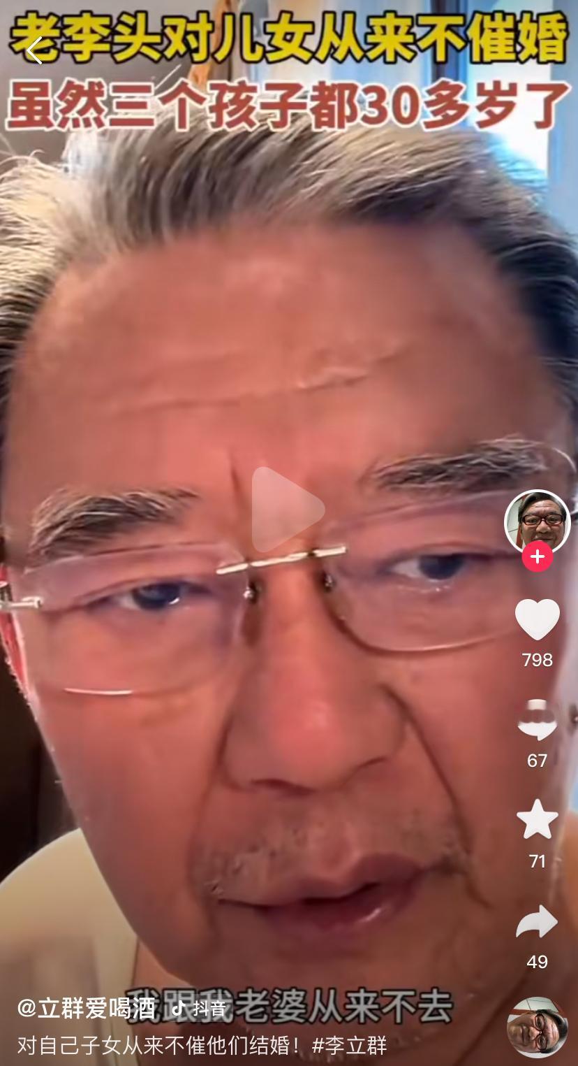 李立群三个孩子都成大龄单身青年了,他嘴上还很硬,他说他与老婆从来不催孩子们的婚事,感情的事自己做主。唉,将心比心,要是我的三个孩子都不结婚,真会气炸,一个不结婚还好受点。再过10年,仍这样,这个家团聚了会什么样!