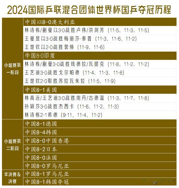 【11场仅丢十局丝滑夺冠!2024国际乒联混合团体世界杯国乒夺冠历程回顾!】 去年的混合团体世界杯国乒11连胜夺冠彰显硬实力,确实是独一无二的存在! 小组赛第一阶段砍瓜切菜三轮只丢了一局,第二阶段车轮战,面对日韩丢掉六局。 半决赛和决赛,国乒分别给了罗马尼亚和韩国各一局,如果没有第一阶段第二轮的车轮战,预计淘汰赛国乒完全可以零封夺冠。 毕竟,男女单和混双都是国乒优势明显的项目,国乒相对弱的项目是男双。