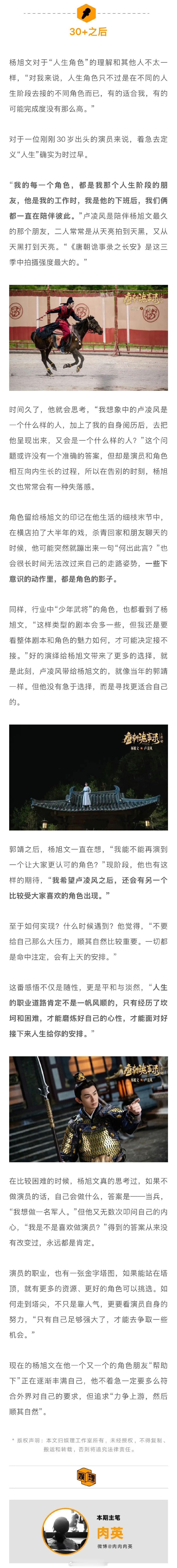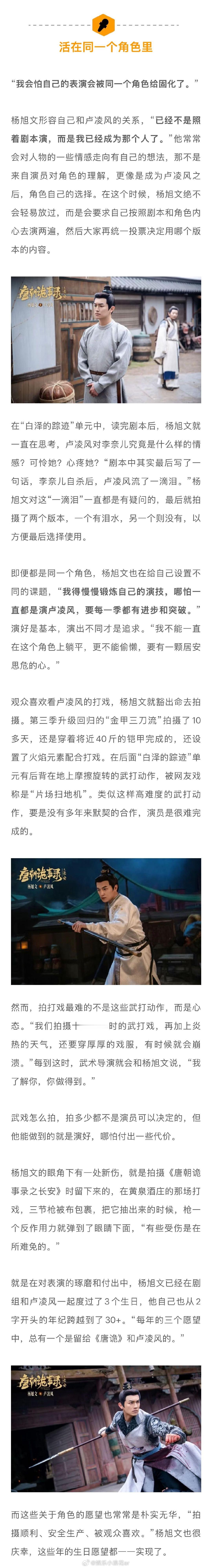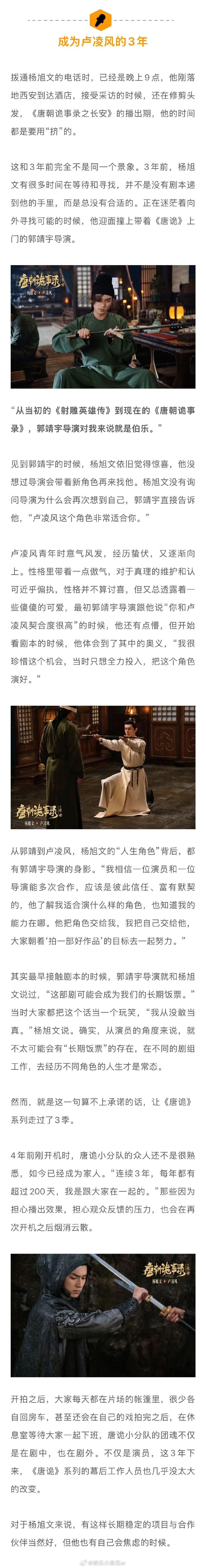 杨旭文说不是演而是成为卢凌风 杨旭文因唐诡打戏眼角受伤 从郭靖到卢凌风,的“人生角色”背后,都有郭靖宇导演的身影。“我相信一位演员和一位导演能多次合作,应该是彼此信任、富有默契的,他了解我适合演什么样的角色,也知道我的能力在哪。他把角色交给我,我把自己交给他,大家朝着‘拍一部好作品’的目标去一起努力…”娱理独家↓