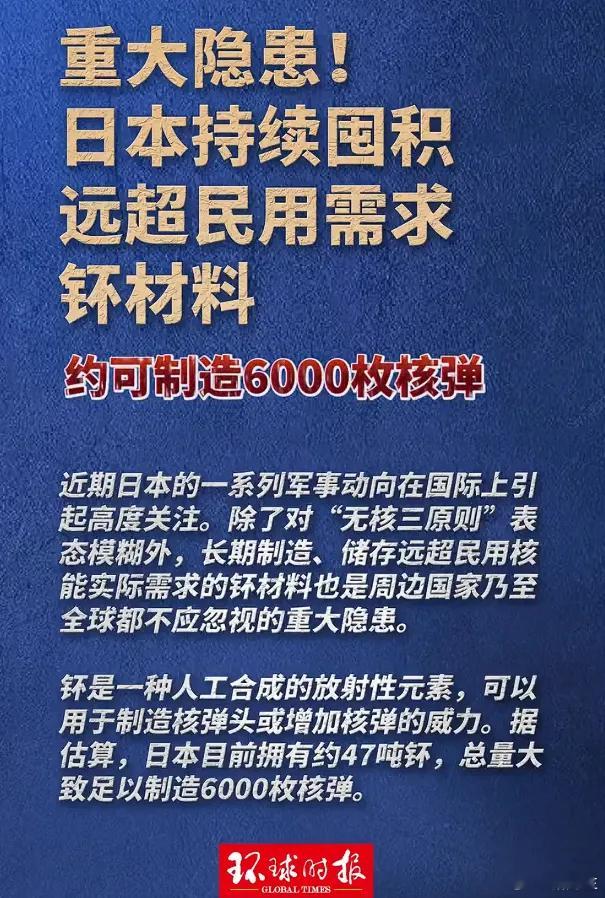 重大隐患!日本持续囤积远超民用需求钚材料约可制造6000枚核弹近期日本的一系列军事动向在国际上引起高度关注。除了对“无核三原则”表态模糊外,长期制造、储存远超民用核能实际需求的钚材料也是周边国家乃至全球都不应忽视的重大隐患。钚是一种人工合成的放射性元素,可以用于制造核弹头或增加核弹的威力。据估算,日本目前拥有约47吨钚,总量大致足以制造6000枚核弹。