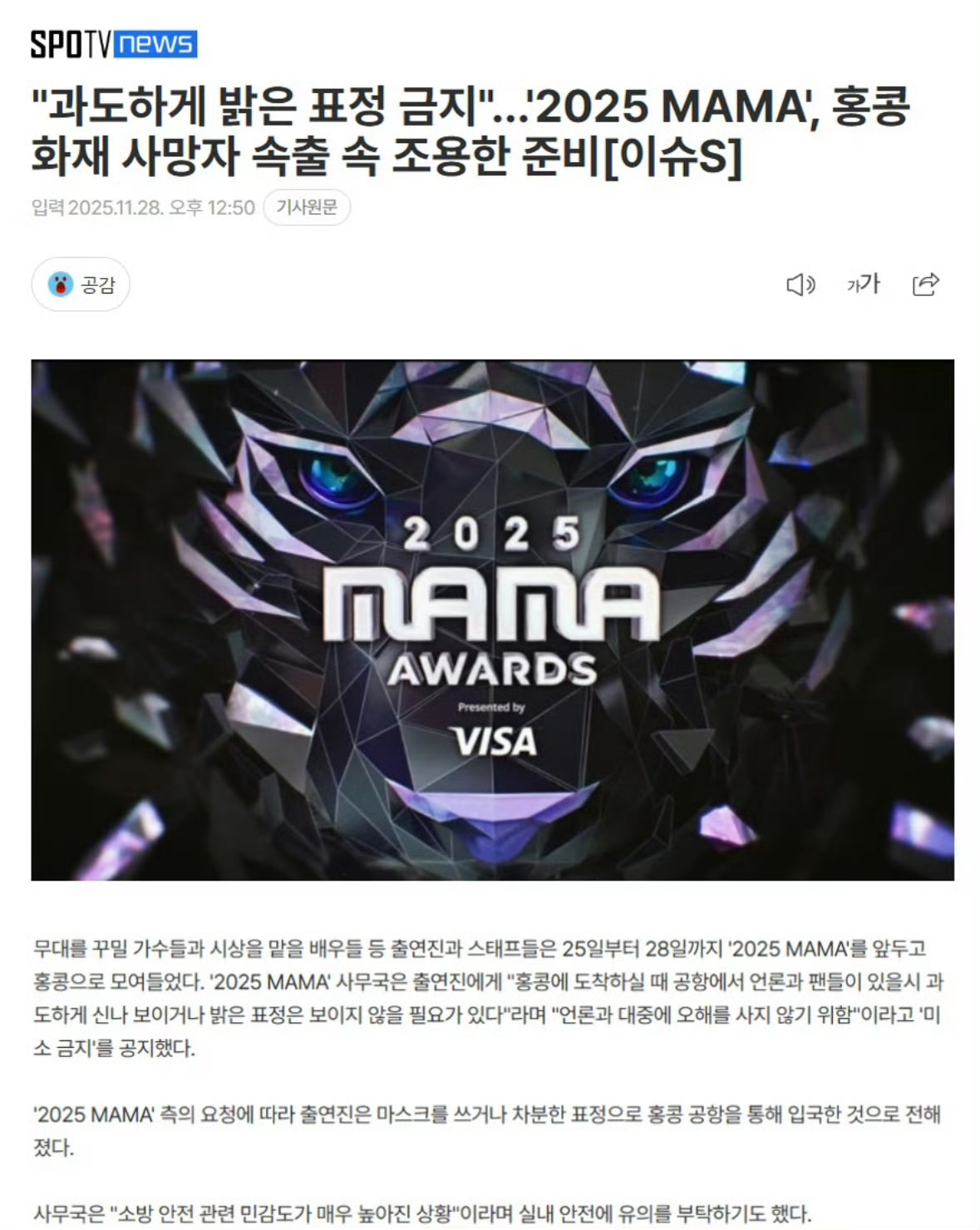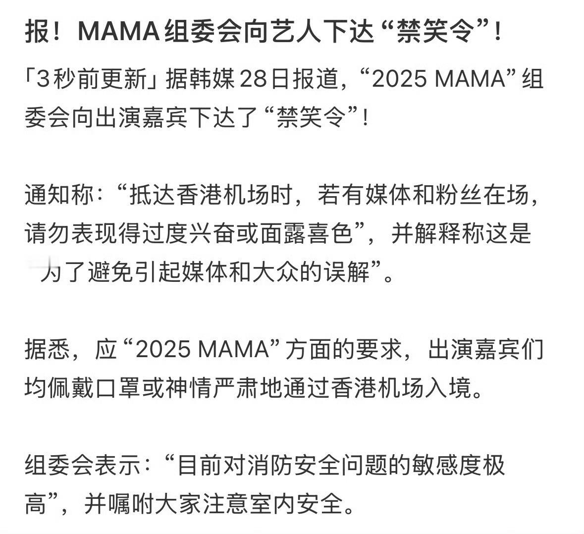 MAMA香港禁笑令 据韩媒,MAMA组委会已向所有演出人员下达“禁笑令”,要求艺人在抵达香港机场时避免露出过度兴奋或明亮表情,以防引发公众误解。根据规定,所有演出人员均需佩戴口罩或保持平静表情通过机场入境。