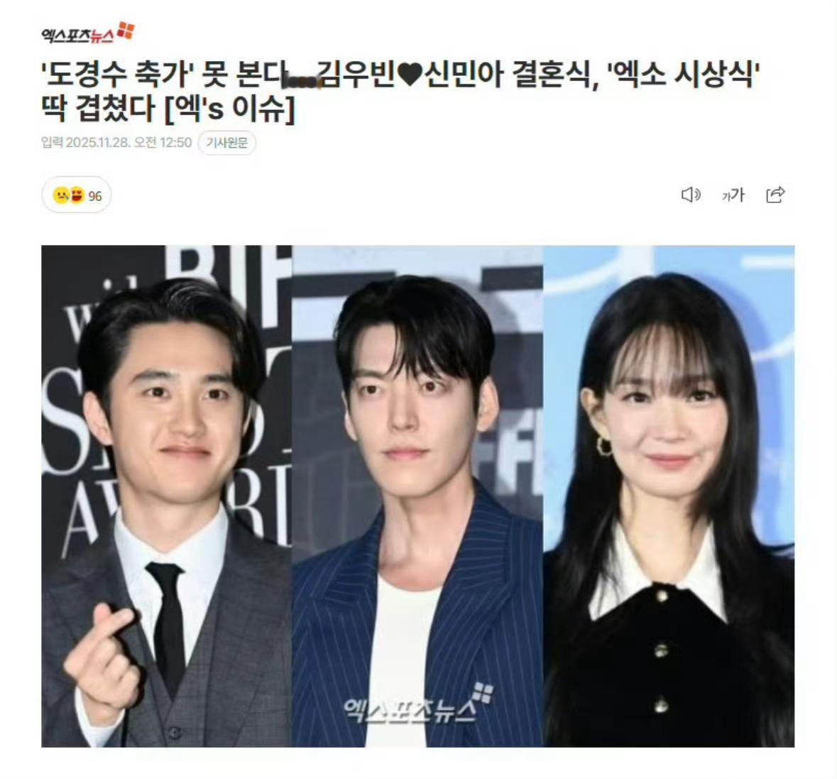 金宇彬与申敏儿将于12月20日举行的婚礼,与“2025 Melon音乐颁奖典礼”时间完全重合。都暻秀所在组合EXO需于当天下午5点出席在首尔高尺天空巨蛋举行的颁奖礼,致使他无法参加好友婚礼。都暻秀无法参加金宇彬申敏儿婚礼金宇彬婚礼与MMA颁奖礼撞期