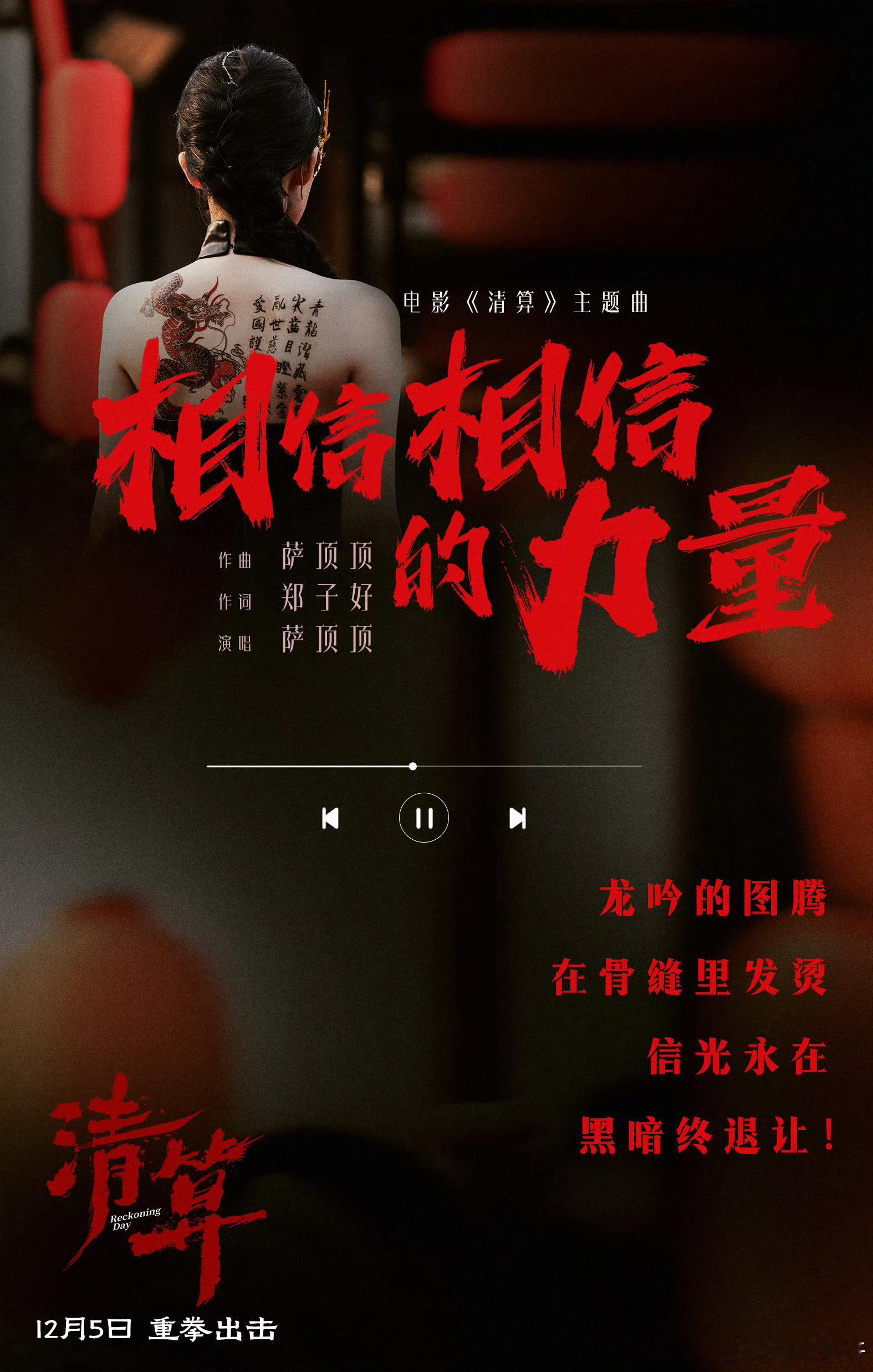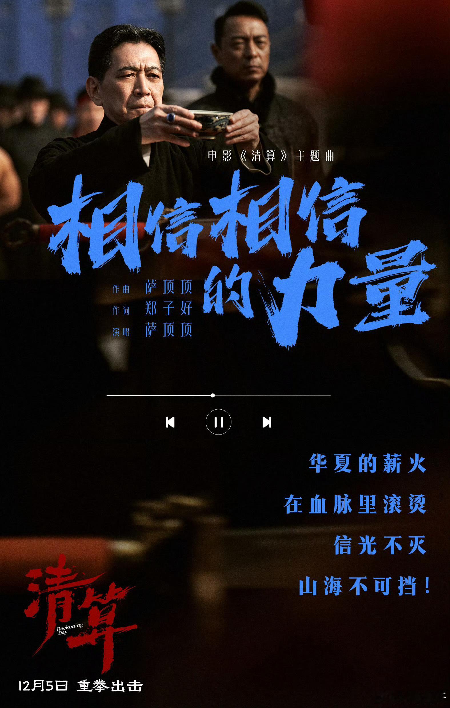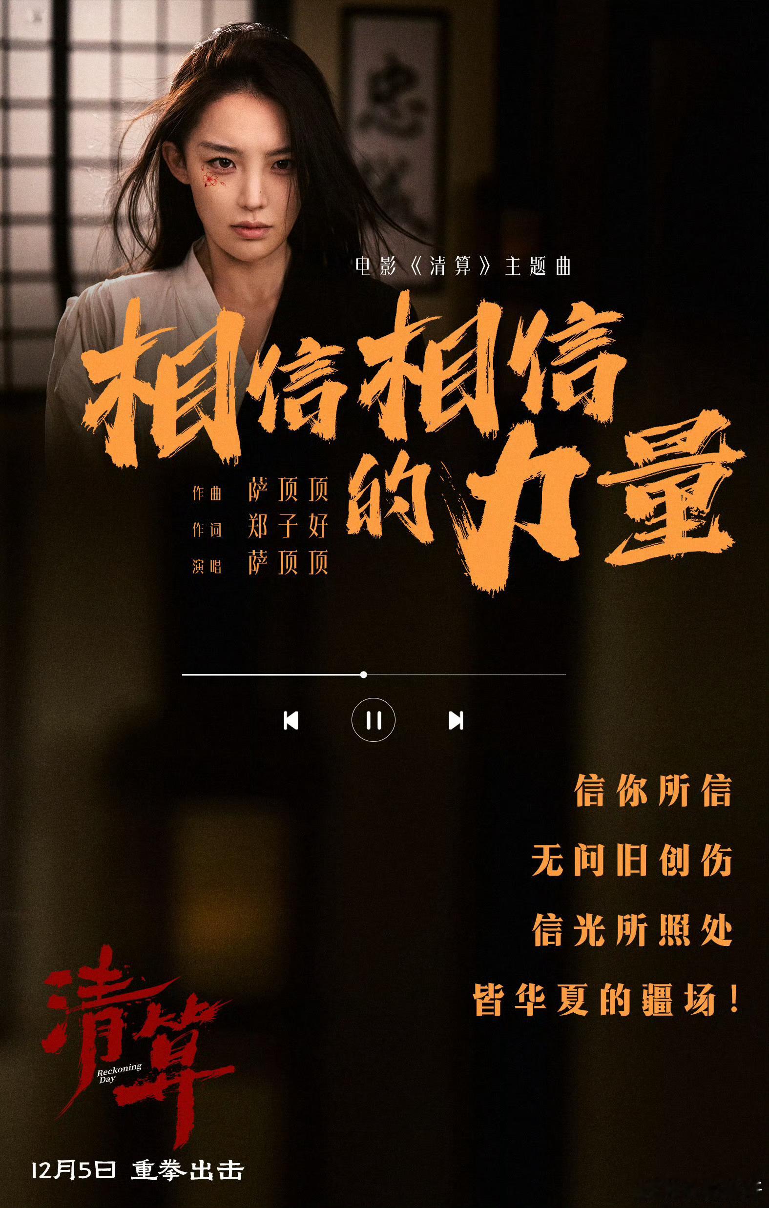 萨顶顶献唱致敬抗战中的普通人 萨顶顶为电影《清算》献唱主题曲《相信相信的力量》,标志性的空灵声线唱出了乱世中普通人的坚守与信念。“山河在胸膛,刻下不弯的脊梁”这句歌词响起,与萨顶顶充满叙事感的嗓音交织,带我们看见每一个平凡的中国人,如何成为国家的脊梁;也带我们回到那个年代,看见那些民间义士为家国大义挺身而出的不屈精神。电影《清算》12月5日上映。不妨先一起看看这首歌的MV,感受歌声与影像交融的那份恰到好处,感受“相信相信的力量”!电影清算