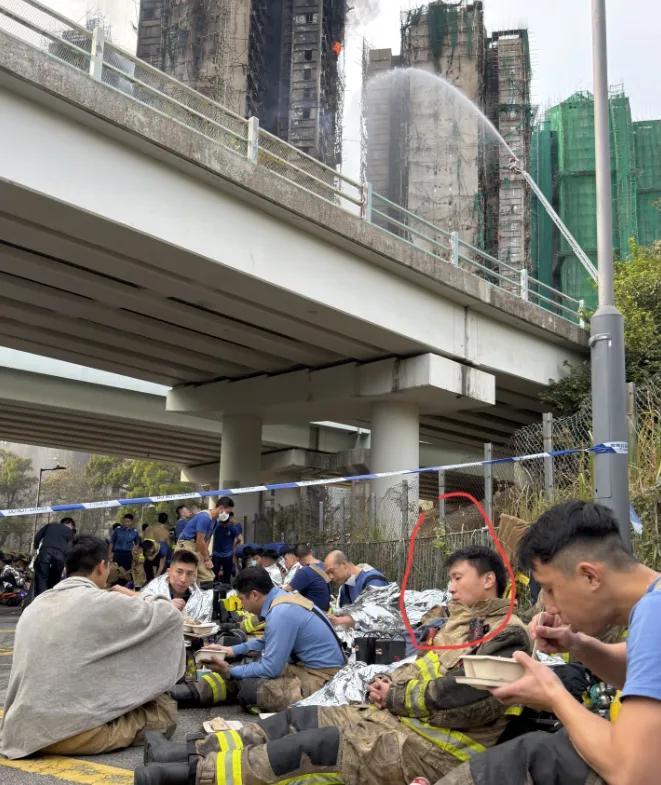 看到这张照片, 真的让人瞬间心碎, 起火的高楼还在冒黑烟, 水枪的水还朝着火场浇着, 而桥下的空地上, 出来的消防员们都累透了, 即使他们在休息,也没有胃口吃东西了 一个个都瘫软在地上了 真希望这是一场梦。 假如有载水量五吨到二十吨的大型无人机参与灭火,十架二十人外带架指挥机,灭火车几架就够了,估计这样的火灾也搞不到那么累!与时俱进很重要!水火无情。 消防员,是和平年代里,最危险的工作之一,愿减少天灾人祸,保世人平安。 向香港消防员致敬!