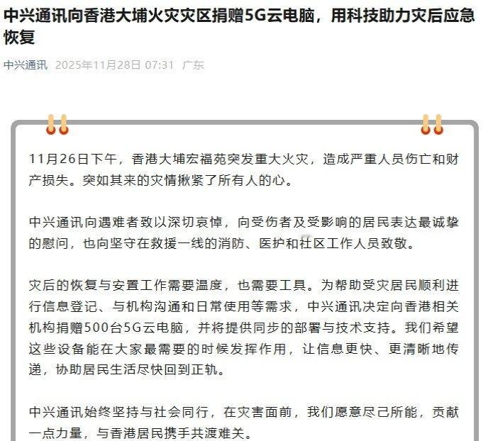 【中兴通讯向香港大埔火灾灾区捐赠 500 台 5G 云电脑】香港大埔宏福苑突发重大火灾,造成严重人员伤亡和财产损失。中兴通讯今日宣布向香港相关机构捐赠 500 台 5G 云电脑,并将提供同步的部署与技术支持。附原文如下:11 月 26 日下午,香港大埔宏福苑突发重大火灾,造成严重人员伤亡和财产损失。突如其来的灾情揪紧了所有人的心。中兴通讯向遇难者致以深切哀悼,向受伤者及受影响的居民表达最诚挚的慰问,也向坚守在救援一线的消防、医护和社区工作人员致敬。灾后的恢复与安置工作需要温度,也需要工具。为帮助受灾居民顺利进行信息登记、与机构沟通和日常使用等需求,中兴通讯决定向香港相关机构捐赠 500 台 5G 云电脑,并将提供同步的部署与技术支持。我们希望这些设备能在大家最需要的时候发挥作用,让信息更快、更清晰地传递,协助居民生活尽快回到正轨。中兴通讯始终坚持与社会同行,在灾害面前,我们愿意尽己所能,贡献一点力量,与香港居民携手共渡难关。