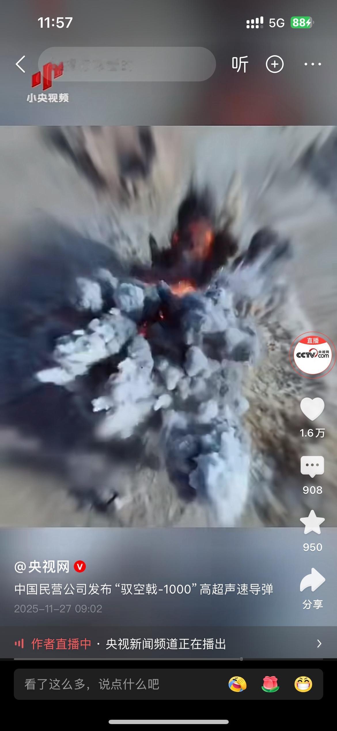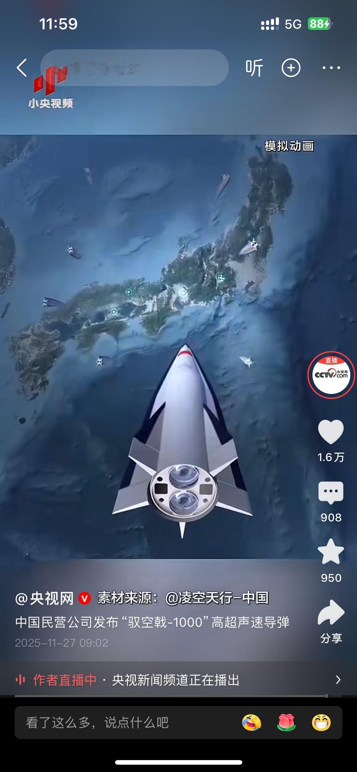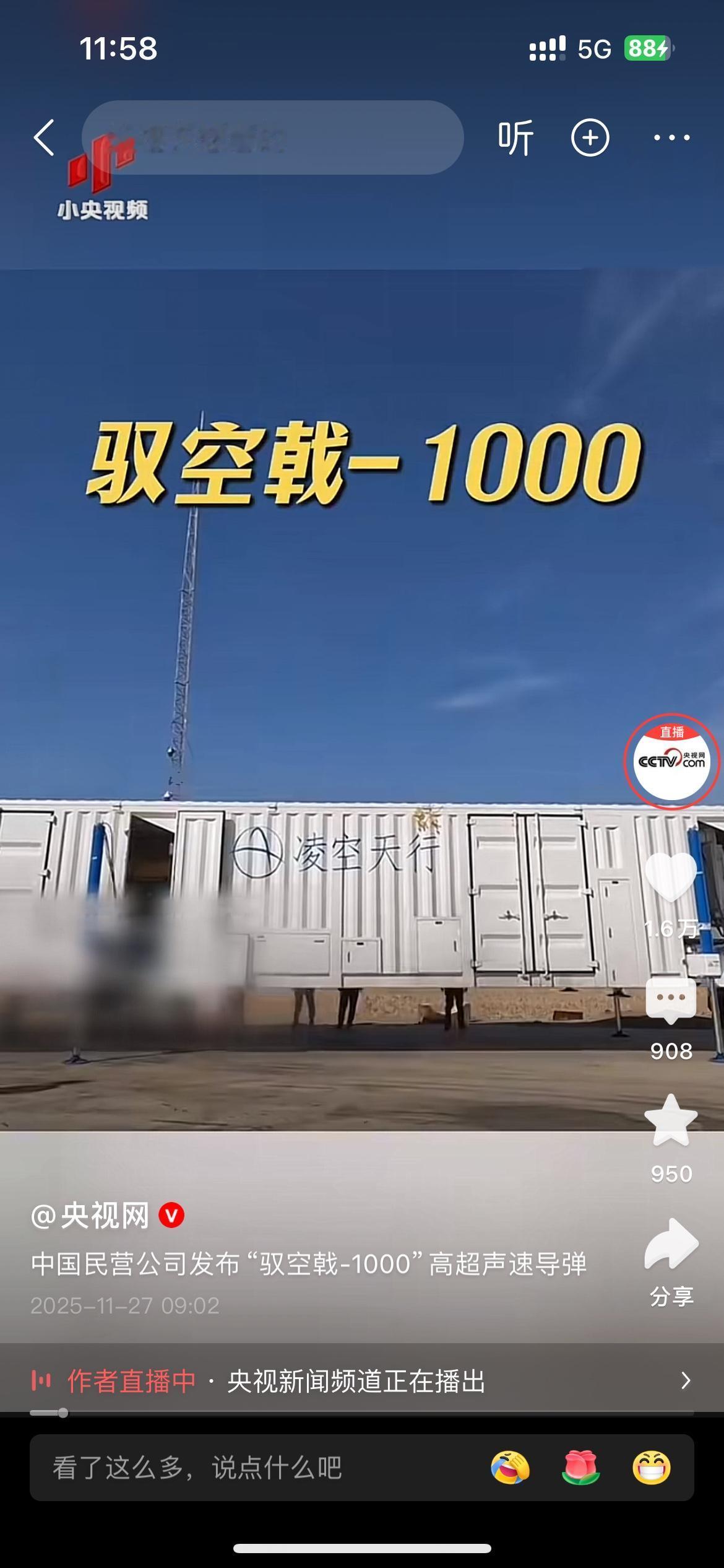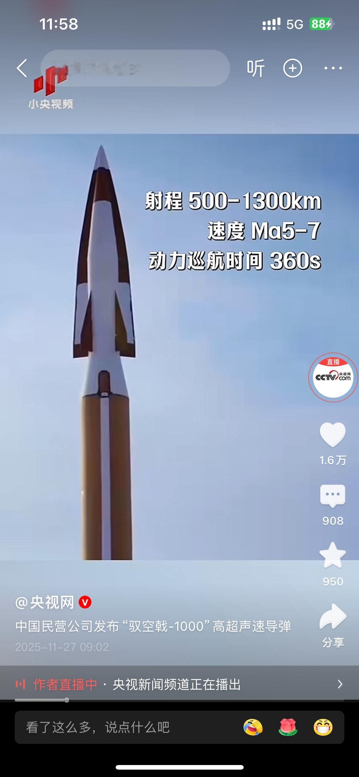 中国民营公司发布的高超声速导弹,“驭空戟-1000”导弹,射程500-1300公里,速度5-7马赫,动力巡航速度360秒。 既然能让央视为这家“凌空天行”的民营公司做起了广告,看来这家民营公司这次是要“大爆发”了,军工引进民营企业爆产量了!一旦生产产能大开,这款高超声速导弹“爆产”那是几何指数的增长!某人睡觉要睡不着了。