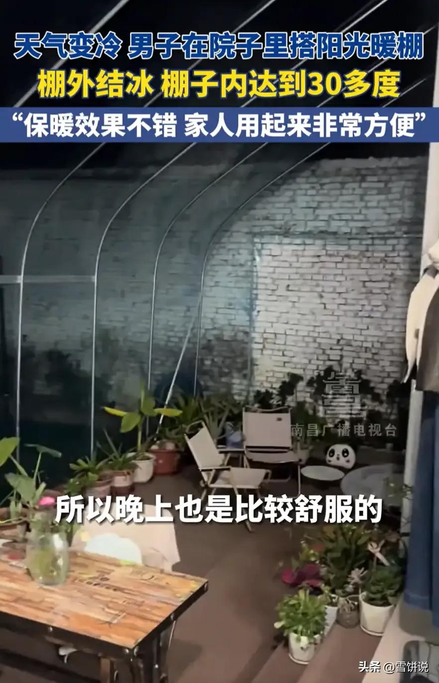 这是真聪明!河北石家庄,天气变冷后,一男子突发奇想在院子里花1000多块钱搭了一个阳光暖棚,没想到效果出奇的好,棚外的水都结冰了,棚里面最高却能达到30多度,网友:这不会有味道吗? 这哥们儿也是个有心人,眼看着天气一天比一天冷,家里老人总念叨电费贵,舍不得开空调,屋里冷冰冰的。某天刷手机的时候,刷到东北老铁分享自家搭的阳光暖棚,既能养花又能取暖,他瞬间来了灵感:“咱这儿也有太阳,是不是也能搭一个试试?”说干就干,他跑去农资市场和建材店,买了大棚膜、钢管支架这些材料,前前后后花了1000多块钱,就在自家院子里,对着正屋的窗户搭了个简易的阳光暖棚。 本来也就是抱着“试试水,不行就当瞎折腾”的心态,没指望能有多大效果。可等暖棚搭好,晒了一天太阳,效果直接超出预期。外面天寒地冻,院子里露天放的水桶,晚上下班回来就结了厚厚的冰坨,手伸出去没几分钟就冻得发麻。 可一掀开暖棚的塑料膜钻进去,瞬间一股热浪扑过来,跟进了小温室似的。他找了个温度计放进去,中午太阳最足的时候,温度直接飙到30多度,最高能到35度左右,把里面的水泥地都晒得发烫。 更绝的是,这暖棚不光自己热,还能给正屋供暖。 白天吸收的热量攒在棚里,通过窗户往屋里渗,屋里的温度比之前足足高了好几度,再也不用裹着厚棉袄在家待着。到了晚上,暖棚里还能剩下点余温,相当于一个不用插电的巨型暖气片,省了不少电费,家里老人高兴得合不拢嘴。 这事儿被他拍成视频发上网后,网友们眼馋归眼馋,不少人也犯了嘀咕:“这一整个棚子都是塑料膜,太阳底下暴晒一天,不得出一股子刺鼻的胶皮味儿?别暖是暖和了,再把人熏出毛病来,得不偿失啊。”其实这顾虑还真挺实在,毕竟咱以前见过那种劣质塑料膜,一晒就发软,味儿大得呛人。 但这哥们儿早就考虑到了,他买的不是那种便宜的再生塑料膜,而是正规厂家生产的农用耐晒膜,专门用来搭大棚的,材质稳定,耐高温。平时晒一天下来,基本闻不到啥明显的味道,就算偶尔有点淡淡的塑料味,也不用慌。 暖棚本身就留了通风口,觉得闷了或者味儿不对,把通风口掀开一条缝,空气一流通,味儿很快就散了。而且这暖棚本来就不是让人住的,就是个“热能收集器”,核心是攒热量往屋里送,没人会整天待在里面,完全不用怕味道的问题。 不过话说回来,这招虽好,却不是谁都能用。首先得有个敞亮的院子,像城里的高层住宅,连个阳台都不大,别说搭暖棚了,就算想弄,物业和城管也不答应。 其次这玩意儿纯靠天吃饭,要是赶上接连阴雨天,或者当地日照本身就少,暖棚吸收不到足够的热量,效果就得大打折扣。 但不管咋说,这哥们儿花1000多块钱,就解决了家里过冬取暖的大难题,属实是把生活智慧玩明白了。 咱普通人过日子,不就是这样吗?不用追求多昂贵的设备,只要肯动脑子,结合自家的情况想办法,就能用最小的成本解决最头疼的问题。比起动不动就花几千上万买取暖设备,这种因地制宜的小妙招,更让人觉得接地气,也更值得琢磨和借鉴。毕竟过日子,图的就是个实惠舒服,能少花钱多办事,就是最实在的本事。 信息来源:南昌广播电台