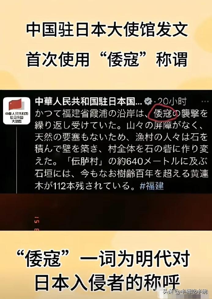 日本网友肯定坐不住了,因为网传我们驻日大使馆称日本为倭寇。这是几百年后我们再次官方提到倭寇二字。 说白了,驻日大使馆一句 “倭寇” 把历史的积灰全扬了起来,日本网友急得跳脚,我们倒该好好琢磨这俩字的分量 , 这可不是随便喊的外号,是刻在骨子里的记忆,更是早该捡起来的固有称呼。 前两天给 91 岁的爷爷读新闻,刚念到 “驻日使馆提倭寇”,老爷子手里的搪瓷杯 “哐当” 撞在桌角。 他浑浊的眼睛一下子亮得吓人,攥着我的手腕反复念叨:“就是这俩字!当年他们端着刺刀进村,把我姐藏在柴堆里的口粮全抢了,还放火烧了祠堂……” 爷爷说的不是遥远的古代,是抗日战争时期,那时人们也管日本侵略者叫倭寇,这词儿早就和烧杀抢掠的画面绑在一起,刻在老一辈的骨子里。 有人说这词儿太尖锐,其实拆开看就是妥妥的象形文字,“倭” 在古里指身形矮小的人,“寇” 是拿着武器在屋里施暴的模样,合起来就是仗着武力劫掠的侵略者,形象得很。 查资料才知道,这词儿打元朝就有了,那会儿日本的浪人和海盗老来骚扰沿海,高丽史书里早记下 “倭寇金州” 的字样。 明朝更别提了,戚继光带着戚家军在东南沿海杀得倭寇闻风丧胆,那些用狼筅扫敌阵、鸳鸯阵困贼兵的故事,哪个中国人没听过?算下来,这称呼少说也传了七八百年,比 “日本” 这个近代称呼的历史长得多。 现在有人纠结翻译的问题,其实特简单,直接译成 “日本人” 就行,本来这词儿就是我们对这个邻邦的固有称呼,就像古人叫 “倭奴国” 一样,是历史传下来的说法。 你看明朝史料里全是 “倭寇犯境” 的记载,那会儿也没见谁觉得不妥,反倒是后来慢慢不用了,倒让一些人忘了这词儿的由来。 再说了,外交场合用怎么了?前阵子日本首相喊 “台湾有事就是日本有事”,人家都踩到红线了,我们用个老祖宗传下来的词儿回应,合情合理。 有人觉得突然用这词儿太突兀,其实早有苗头,前阵子官媒连着播戚家军抗倭的纪录片,把鸳鸯阵的战术拆解得明明白白,连 “每伤亡二十人斩敌上千” 的战报都挖了出来。 其实这根本不是临时起意,是把历史的账本重新翻了出来,福建霞浦那些抗击倭寇的老石墙还立着,浙江沿海的抗倭纪念馆里,当年被抢掠的渔船残骸还在无声作证,这些都不是虚构的,是实实在在的历史印记。 好多人担心用多了会引发争议,可想想看,“美利坚”“法兰西” 不都是喊惯了的称呼?“倭寇” 这词儿本来就是我们的固有词汇,只是搁了一阵子没怎么用,就像老家的方言,乍一听生疏,多喊几次自然就顺嘴了。 况且这词儿里藏着的历史教训,比任何温和的称呼都管用,能时时刻刻提醒着,那些抢烧掳掠的往事不能忘。 这篇只是个人看法,不是什么官方定论,但话说回来,一个传了几百年的固有称呼,难道不该捡起来常用吗?那些觉得刺耳的人,是不是早忘了这词儿背后的血泪?你们觉得 “倭寇” 这词儿该纳入常用称呼吗?来评论区聊聊你的想法。