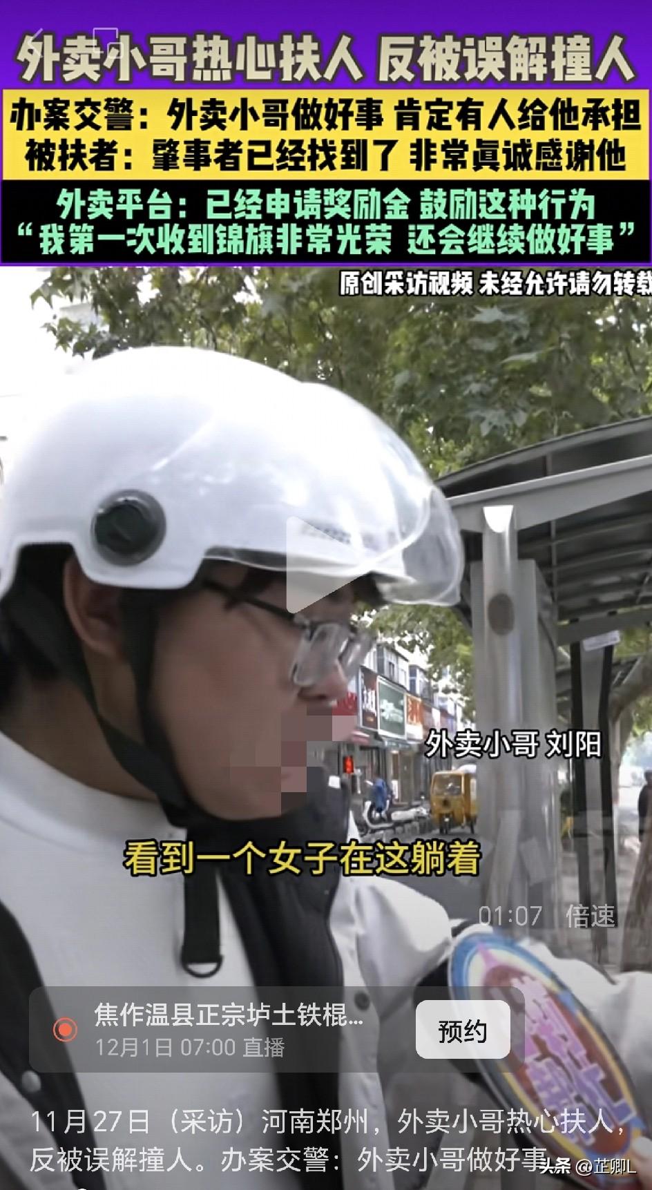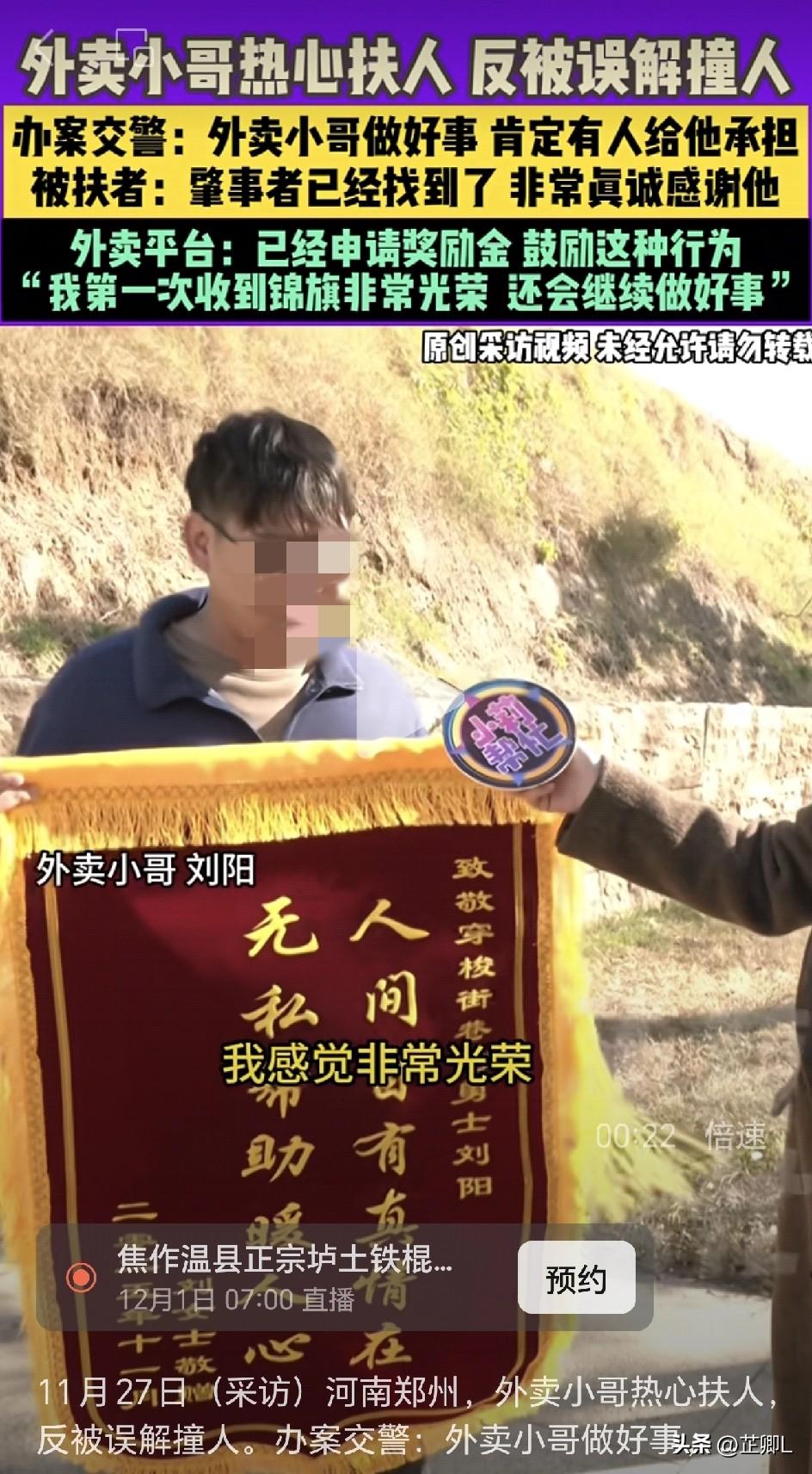 “扶不起”的时代,他偏要扶!外卖小哥好心扶人反被讹,结局让人暖心又解气! 当善良被反咬一口,我们是否还敢伸出援手? 在“扶不扶”已成灵魂拷问的今天,郑州外卖员刘阳,用他的本能善举,为我们上演了一场现实版的“好人好报”。 近日,河南郑州,外卖员刘阳在送餐过程中,发现有位女士躺在快车道,手上满是鲜血。看到这样的情景,刘阳本能的停下车。 心地善良的刘阳,没有犹豫,直接上前搀扶。却没想到,被女子一把抓住,“你撞了我,你不能走!” 女子的话,直接让小刘如坠冰窟。这好心扶人,怎么还给自己扶来了个大麻烦! 被扶的女子一口咬定是小刘撞了她,任凭小刘怎么解释,都没有用。而随后赶来的她的家人也拦着不让小刘离开。 甚至女子家属要求,“如果不是你撞的,你让警察给你开证明!”并且要小刘跟他们一起找肇事者。 而此时,因为纠纷,小刘的送餐电动车被扣,三单正在送的餐也超时了,再加上租车费、电瓶费等等,所有费用加一起差不多要1500元。 小刘自己是肾病综合症患者,每天都需要挣钱给自己买药治病。这次的纠纷,给小刘带来了很大的经济损失,也造成了很大的精神压力。 当小刘问:如果查出来不是我撞的你,你能否赔偿我?面对这个问题,女子没有回答。 很多时候,我们不怕做好事,怕的是做好事的代价我们承担不起。刘阳的困境,是我们每个人都可能遇到的恐惧。 所幸,人间自有公道在!有目击者证明,小刘是做好事扶人,不是肇事者。 警方也从监控中查明,“从监控上看,外卖小哥是做好事,赔偿应该被扶者承担。” 最终,真相如同阳光,驱散了所有阴霾。小刘是百分百的好人好事,而肇事者也已经找到。 被扶女子的态度也大幅度转弯,她解释称:“对不起,那天我断片了,记不清楚了。”误将好心人当成了肇事者。 女子将1500元损失补给了小刘,并送了一面锦旗,表达对小刘的感谢和歉意。 而外卖平台在知道了小刘的事迹后,第一时间为小刘申请了奖励金,鼓励这种助人为乐的行为。 一面锦旗,一份奖励,一句道歉,都让经历了无端被冤枉的小刘感受到了春暖花开。 当被温暖包围的刘阳,拿着锦旗笑着说:“我第一次收到锦旗非常光荣,还会继续做好事。” 我们看到了:善良在经过风雨洗礼后,没有被浇灭,反而因社会的正反馈而变得更加坚定。 这面锦旗,不仅是给他的褒奖,更是给所有心怀善意的人的一剂强心针——这个世界,终究会守护那些选择温暖它的人。 信息来源于小莉帮忙,侵联删!