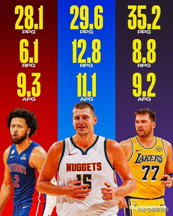 联盟第三巨星,康宁汉姆成为联盟第三位场均可以拿到27+6+9的巨星! NBA新赛季已经进行了1/4了,不少球星都打出了巅峰表现,成为了MVP最大热门: 亚历山大场均可以拿到32.6分4.9篮板6.6助攻的数据; 东契奇场均可以拿到35.2分8.8篮板9.2助攻的数据; 约基奇场均可以拿到29.6分12.8篮板11.1助攻的三双数据; 最意外的是康宁汉姆,场均可以拿到28.1分6.1篮板9.3助攻的数据,成为了联盟目前仅有的可以拿到27+6+9的三位巨星之一。 目前活塞高居东部第一,康宁汉姆已经成为了MVP热门球员了,如果活塞能保持到常规赛结束依然是东部第一,那么MVP给康宁汉姆可以说实至名归了,毕竟东契奇,约基奇,亚历山大的球队本来就强。