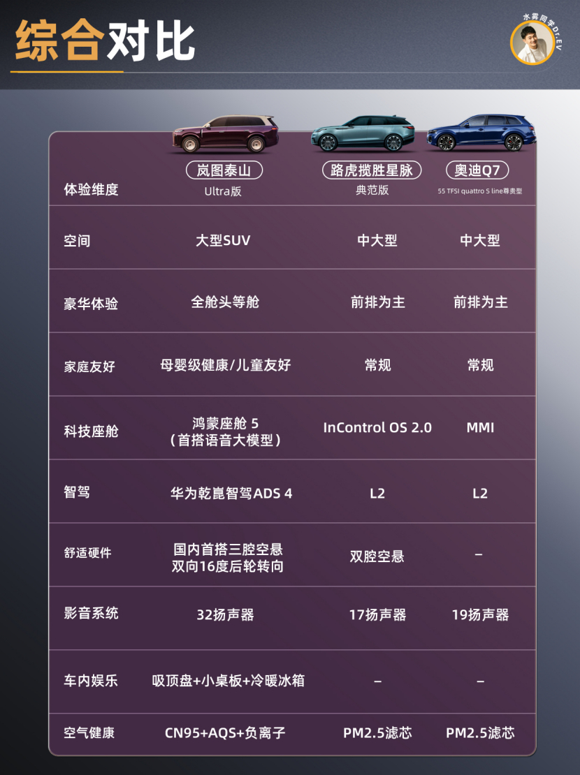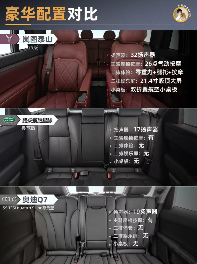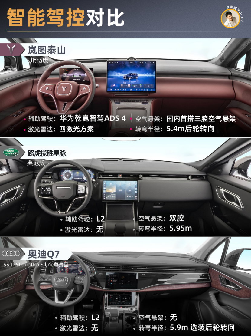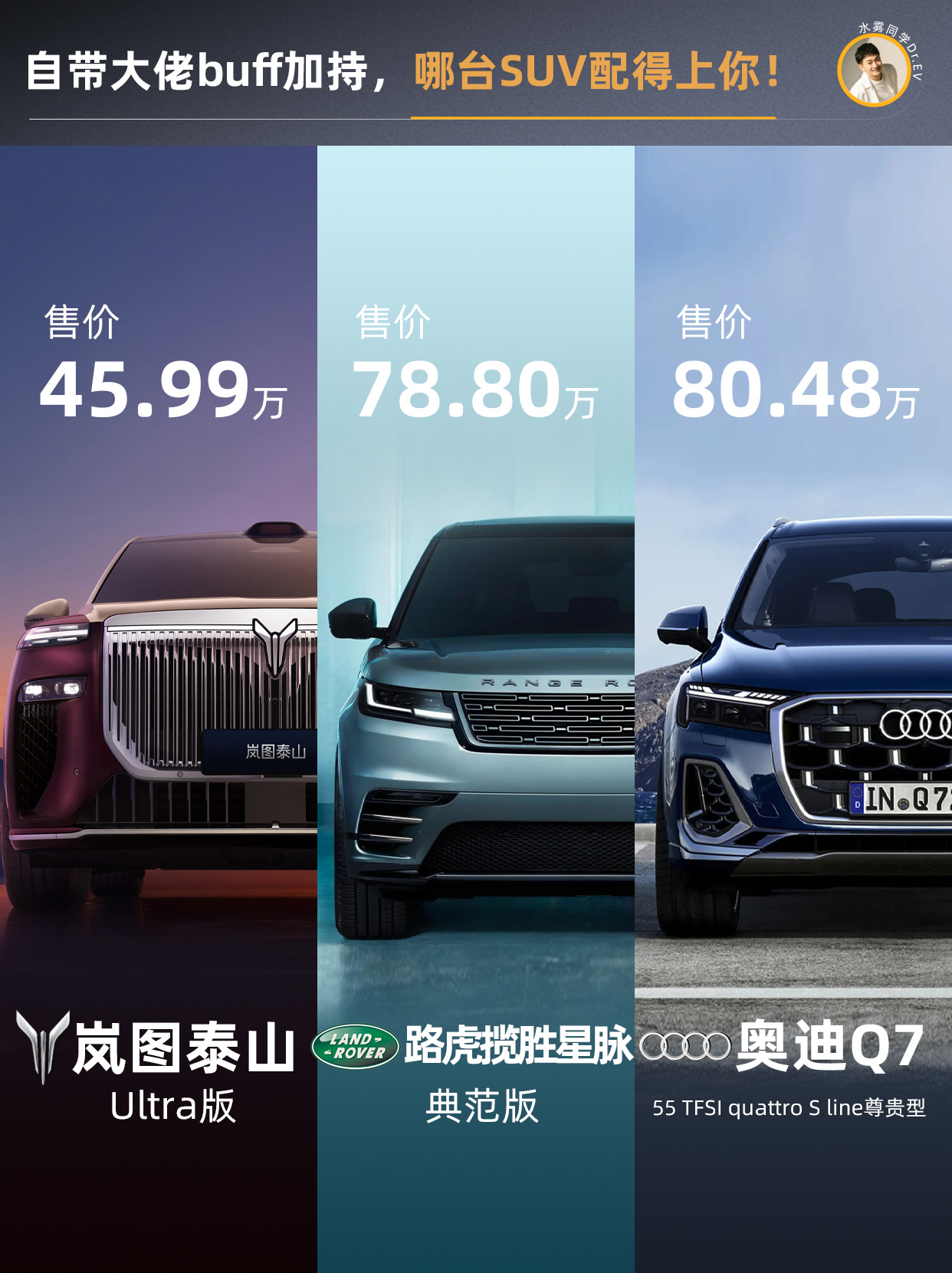 买一台豪华大型SUV,新能源还是燃油车?⭐【底盘质感】✅ 岚图泰山:走的是沉稳加舒展的新旗舰风格。国内首搭三腔空气悬架,调节度高支撑性强;EDC智能魔毯能把细碎震动抹得很干净。搭配双向16°后轮转向,打破大车必笨拙的现象。✅ 路虎揽胜:悬架调校更偏运动特性,路感更直接,开起来是典型英伦旗舰的力量感豪华。✅ 奥迪Q7:前后五连杆独立悬架采用轻量化铝合金,配合自适应空气悬挂,在保持路感清晰的同时能有效过滤细碎颠簸,城市通勤也能保持轿车般的沉稳。⭐【智能座舱】✅ 岚图泰山:搭载鸿蒙座舱5(首搭语音大模型),语音理解快、说话断句也能领会。55英寸AR HUD加智慧投影大灯,仪式感拉满,再也不用低头看屏幕了。AI云舒座椅可根据人体坐姿变化自适应调整加26点按摩,长途明显轻松许多。✅ 路虎揽胜:座椅功能标配了前排座椅电动调节、前排座椅加热;并且还提供了前排座椅通风和主驾座椅记忆,豪华感更多来自设计、材质和气场,前排质感强,智能化更克制。✅ 奥迪Q7:内饰做工与可靠性仍是德系强项,用起来顺手稳定。高端车型也提供了氛围灯、按摩座椅等高级配置。⭐【智驾能力】✅ 岚图泰山:搭载华为乾崑智驾ADS 4,Ultra版本采用四激光雷达方案,属于全球唯二的规格。拥堵、匝道衔接、高速连续替代驾驶都很自然。✅ 星脉的智驾定位偏向传统豪华取向,主要提供 ACC、自适应巡航、车道偏离辅助等基础能力,强调的是稳定与连续性,对驾驶者参与度要求更高。✅Q7 的智驾风格也以传统豪华品牌的稳定策略为主,功能覆盖常用项目,如 ACC、车道保持、交通拥堵辅助等。操作逻辑清晰、介入自然,适合习惯欧洲品牌驾驶调性的用户。⭕你更认可哪种豪华?是泰山这种将智能+底盘+能效融合出的新旗舰感?还是路虎揽胜的英伦设计气场、Q7的德系稳重与经典豪华?奥迪岚图泰山路虎揽胜新能源大牛说