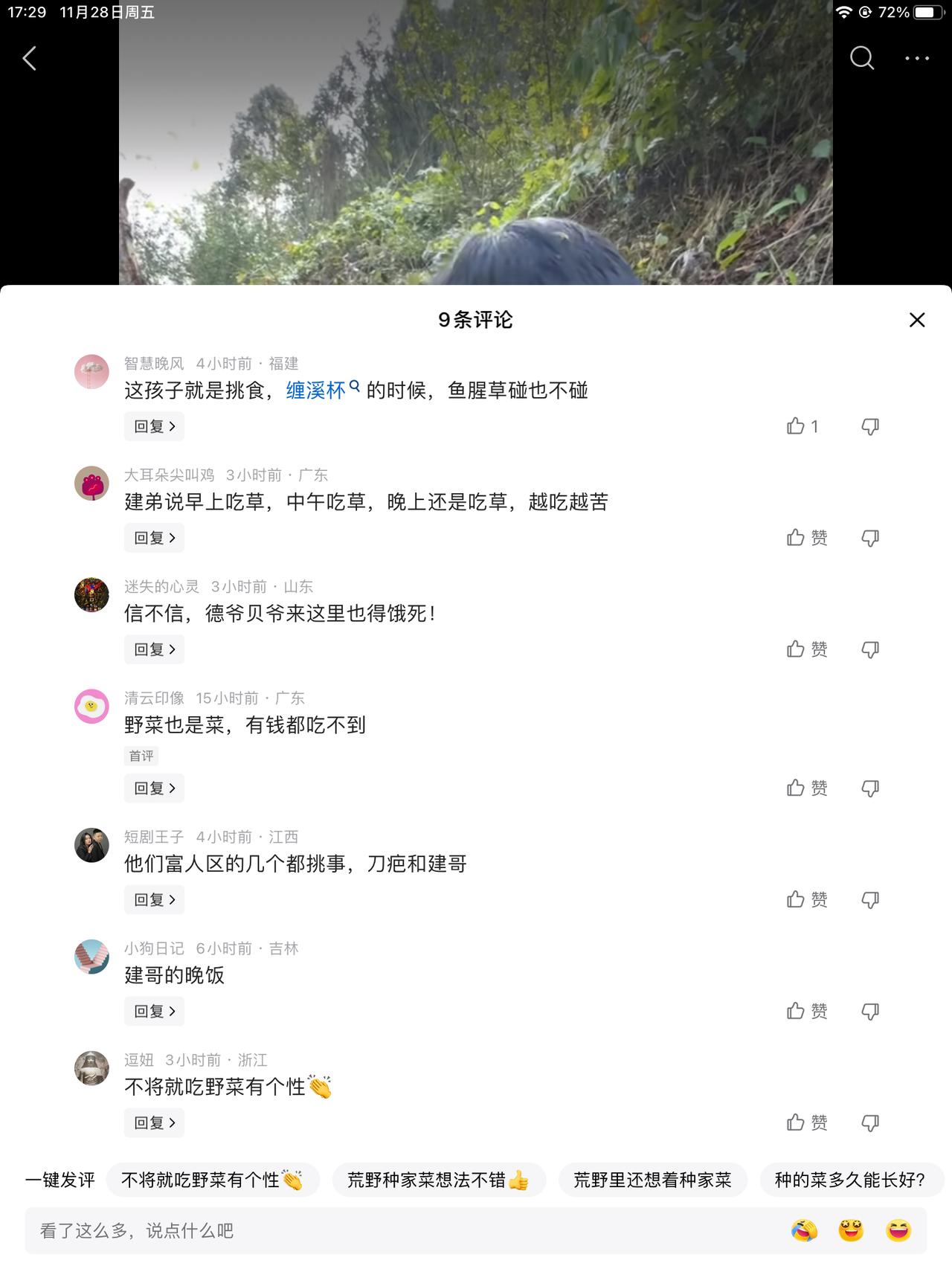 有人的地方就有江湖,你看荒野求生,才剩几个人比赛,还分个富人区,贫民窟。笑死了。野菜不好吃,建哥宁肯饿肚子,也不吃野菜。挑食啊! 刀疤哥说没有了荒野三件套,看他们吃什么!刀疤哥有下套,偶尔逮个野味吃吃。再加上芭蕉心,和棕榈芯。 苗王就不一样了,苗王是最适合荒野求生的。他那个嘴,一刻不停,什么都吃。真是传说中的铁嘴铁胃铁肠子铁屁眼。能吃,还得能看出来。 文车车说过,半决赛的最后一炮💩,真是印象深刻,太难搞下来了。 荒野,真是苦啊!能苦中作乐的,真是人才。还不能内耗,别看简单,真得全心全意把自己喂饱。