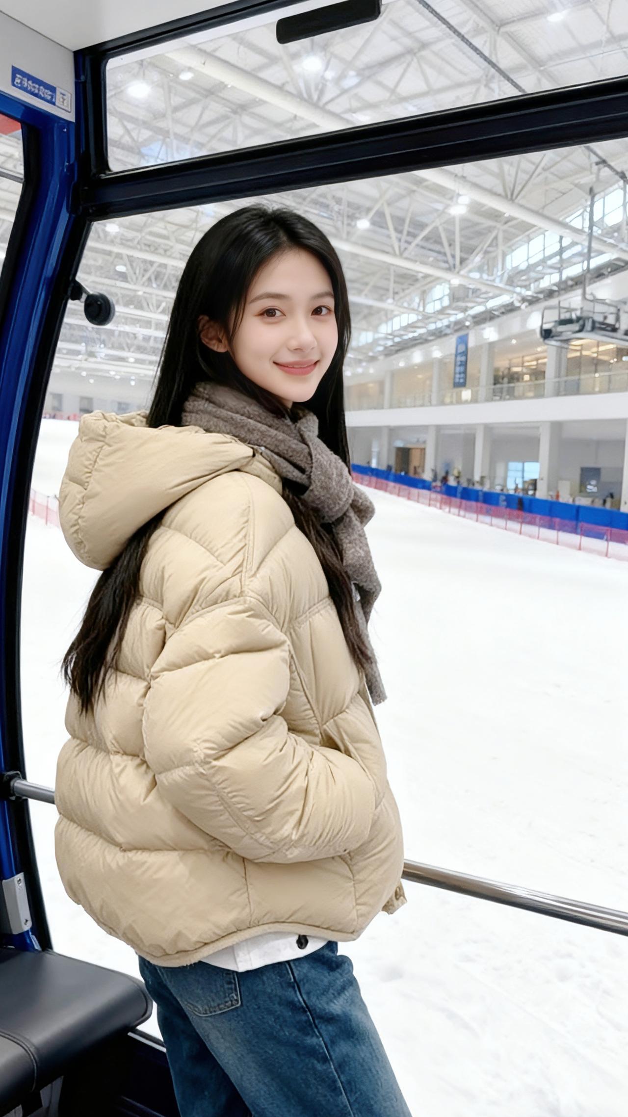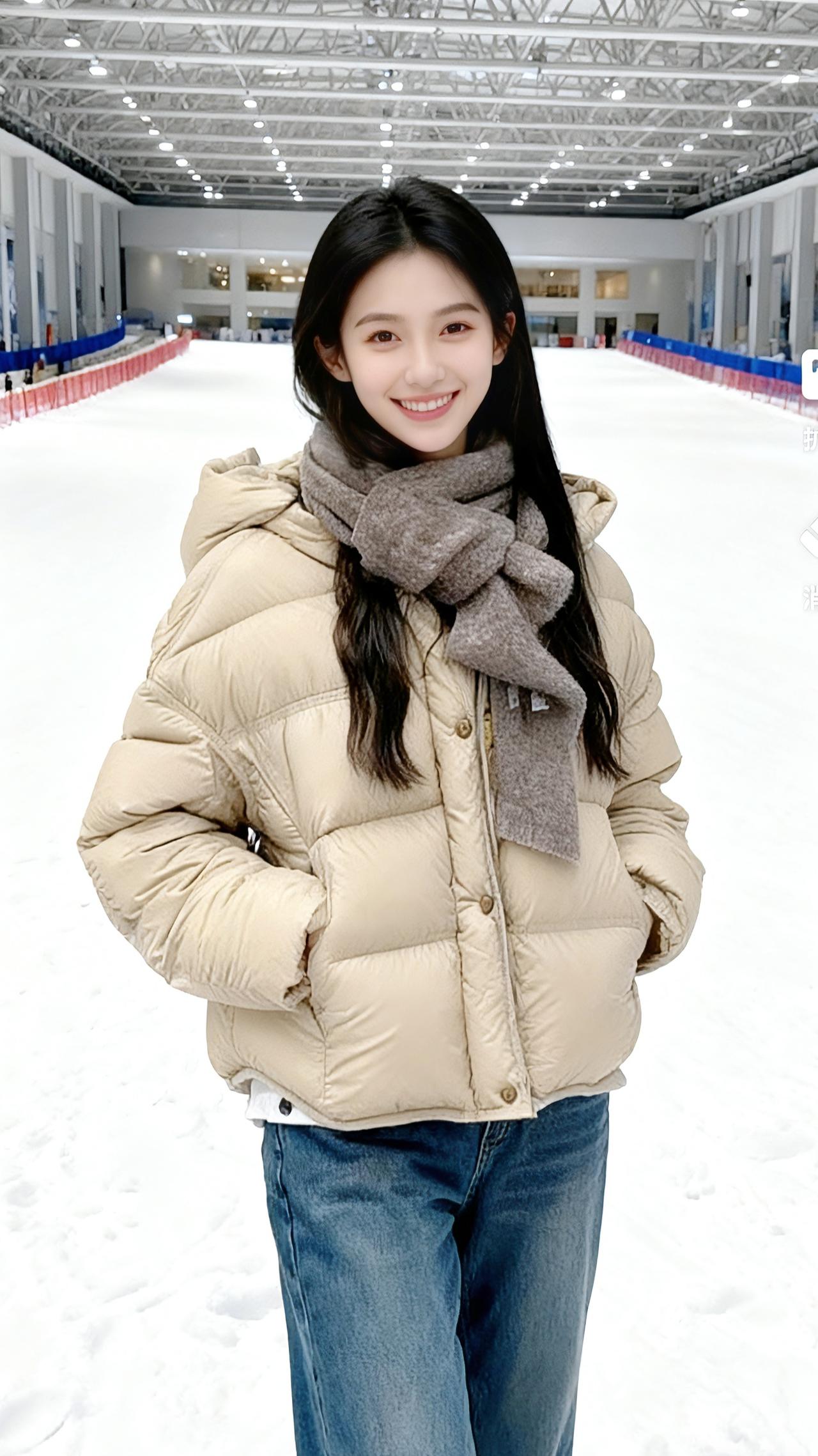 冬日的室内雪场像被揉碎的月光铺成的长卷,她裹着米杏色的蓬松羽绒服,围巾是浅褐的软