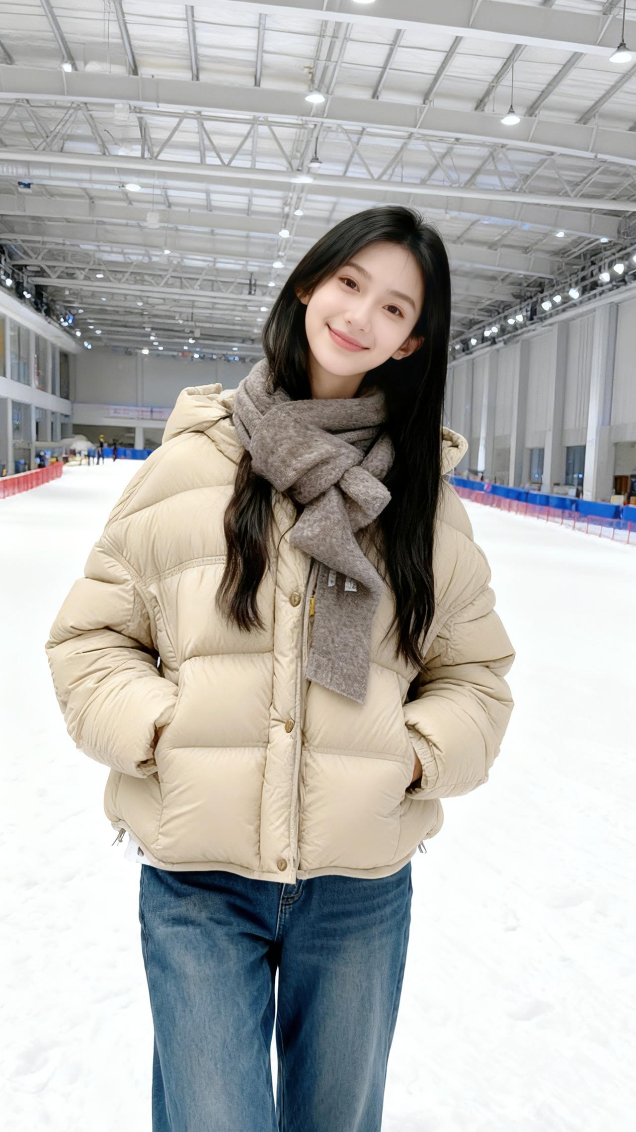 冬日的室内雪场像被揉碎的月光铺成的长卷,她裹着米杏色的蓬松羽绒服,围巾是浅褐的软云,坠在发间。 雪道尽头的光漫过来,把她的笑浸得温软——像雪粒子落在围巾上,轻得没有声响,却让整个场馆的冷意都弯了腰。 她把手揣进衣兜时,羽绒服的褶皱里漏出点白衬衫的边,像雪地里刚冒头的春芽;比耶的指尖晃了晃,连空气里的冰屑都跟着亮起来。后来她坐在长椅上,身后的雪道像条安静的河,有人在上面滑出细碎的浪,而她是岸边晒着太阳的树,连发梢都裹着暖。 这冬天哪有什么凛冽,不过是她往那儿一站,就把所有寒意都酿成了软乎乎的甜。 高级感穿搭 冬季穿搭 小个子穿搭 羽绒服穿搭