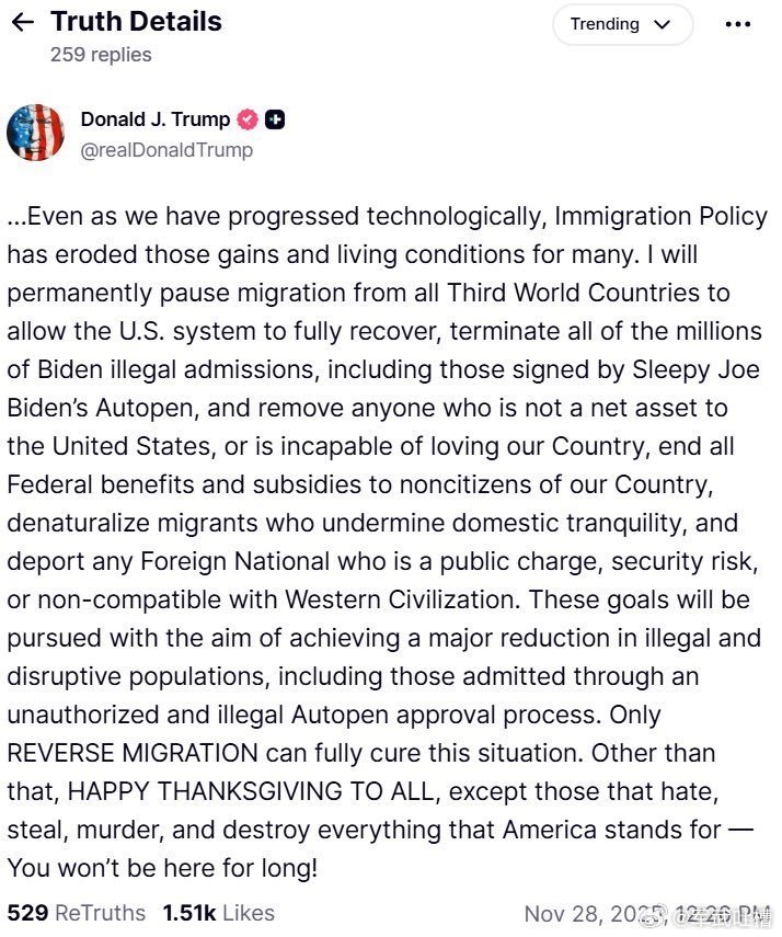 润人们的天塌了,特朗普称将永久禁止第三世界移民进入美国,而且就算进入美国,没有美国身份,也要结束一切福利待遇,那些依靠救助活着的润人们还要被赶出去我现在只有一个愿望,坚决不能接收这些垃圾!