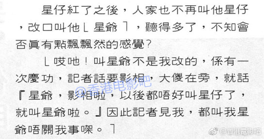 周星驰被叫星爷的原因 以前考古过,成奎安第一个叫“星爷”。周星驰:「叫星爷不是我改的,是有一次庆功宴,记者说要照相,大傻在旁边,就说『星爷,影相啦!以后都不要叫星仔了,就叫星爷啦!』因此记者见到我,就都叫我星爷了不关我的事呀!」