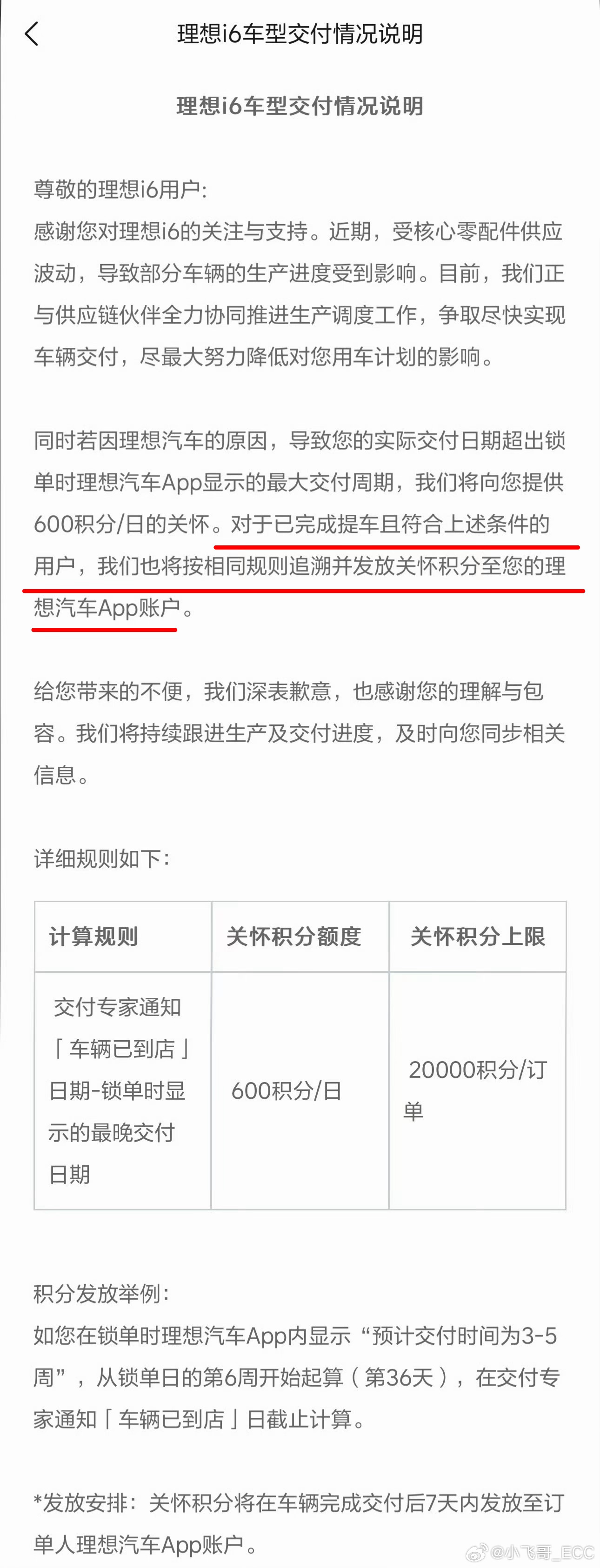 理想i6产能的问题交付延期推出了用户关怀方案。理想汽车提供600积分/日的关怀,20000积分封顶。对已经提车用户切符合条件的,也可以追溯相应的积分。