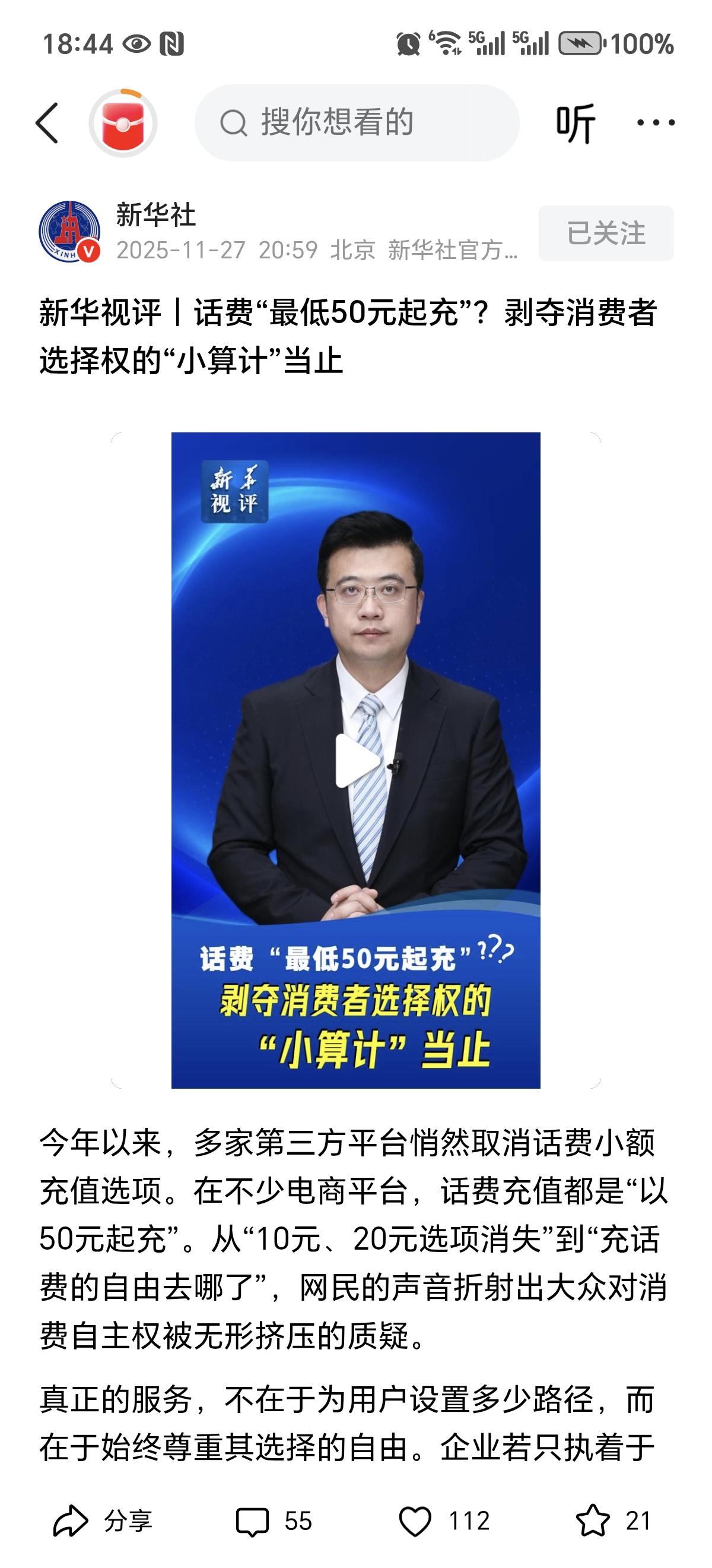 新华社为民发声,太棒啦! 各平台莫名其妙地取消了小额充话费,真的很无耻,但消费者也很无奈。 不信官媒发声后,各平台还不整改,坐等结果中…