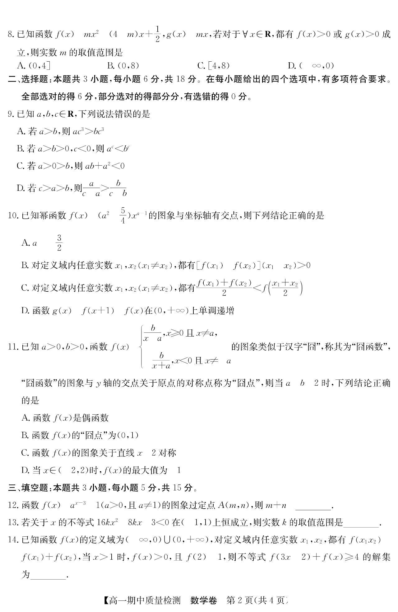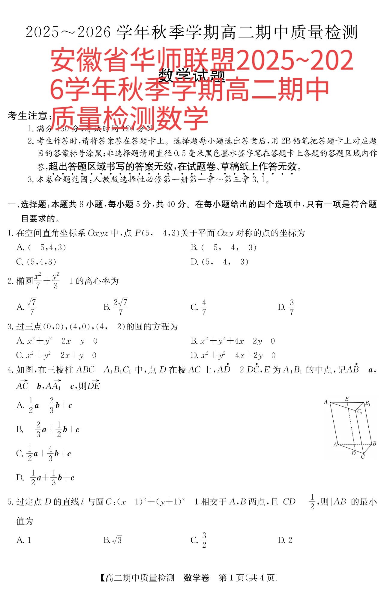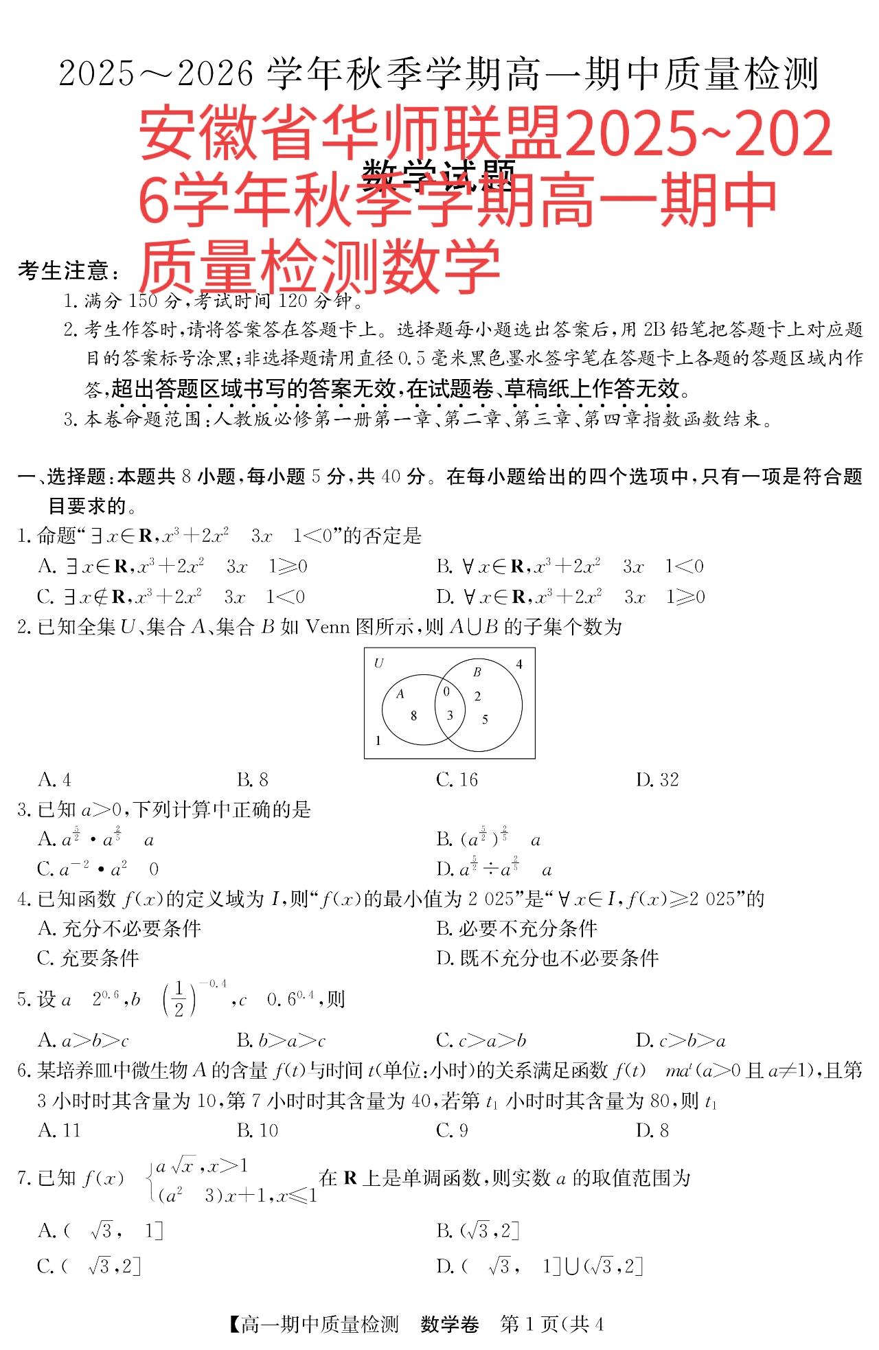 安徽省华师2025年联盟高一高二数学上期中单选题多选题填空题及其详细解答。