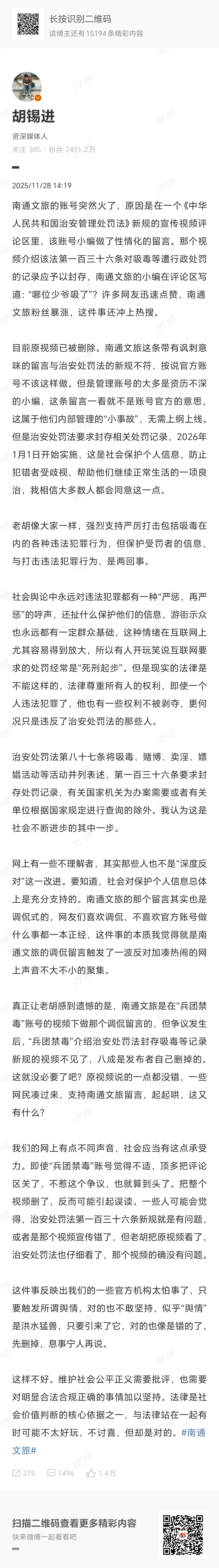 【发文称,南通文旅的账号突然火了,原因是在一个《中华人民共和国治安管理处罚法》新规的宣传视频评论区里,该账号小编做了性情化的留言。那个视频介绍该法第一百三十六条对吸毒等遭行政处罚的记录应予以封存,南通文旅的小编在评论区写道:“哪位少爷吸了”?许多网友迅速点赞,南通文旅粉丝暴涨,这件事还冲上热搜。目前原视频已被删除。南通文旅这条带有讽刺意味的留言与治安处罚法的新规不符,按说官方账号不该这样做。但是管理账号的大多是资历不深的小编,这条留言一看就不是账号官方的意思,这属于他们内部管理的“小事故”,无需上纲上线。但是治安处罚法要求封存相关处罚记录,2026年1月1日开始实施,这是社会保护个人信息,防止犯错者受歧视,帮助他们继续正常生活的一项良治,我相信大多数人都会同意这一点。老胡像大家一样,强烈支持严厉打击包括吸毒在内的各种违法犯罪行为,但保护受罚者的信息,与打击违法犯罪行为,是两回事。社会舆论中永远对违法犯罪都有一种“严惩,再严惩”的呼声,还扯什么保护他们的信息,游街示众也永远都有一定群众基础,这种情绪在互联网上尤其容易得到放大,所以有人开玩笑说互联网要求的处罚经常是“死刑起步”。但是现实的法律是不能这样的,法律尊重所有人的权利,即使一个人违法犯罪了,他也有一些权利不被剥夺,更何况只是违反了治安处罚法的那些人。治安处罚法第八十七条将吸毒、赌博、卖淫、嫖娼活动等活动并列表述,第一百三十六条要求封存处罚记录,有关国家机关为办案需要或者有关单位根据国家规定进行查询的除外。我认为这是社会不断进步的其中一步。网上有一些不理解者,其实那些人也不是“深度反对”这一改进。要知道,社会对保护个人信息总体上是充分支持的。南通文旅的那个留言其实也是调侃式的,网友们喜欢调侃,不喜欢官方账号做什么事都一本正经,这件事的本质我觉得就是南通文旅的调侃留言触发了一波反对加凑热闹的网上声音不大不小的聚集。真正让老胡感到遗憾的是,南通文旅是在“兵团禁毒”账号的视频下做那个调侃留言的,但争议发生后,“兵团禁毒”介绍治安处罚法封存吸毒等记录新规的视频不见了,八成是发布者自己删掉的。这就没必要了吧?原视频说的一点都没错,一些网民凑过来,支持南通文旅留言,起起哄,这又有什么?我们的网上有点不同声音,社会应当有这点承受力。即使“兵团禁毒”账号觉得不适,顶多把评论区关了,不惹这个争议,也就算到头了。把整个视频删了,反而可能引起误读。一些人可能会觉得,治安处罚法第一百三十六条新规就是有问题,或者是那个视频宣传错了,但老胡把原视频看了,治安处罚法也仔细看了,那个视频的确没有问题。这件事反映出我们的一些官方机构太怕事了,只要触发所谓舆情,对的也不敢坚持,似乎“舆情”是洪水猛兽,只要引来了它,对的也像是错的了,先删掉,息事宁人再说。这样不好。维护社会公平正义需要批评,也需要对明显合法合规正确的事情加以坚持。法律是社会价值判断的核心依据之一,与法律站在一起有时可能不太好玩,不讨喜,但却是对的。#南通文旅# #胡锡进谈南通文旅火了# #2026年起吸毒记录可封存#