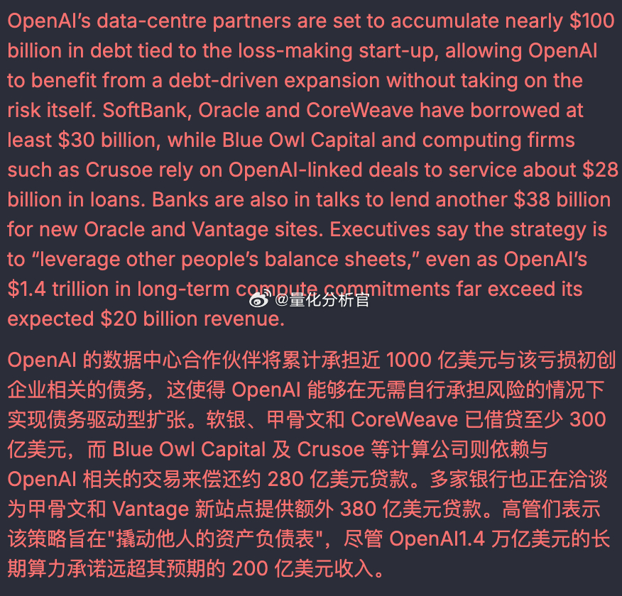 可不可以让阿里吴永铭来点评下?他怎么看OpenAI 能够在无需自行承担风险的情况下实现债务驱动型扩张?咱看待这种"撬动他人的资产负债表"的行为?这是没有任何泡沫的迹象吗?A股美股