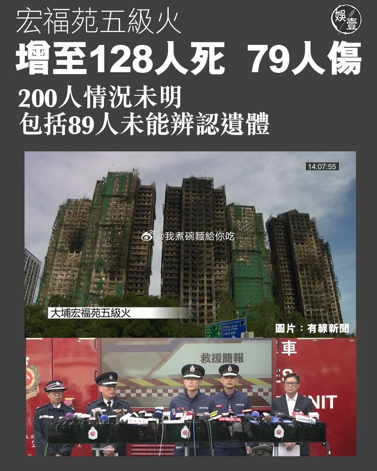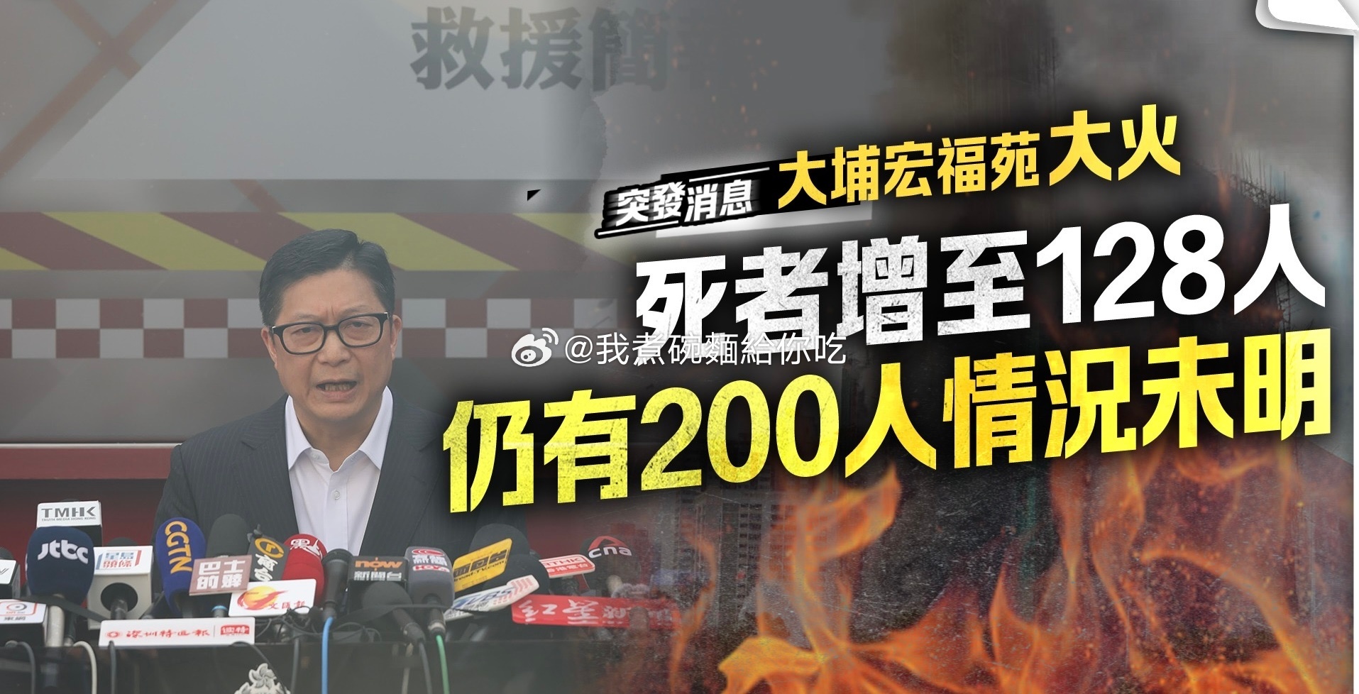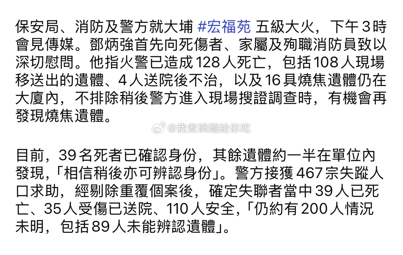 大埔宏福苑五级火灾|增至128人死 79人伤.火灾已造成128人死亡,包括108人现场移送出的遗体、4人送院后不治,以及16具烧焦遗体仍在大厦内,不排除稍后警方进入现场搜证调查时会再发现烧焦遗体。目前,39名死者已确认身份,其余遗体约一半在单位内发现,「相信稍后亦可辨认身份」。警方接获467宗失踪人口求助,经剔除重复个案后,确定失联者当中39人已死亡、35人受伤已送院、110人安全,「仍约有200人情况未明,包括89人未能辨认遗体」。