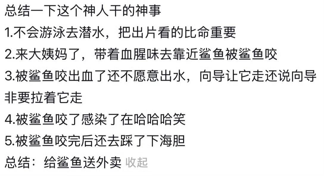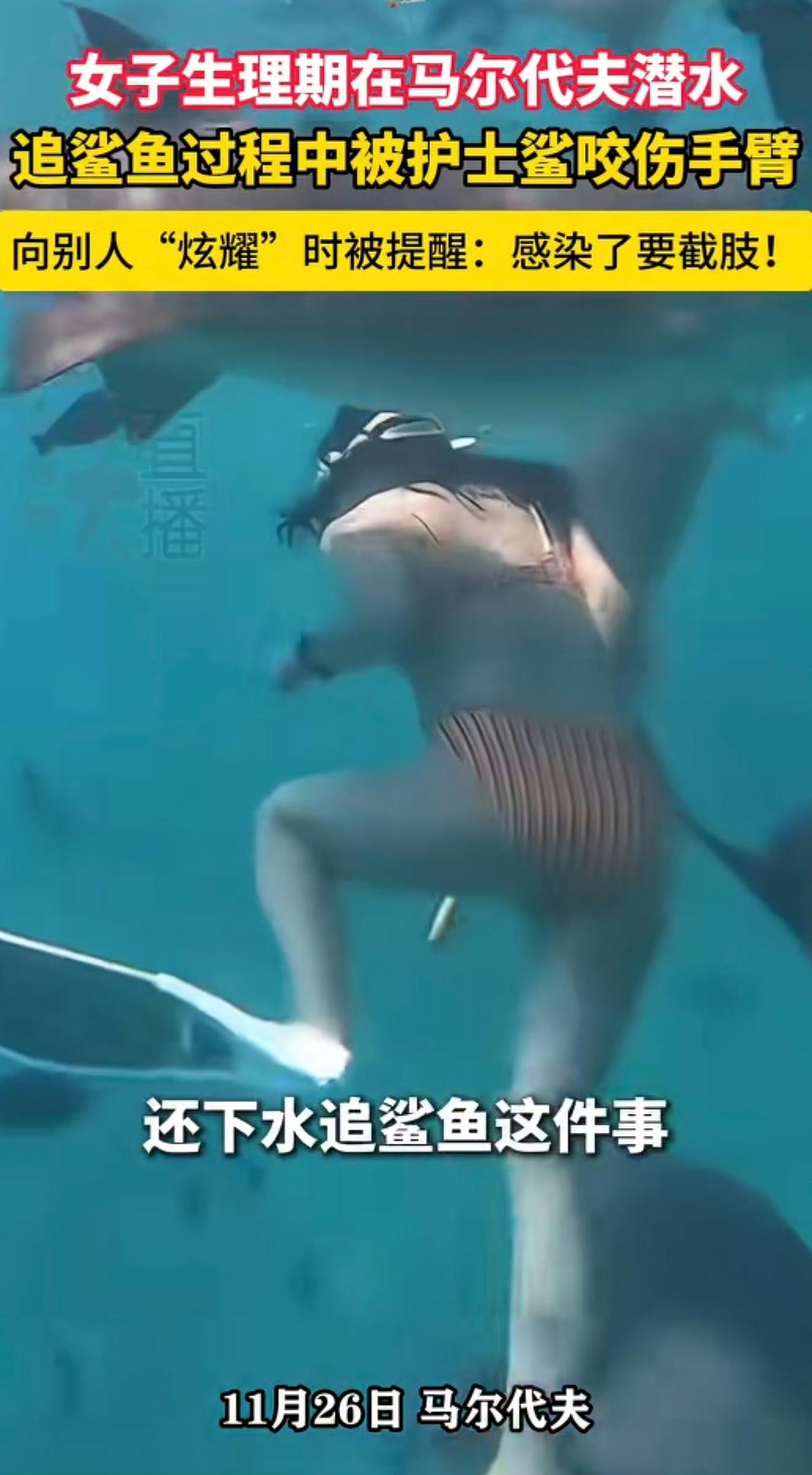 马尔代夫一姑娘生理期去潜水,就塞了个卫生棉条,啥额外防护都没有,这本身就够冒险的了。更让人无语的是,她还戴个银色反光手链,鲨鱼本来就对反光的东西敏感,这不相当于把鲨鱼往自己身边引吗?不光这样,她还追着温顺的护士鲨跑,学着投食的样子招惹人家,人家被逼急了才咬她,这不是自己找事儿是什么?为了发朋友圈的九宫格,连命和自然规律都抛到脑后了,真让人无法理解。 被鲨鱼咬出个窟窿似的伤口,手腕流得全是血,朋友好心提醒她,说搞不好会感染截肢,她倒好,轻描淡写地笑着说“哈哈哈,然后呢?”。简单缠了两下纱布,居然又扎回海里接着拍,结果又踩中海胆,二次受伤。第二天还说直接坐飞机回家涂碘伏就行,压根没想着及时去医院。我看着都替她捏一把冷汗,鲨鱼嘴里全是食肉菌,24小时内不正规治疗,截肢率都超70%,败血症死亡率更是一半,这不是无知,是实打实的鲁莽! 好在目前检查没查出创伤弧菌,但这细菌有7天潜伏期,风险还没完全过。说实话,这事儿不光是她自己逞强,潜水项目也有问题,没提醒摘反光饰品,潜导也没拦着她生理期下水,行业的安全漏洞也得补上。 流量再香,也不如一条胳膊、一条命金贵。别把无知当勇敢,别把冒险当噱头,大自然可从不惯着那些赌命博眼球的人。希望她能平安熬过潜伏期,也给所有爱拍大片、爱冒险的人提个醒:敬畏自然,才是做人最基本的底线。女子为出片生理期潜水被鲨鱼咬伤 生理期下水 鲨鱼