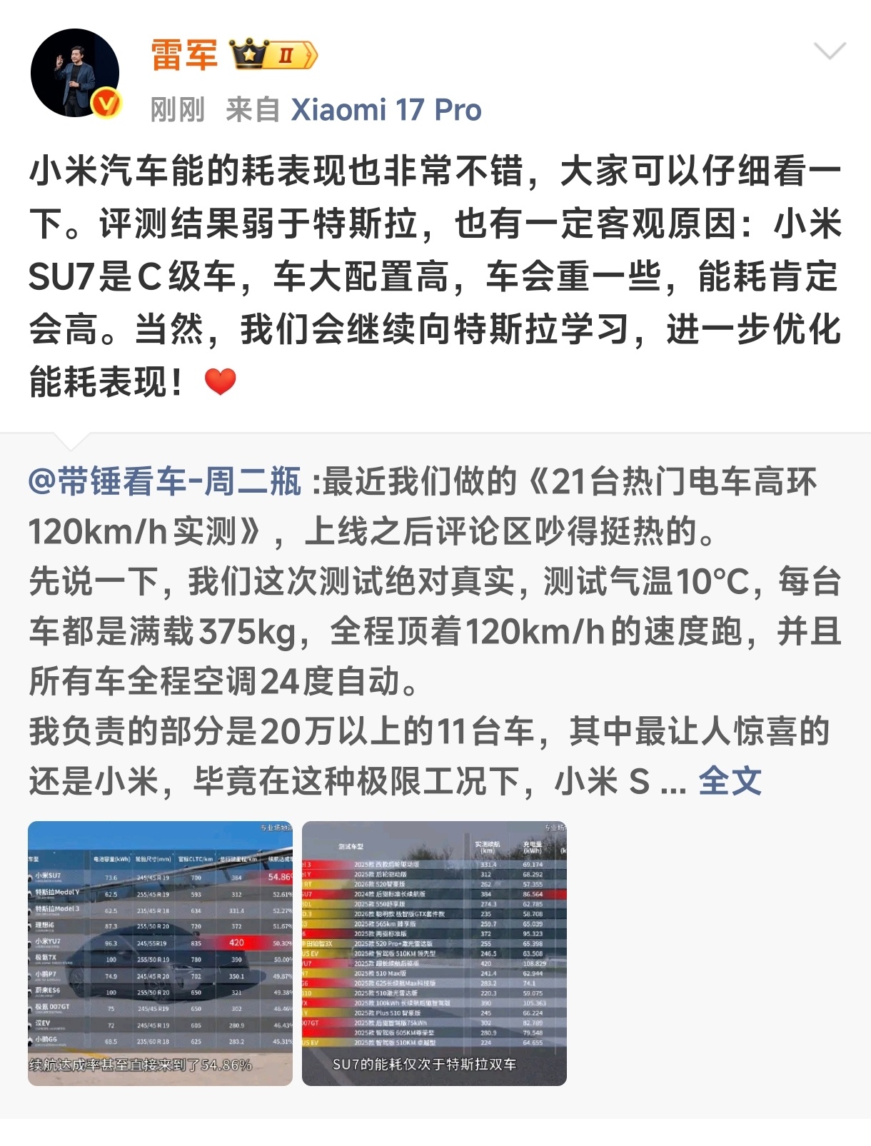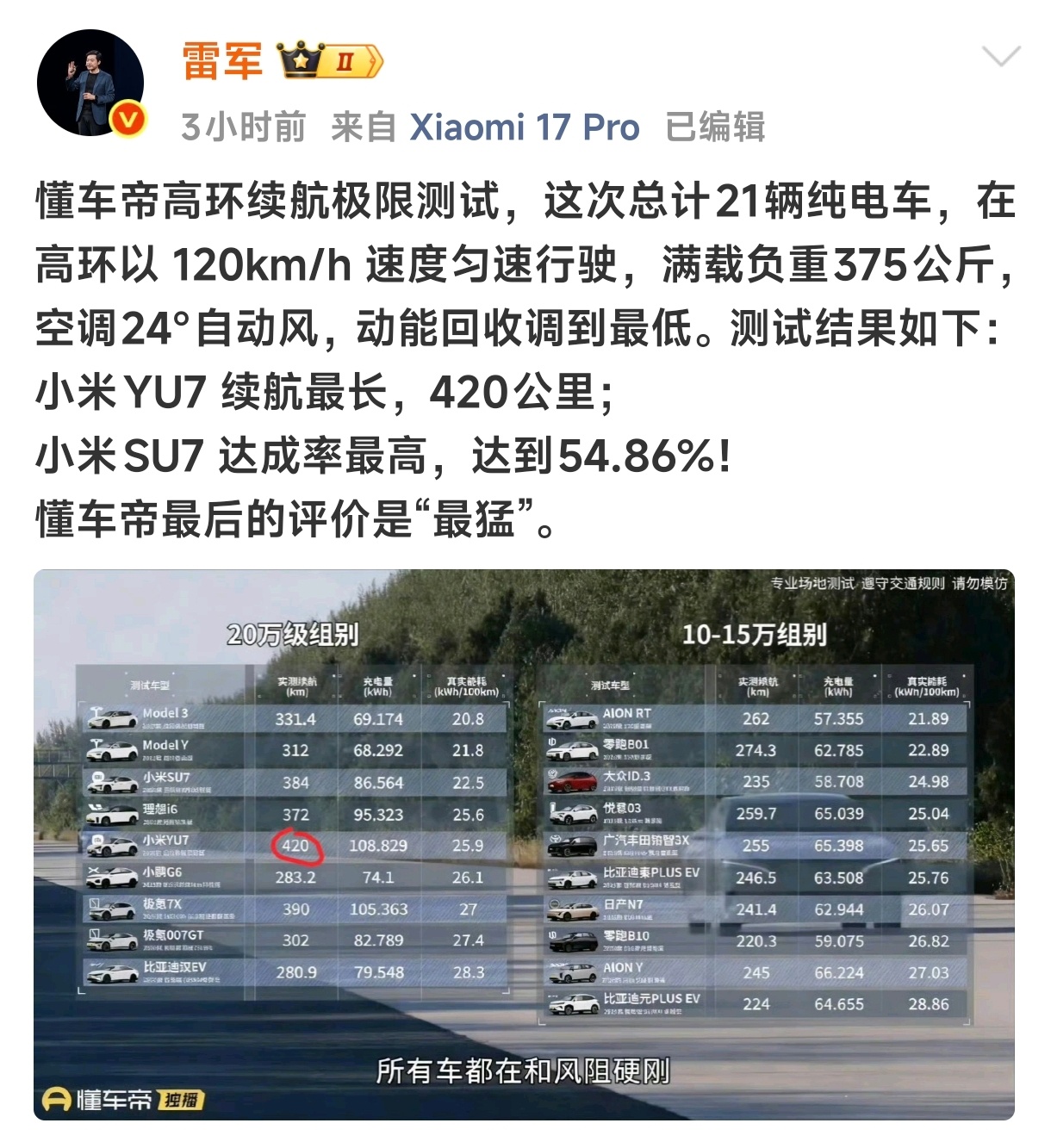 雷军回应小米汽车续航测试不管雷军亲自回应懂车帝续航测试有何目的,小米汽车的续航及达成率确实非常优秀没得黑啊有时候我真的觉得小米可能真的是因为车子造的太优秀,所以舆论才差。因为某些人真的怕了,无法从量化的数据上打败你,那就妄图通过舆论压制你。懂车帝的测试可以看到,高环 120 这种场景,小米YU7、SU7分别拿下续航第一和达成率第一,两项指标都是全场第一。没记错的话,之前易车的冬测,小米的成绩就很强。这样的成绩可真不是堆参数就能做得出来,这还是考验电控、空气动力学和整套能量管理能力,小米用量化的硬实力再次为自己正名,别再听网上黑子胡说八道了。