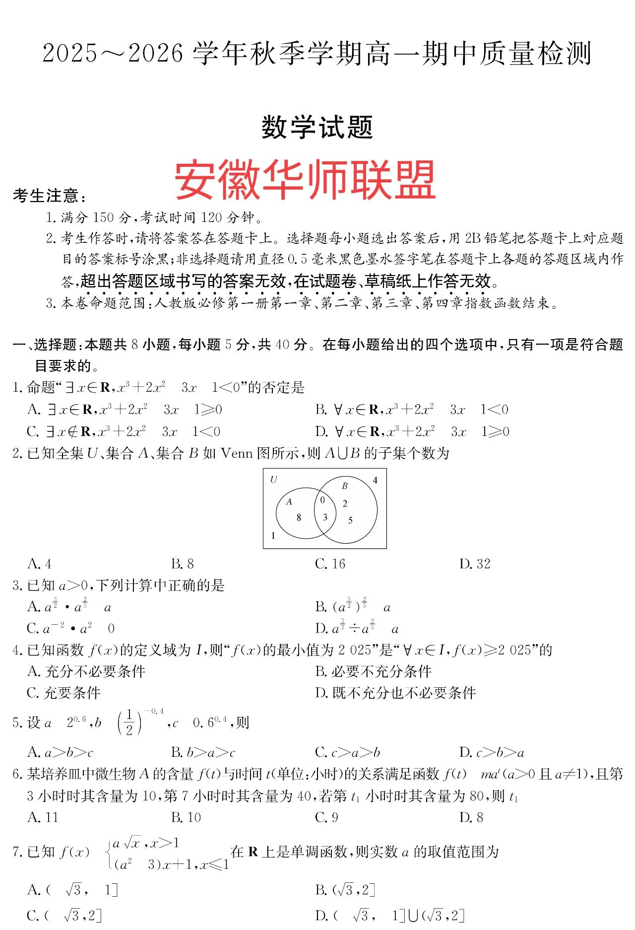 安徽省华师2025年联盟高一高二数学上期中单选题多选题填空题及其详细解答。