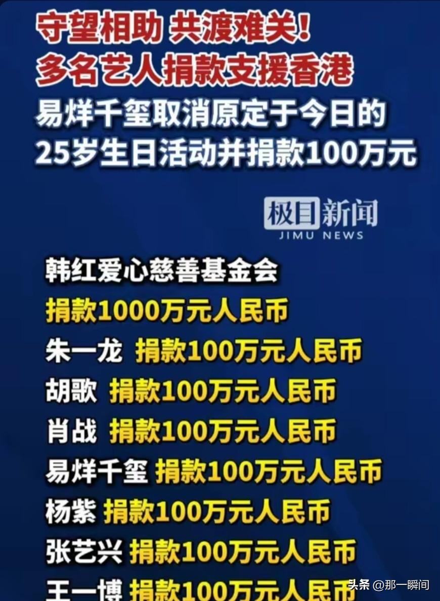 多名艺人捐款支援香港 朱一龙 捐款100万 胡歌 捐款100万 肖战 捐款100万 易烊千玺 捐款100万 杨紫 捐款100万 张艺兴 捐款100万 王一博 捐款100万 周深 捐款100万 华晨宇 捐款100万 王嘉尔 捐款100万港元 张柏芝 捐款100万港元 张杰谢娜 捐款100万 李荣浩夫妇 捐款100万 张智霖夫妇 捐款100万港元 陈小春夫妇 捐款100万港元 易烊千玺还取消了原定的生日活动,难怪那么多人喜欢他。 反正每一次都有韩红爱心慈善基金会,这次也是1000万。 很多人没想到的是蜜雪冰城会捐款2000万港元这么多,而且还是首批。 这次很多企业和艺人等伸出了援手,希望他们能够度过难关吧。