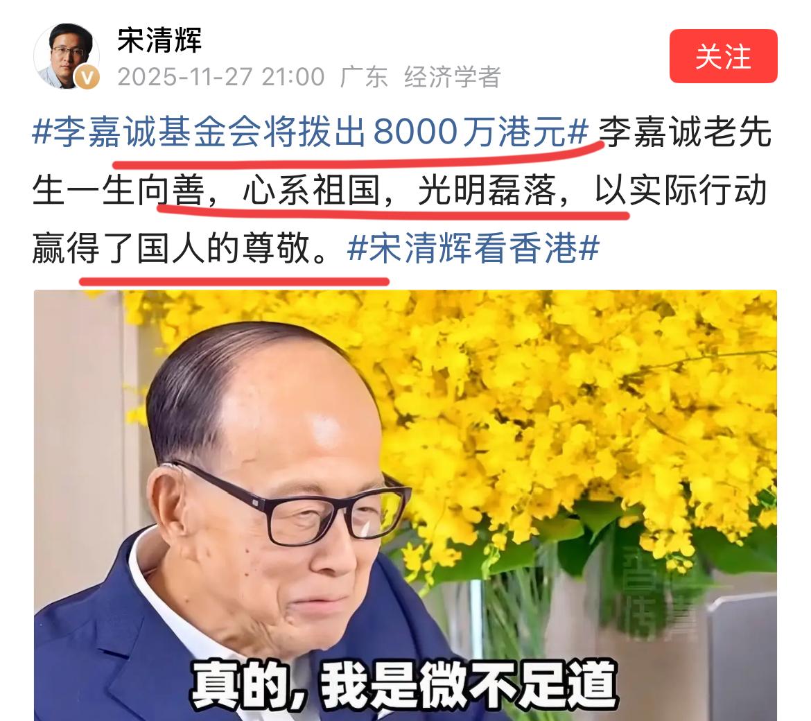 著名经济学家宋清辉老师这次说得没错! 香港火灾之后,超人立马捐款8000万港币,支持房屋的维修!! 宋老师说,超人一生向善,光明磊落,心系祖国,他用行动赢得了国人的尊重~ 这次教训是深刻的! 一次火灾把问题都暴露出来,说明香港问题也确实很多,很严重~ 有人说,香港的观念越来越落后了,已经完全跟不上时代的快速发展了~ 希望重伤失踪的人能尽快被找到!!