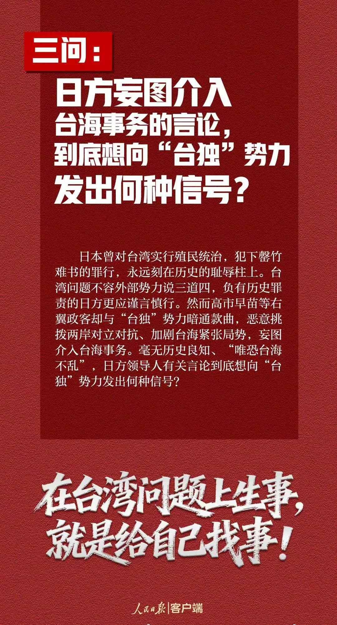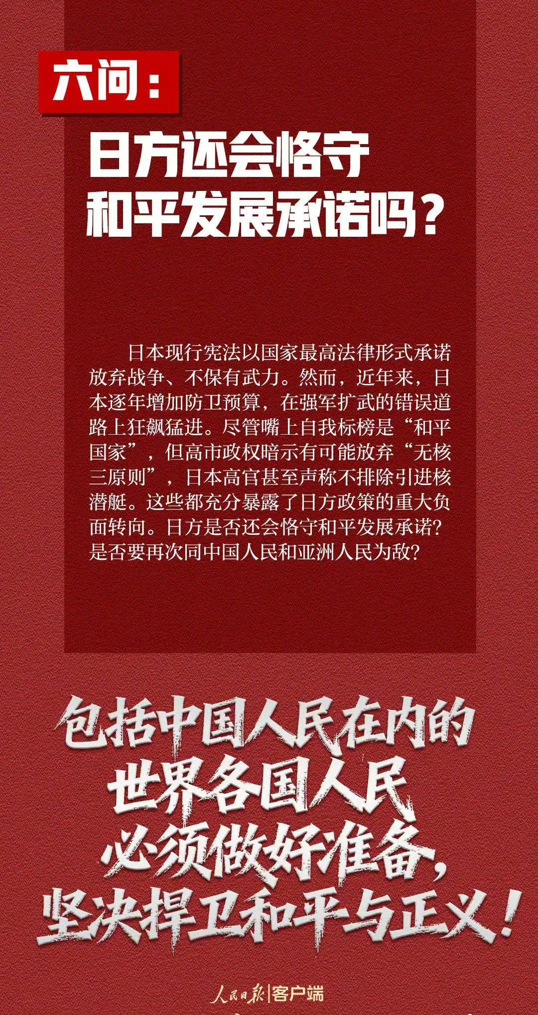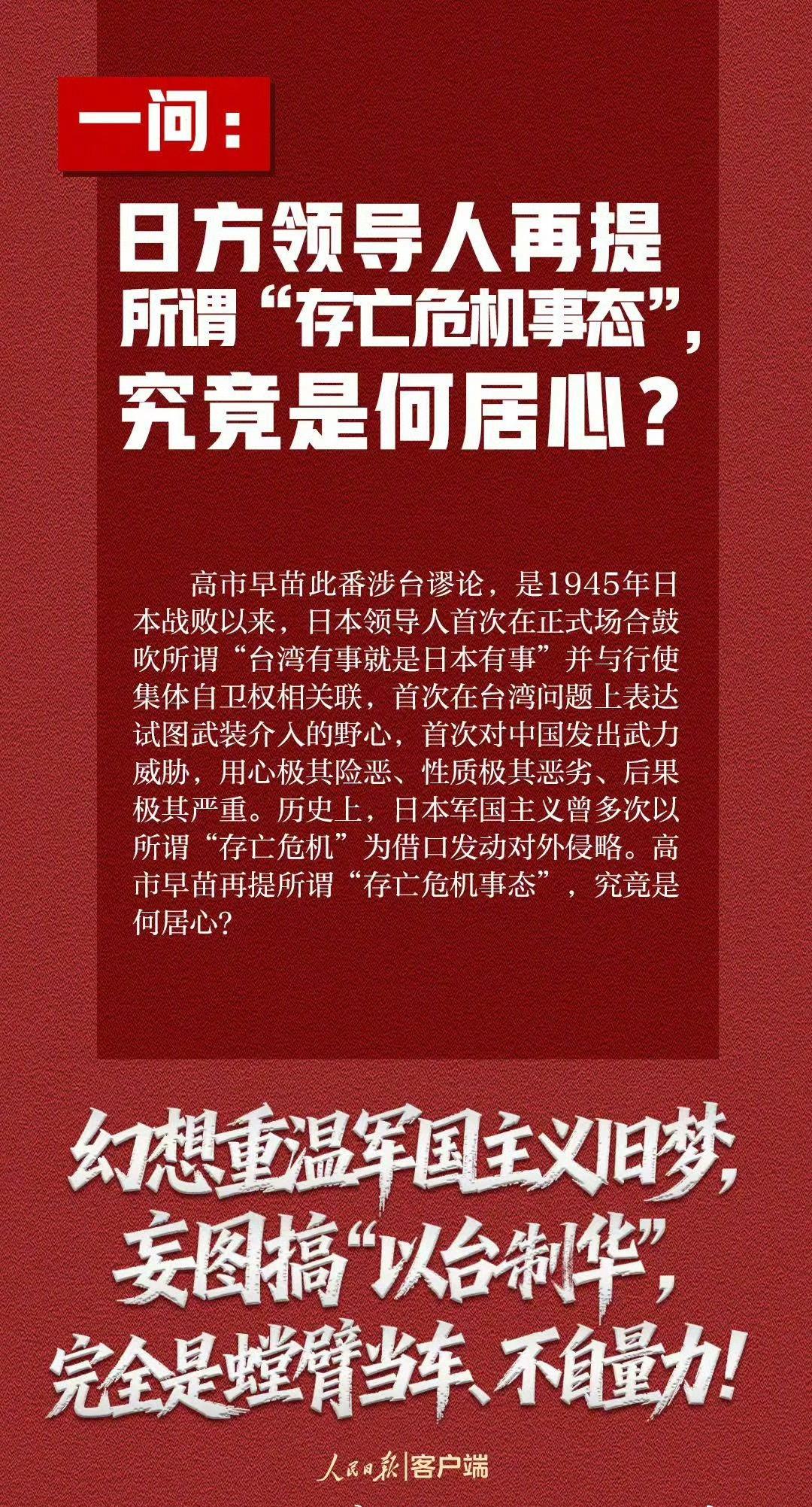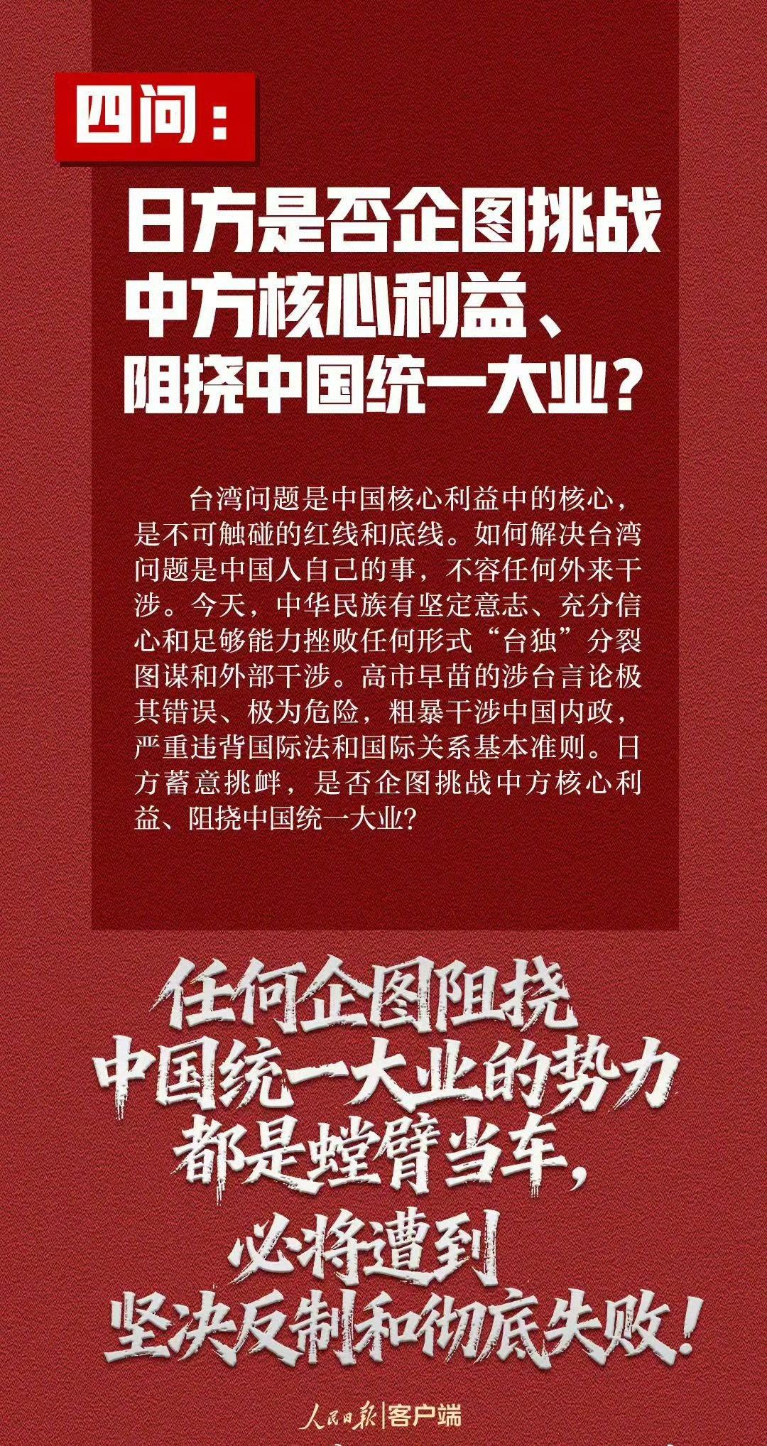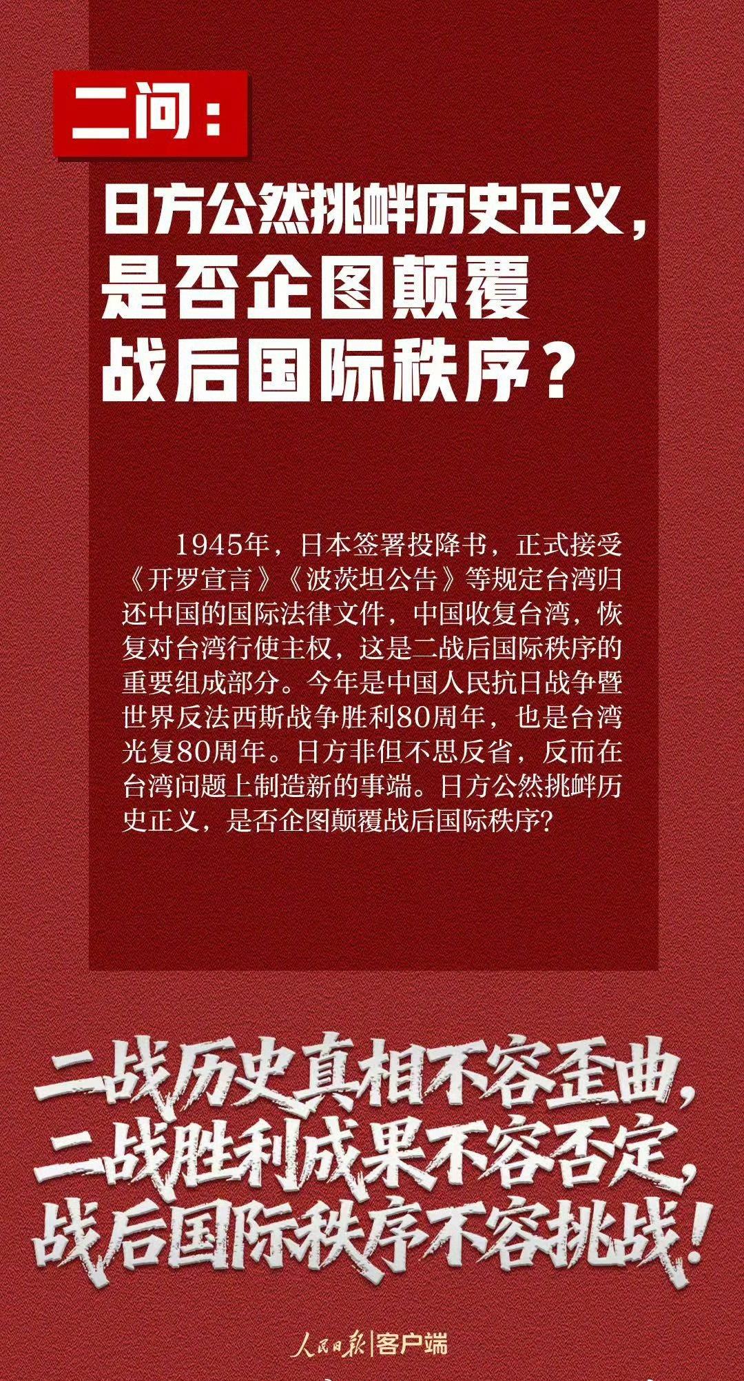【7个问题日方必须说清楚】在中方多次严正交涉后,日方仍不思悔改,拒不撤回错误言论。这种粗暴干涉中国内政、公然挑战二战后国际秩序的错误言论,引起举世哗然,令正义人士强烈愤慨。日方到底意欲何为?这些问题日方必须说清楚↓↓↓ (人民日报)